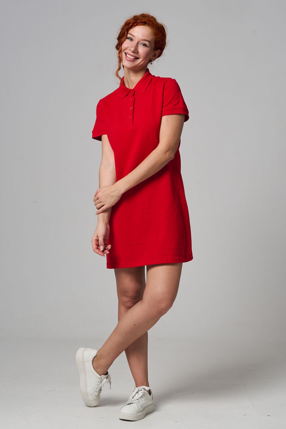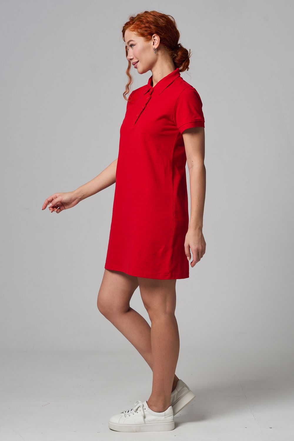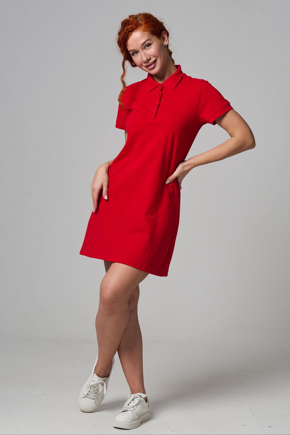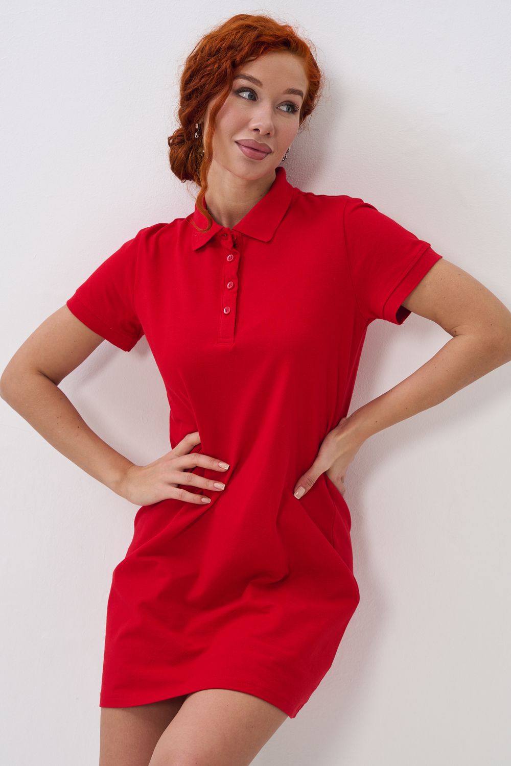Отличный вариант для жаркого лета - модное платье-поло. Платье имеет отложной ворот и короткий рукав. Кроме того, вверху имеются акцентные пуговицы в цвет платья. Комфортная длина чуть выше колена и прямой крой делает это платье универсальным. Стильное и модное платье подойдет женщинам и девушкам разных возрастов. Хлопок обладает свойствами воздухопроницаемости, что так необходимо в жаркую весеннюю или летнюю погоду. Это изделие прекрасно сочетается как со спортивной обувью, так с классическими туфлями и балетками. На более прохладную погоду можно создавать многослойные образы, сочетая платья с другой одеждой. Это отличный вариант на повседневную основу на работу в офис, прогулки или учебу. Благодаря достаточному свободному не обтягивающему прилеганию в области талии оно является максимально удобным и комфортным. Плотность 190гр/куб.м.