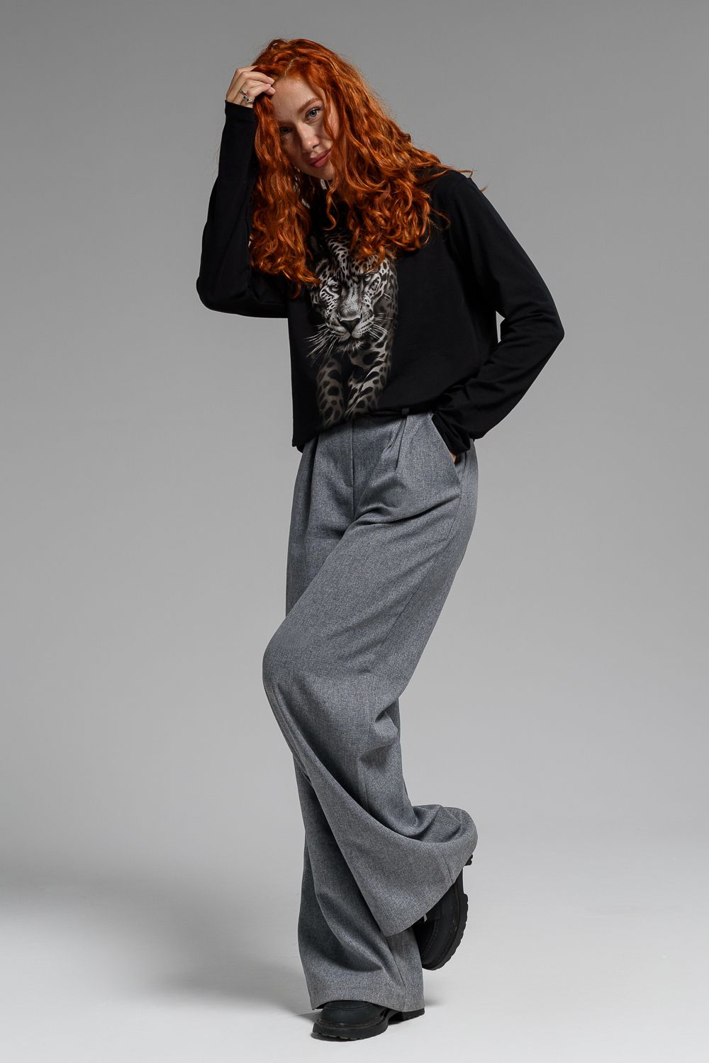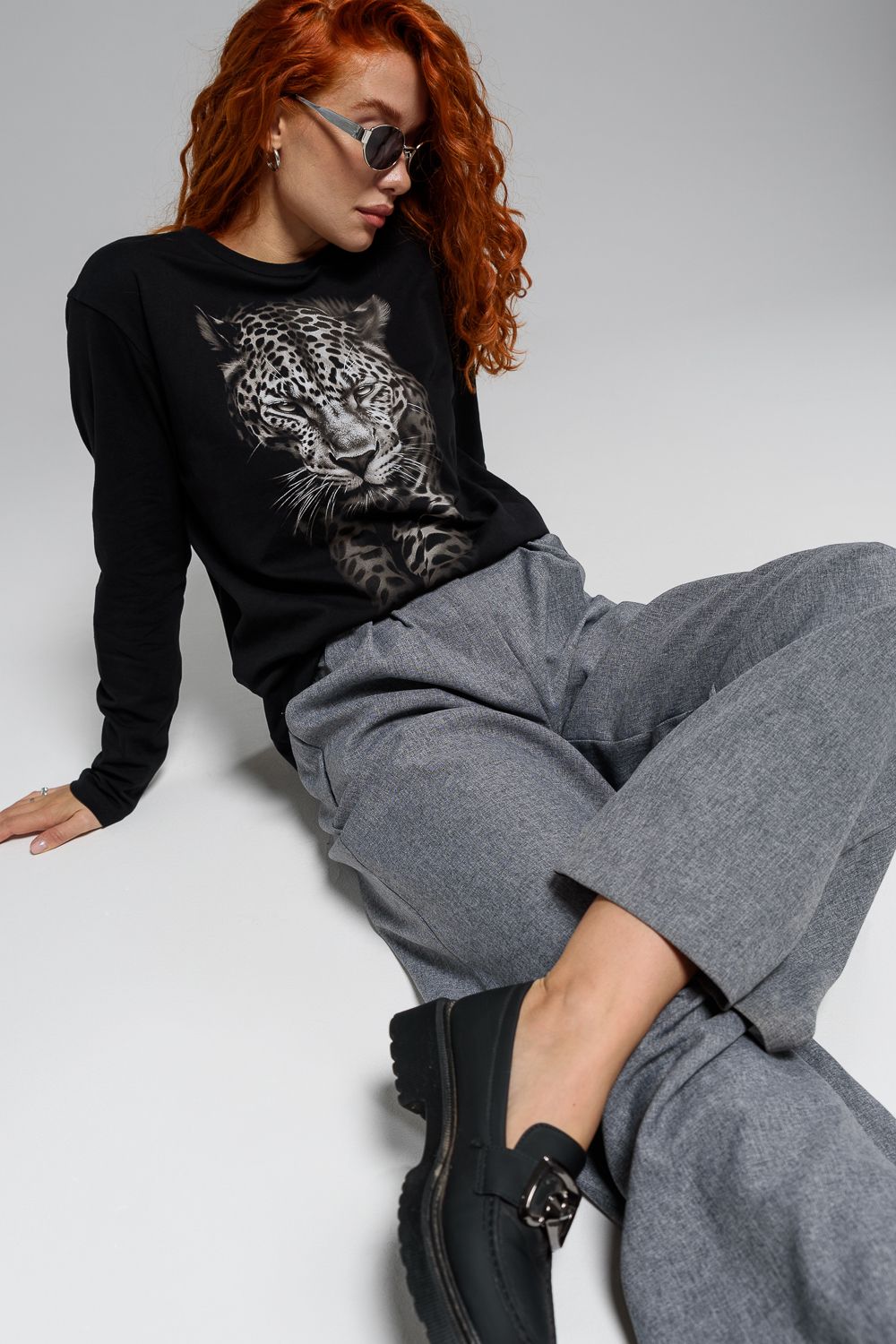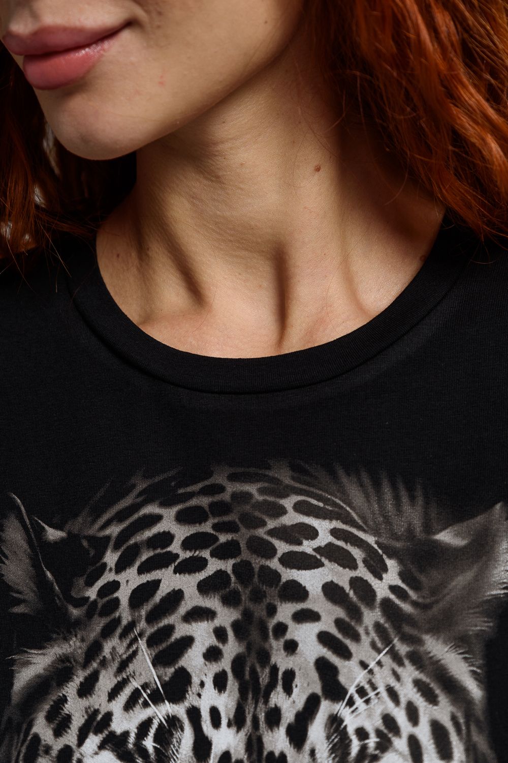 8513 Футболка с длинным рукавом женская - черный+леопард