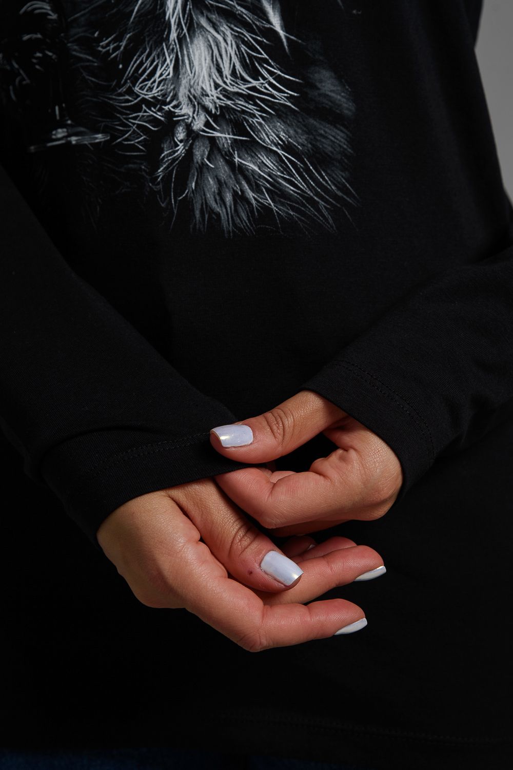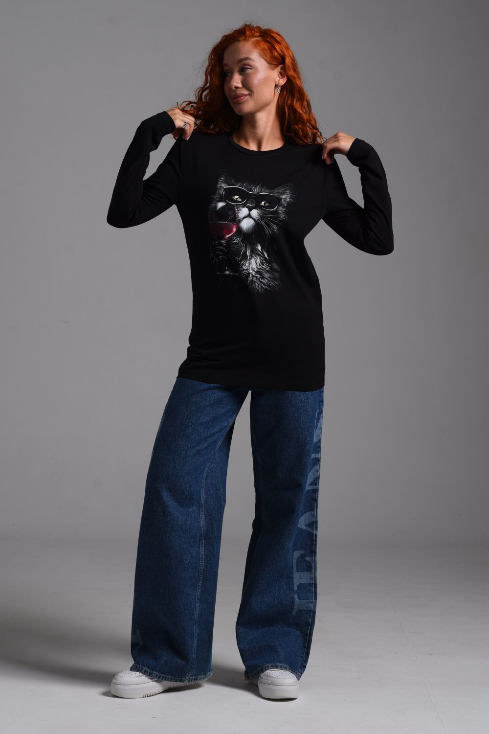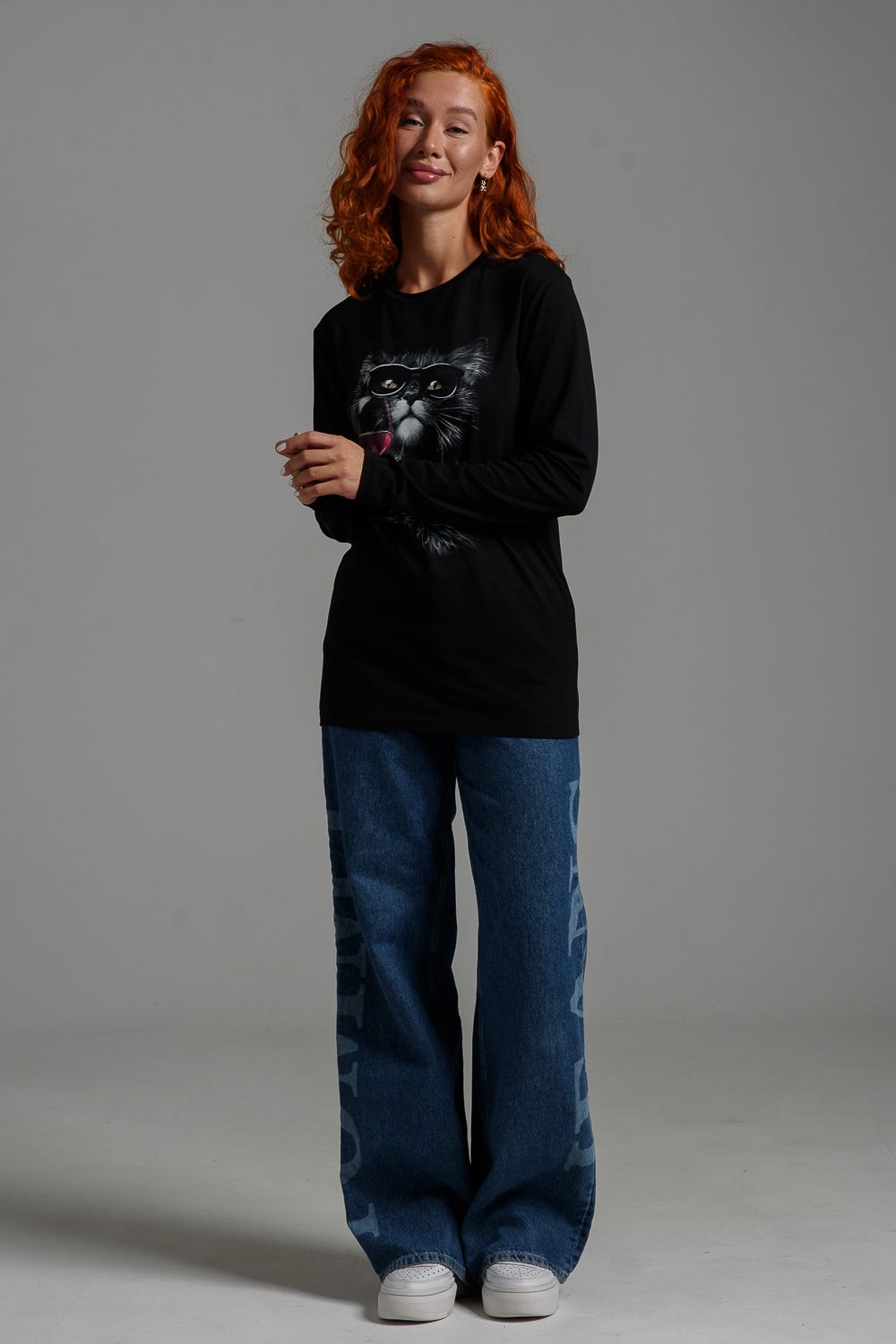 8541 Футболка с длинным рукавом женская - черный+кот с красным