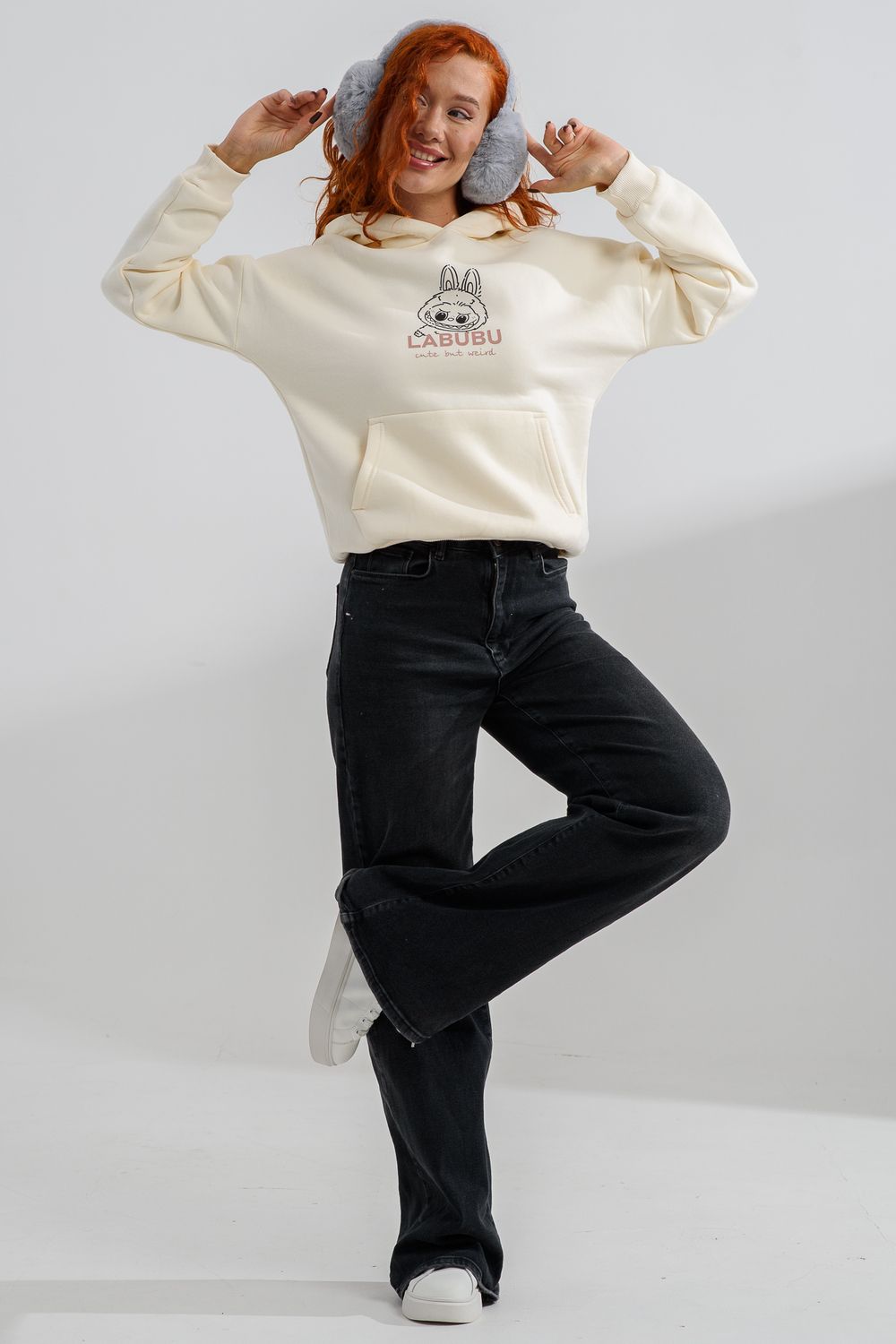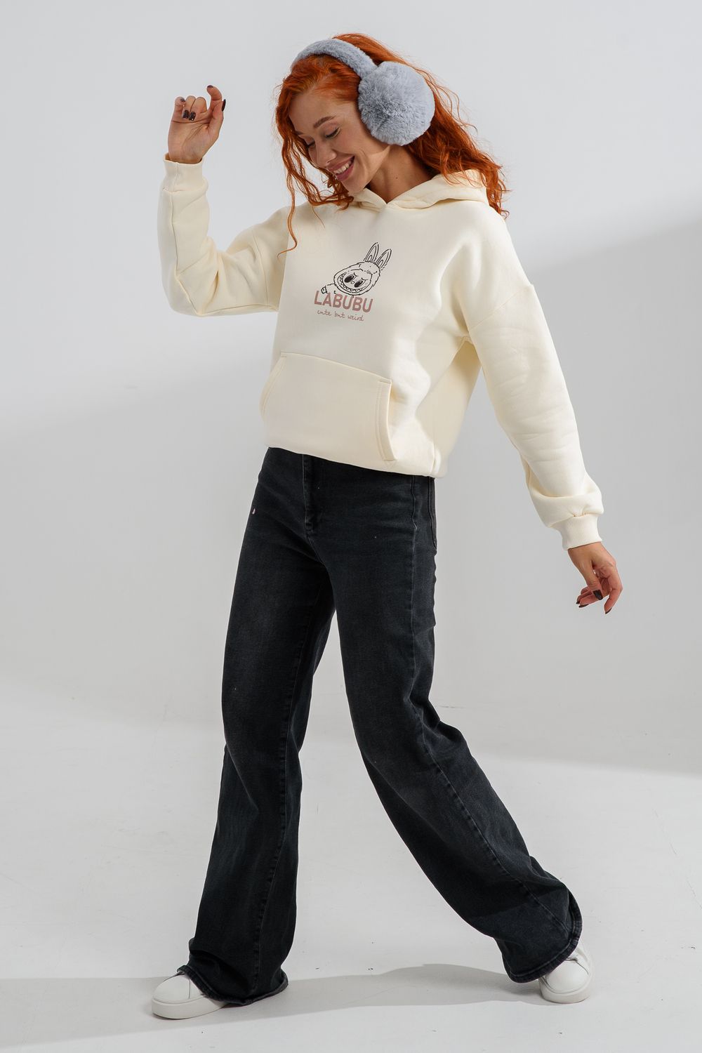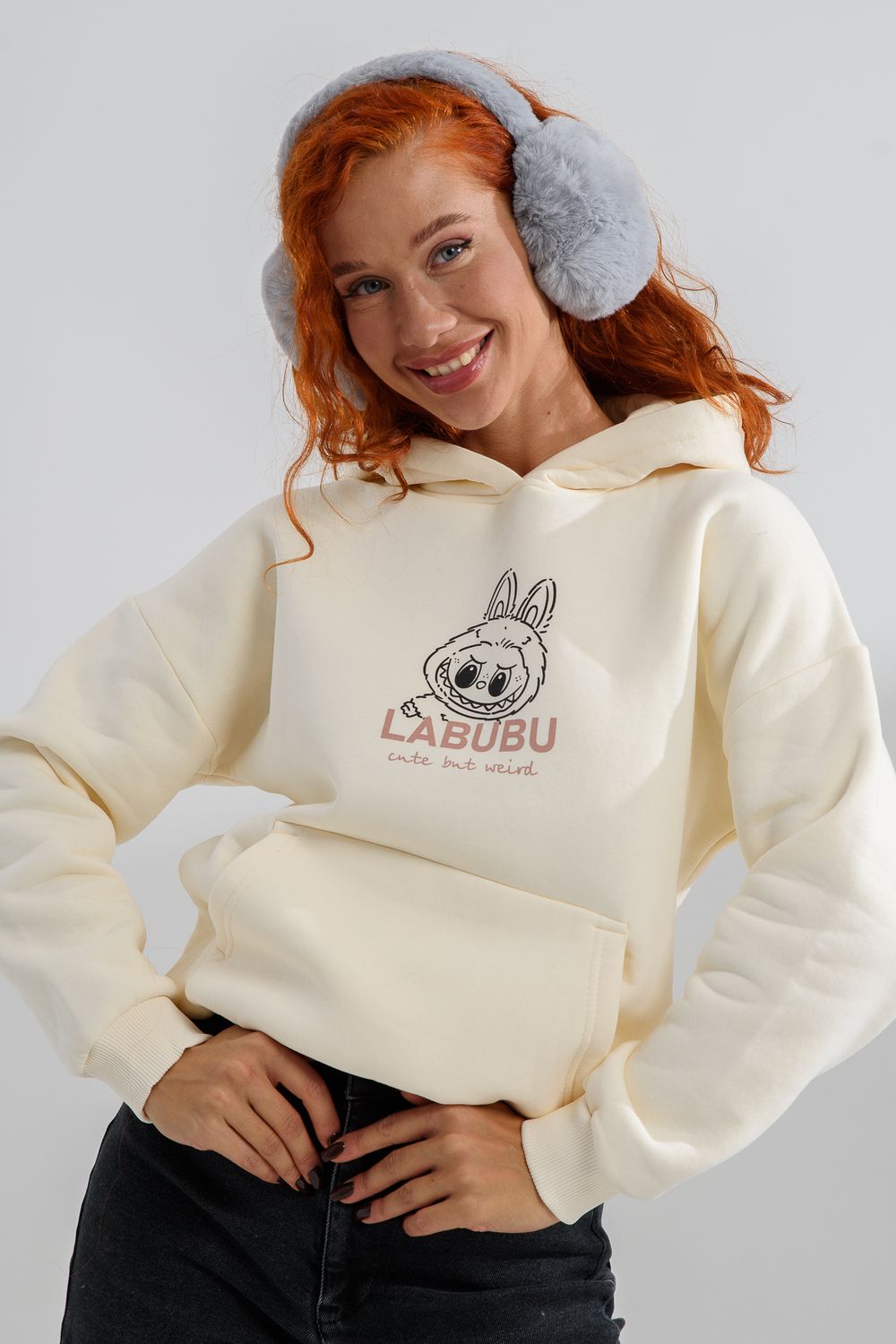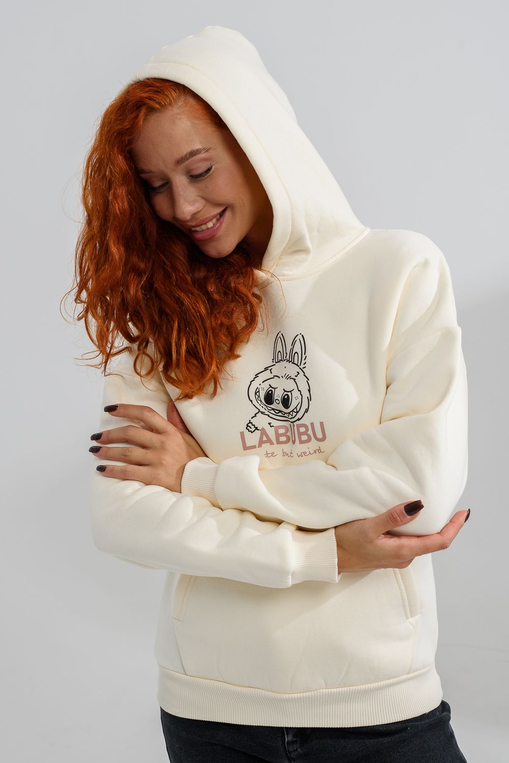 8565 толстовка женская оверсайз - молочный+лабубу