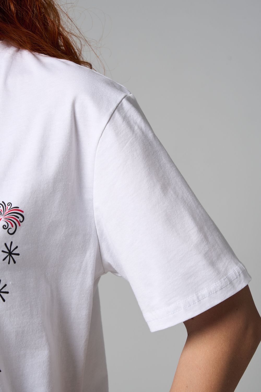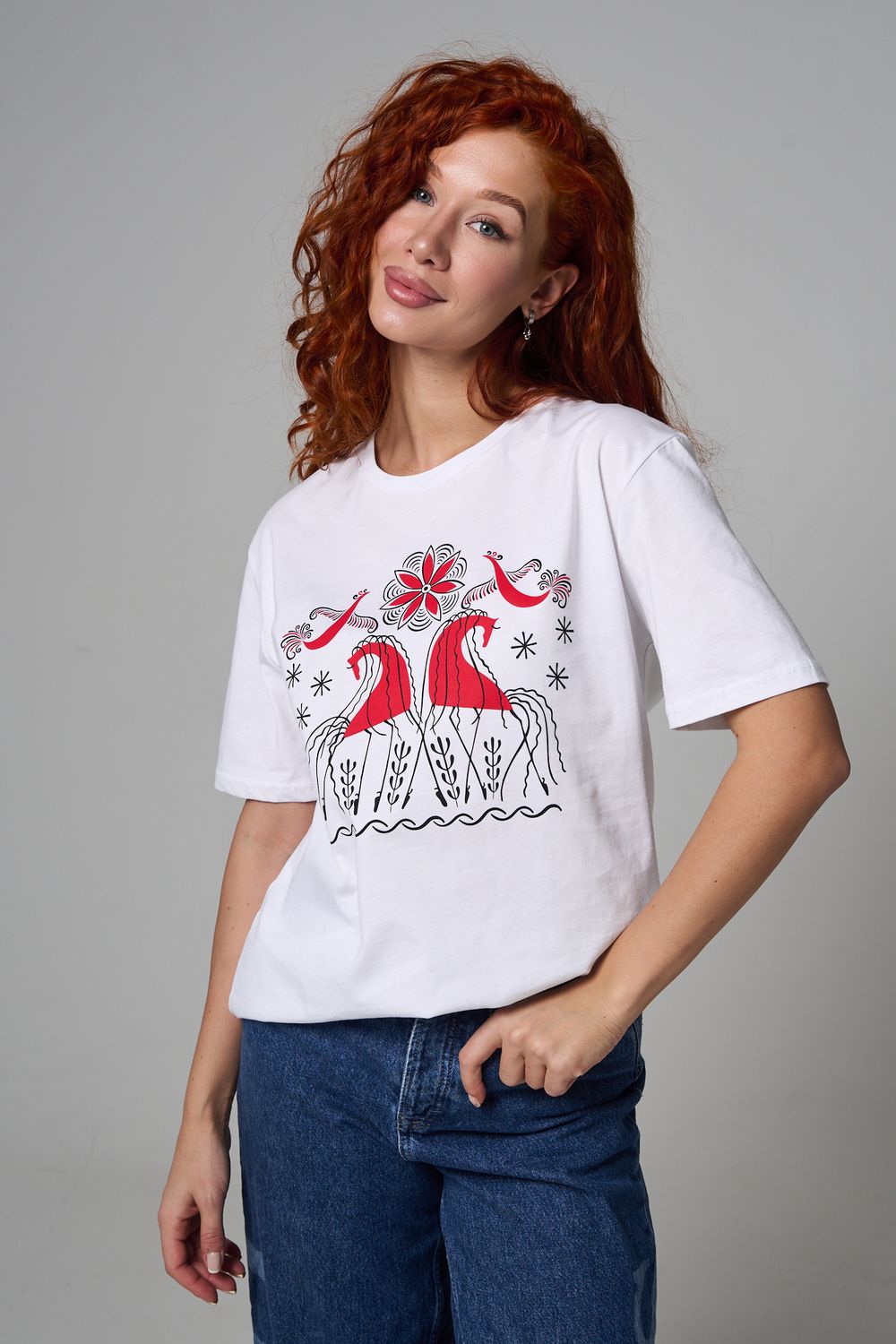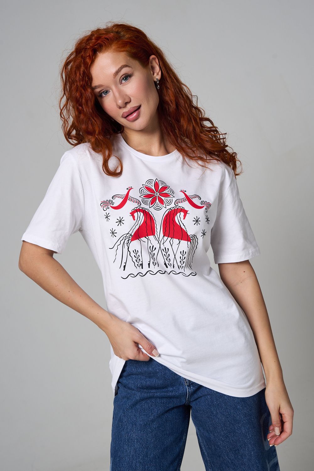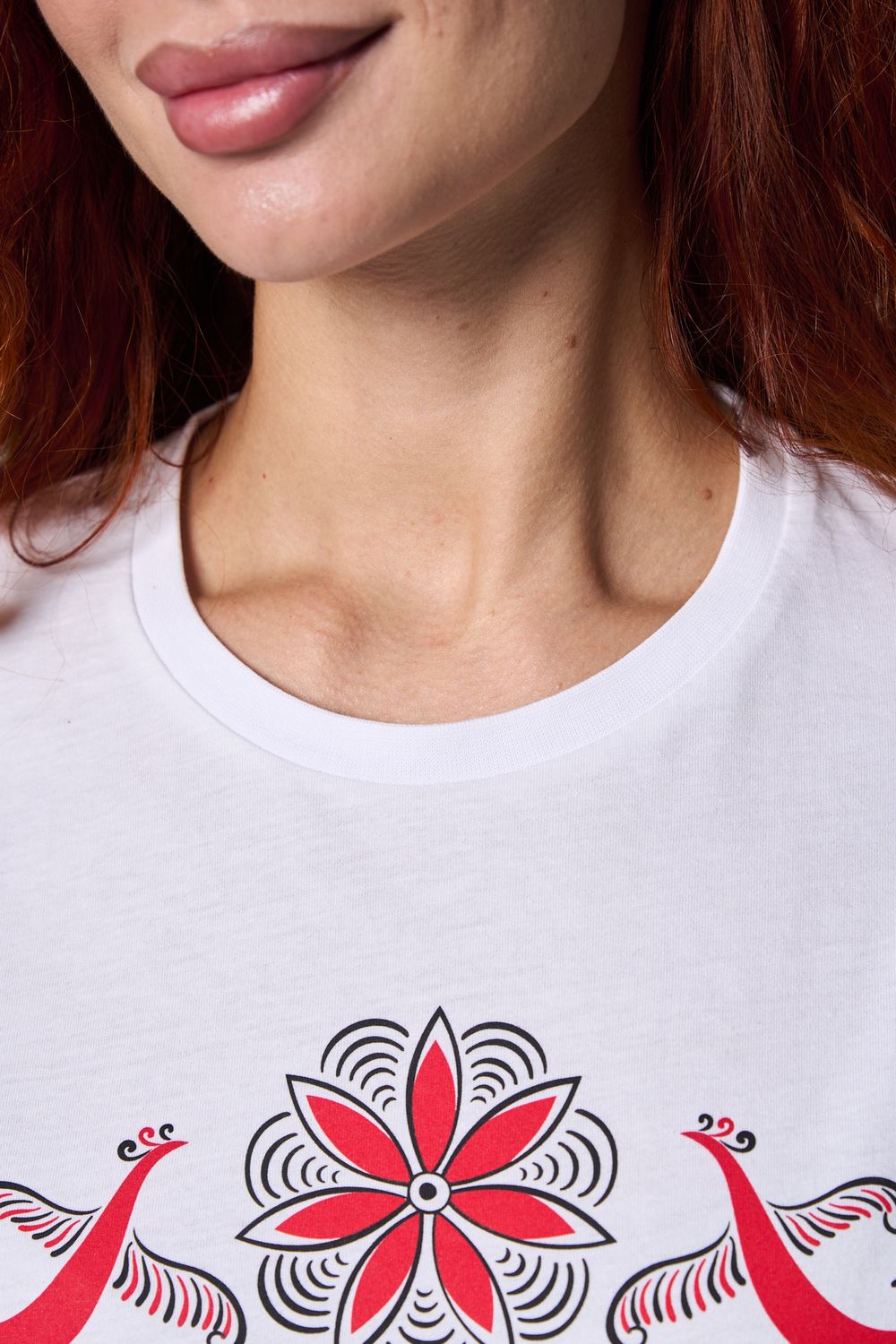 Хлопковая футболка с русским народным узором. Изготовлена из 100% высококачественного хлопка. Дышащая футболка гарантирует комфорт в течение всего дня, а прочный материал долго сохраняет форму и яркость принта.