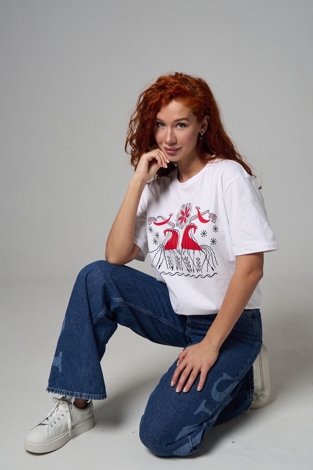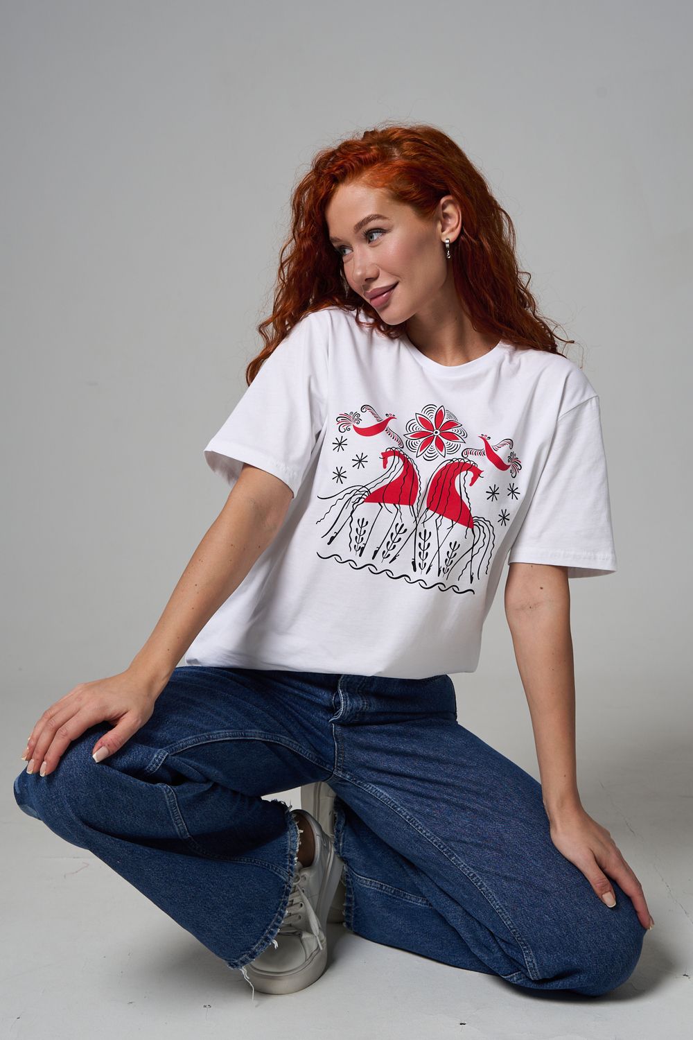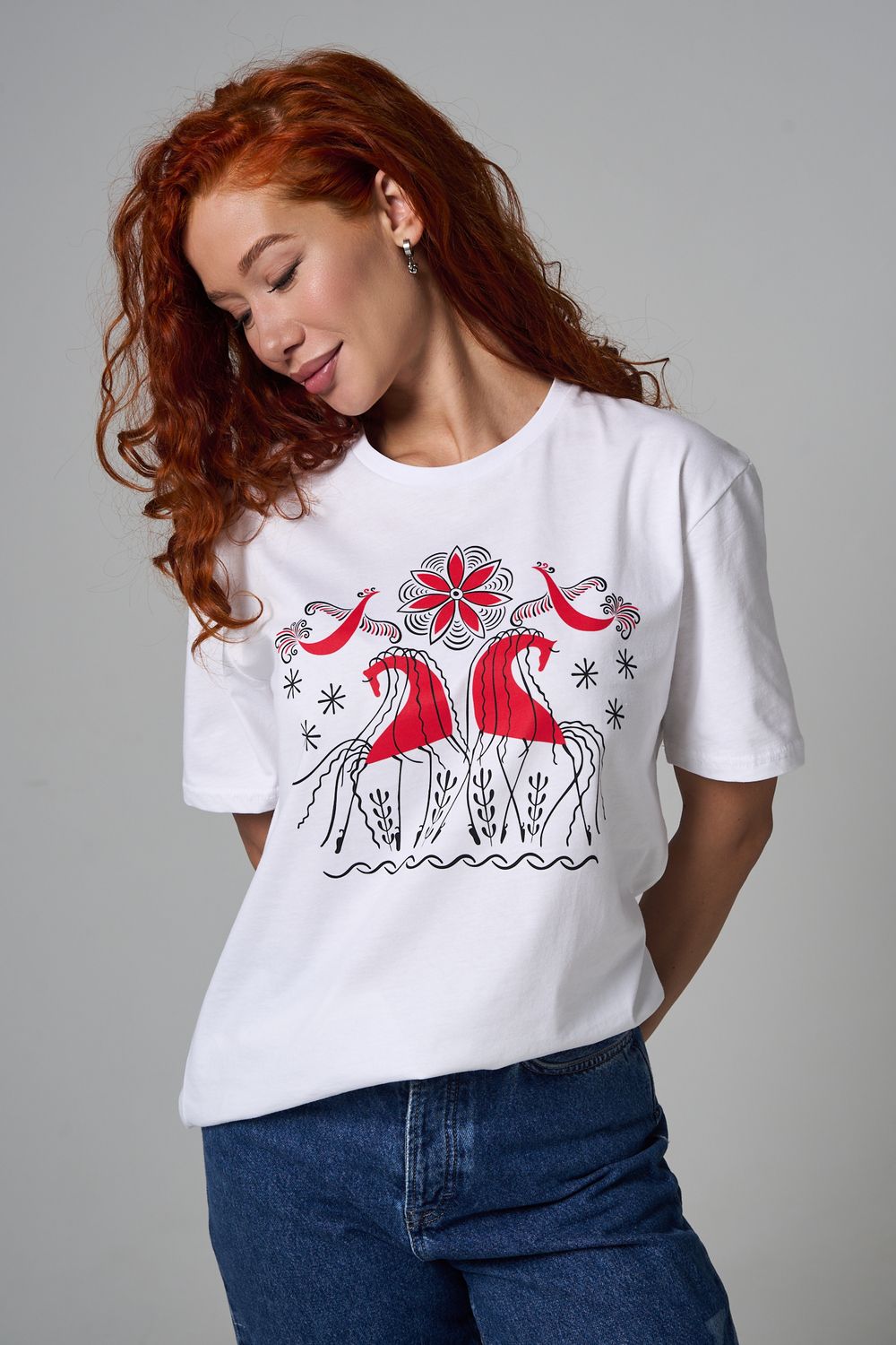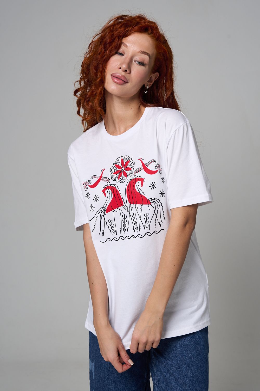 Хлопковая футболка с русским народным узором. Изготовлена из 100% высококачественного хлопка. Дышащая футболка гарантирует комфорт в течение всего дня, а прочный материал долго сохраняет форму и яркость принта.
