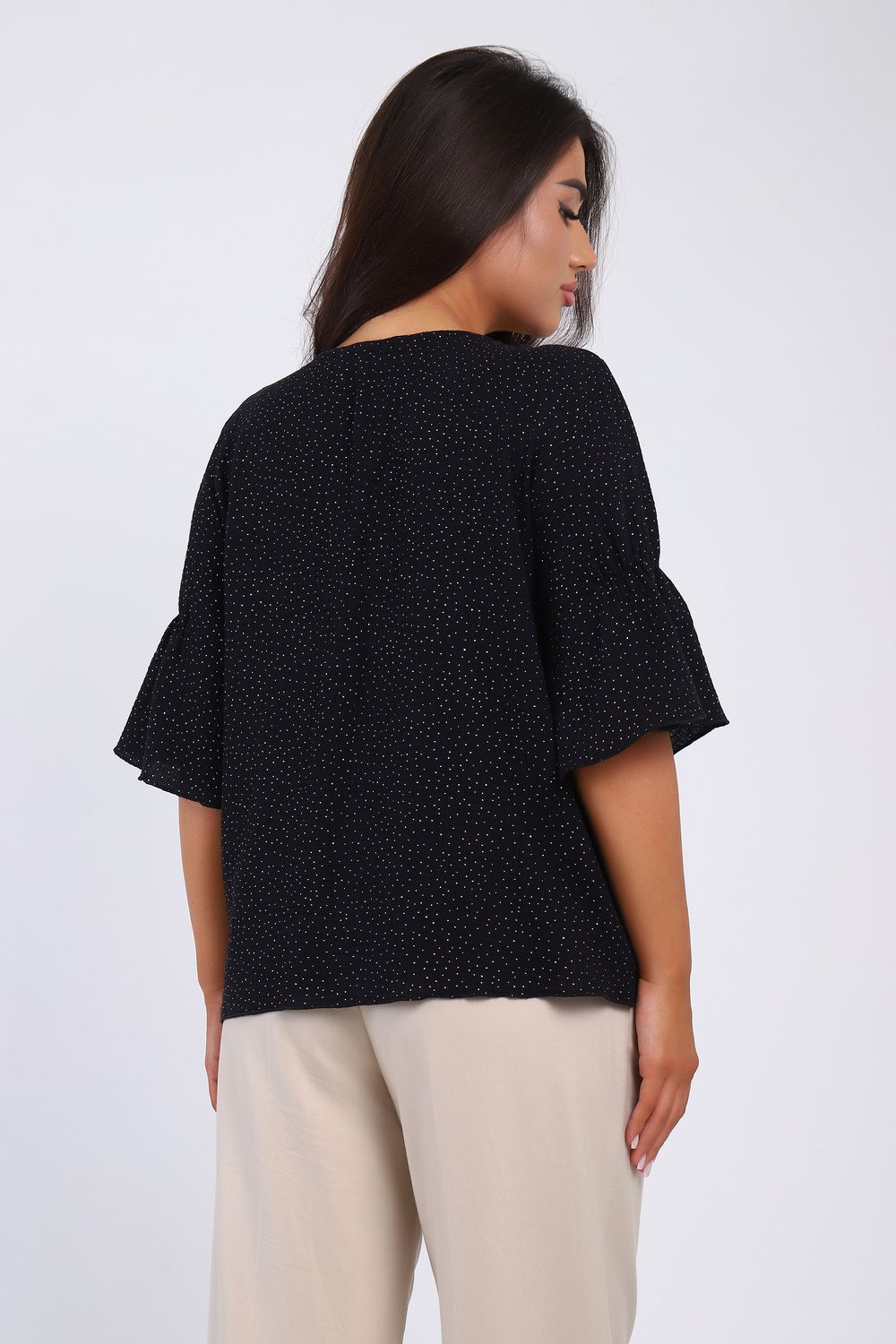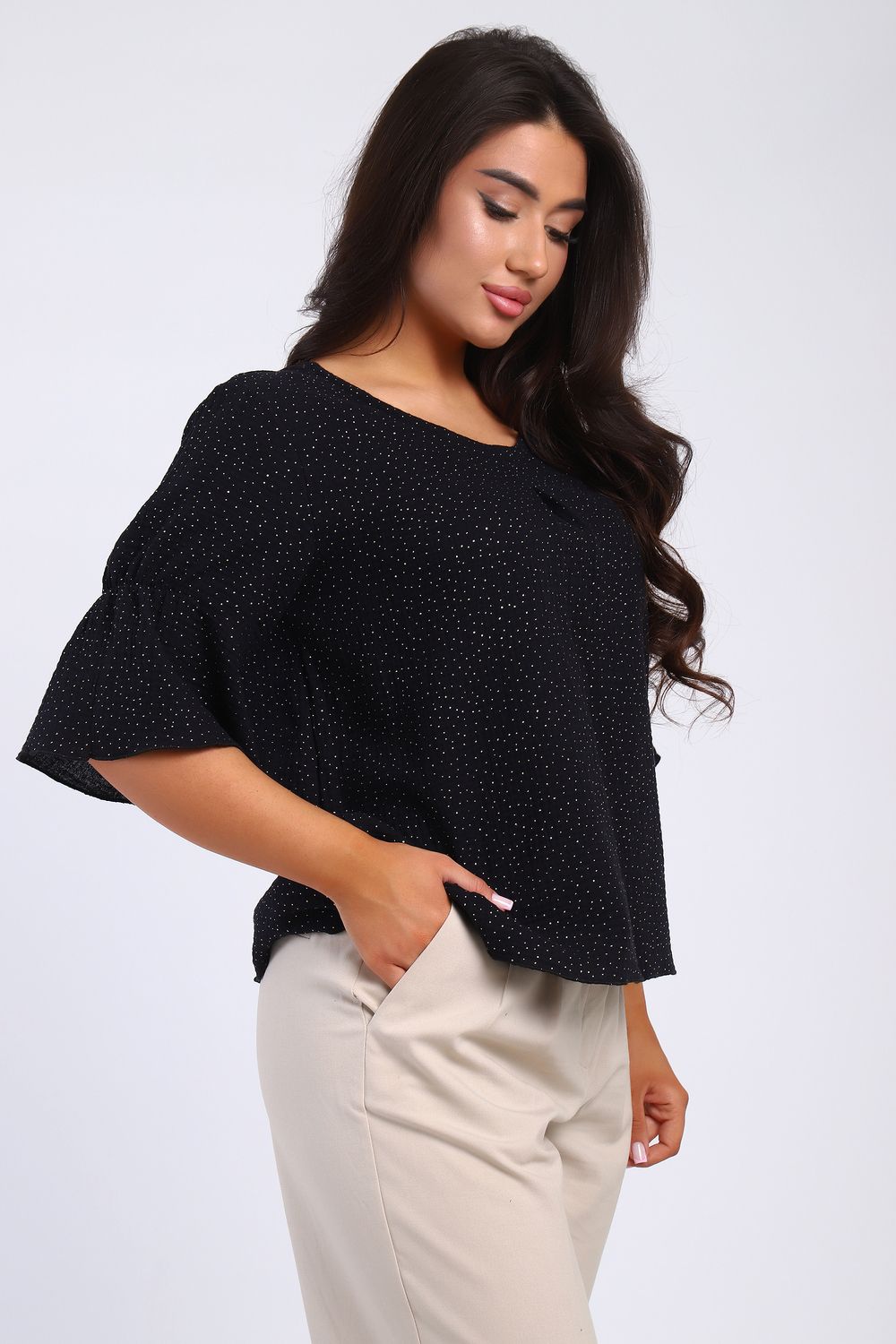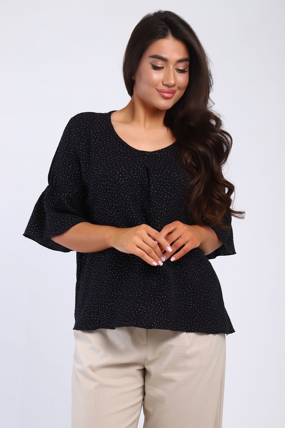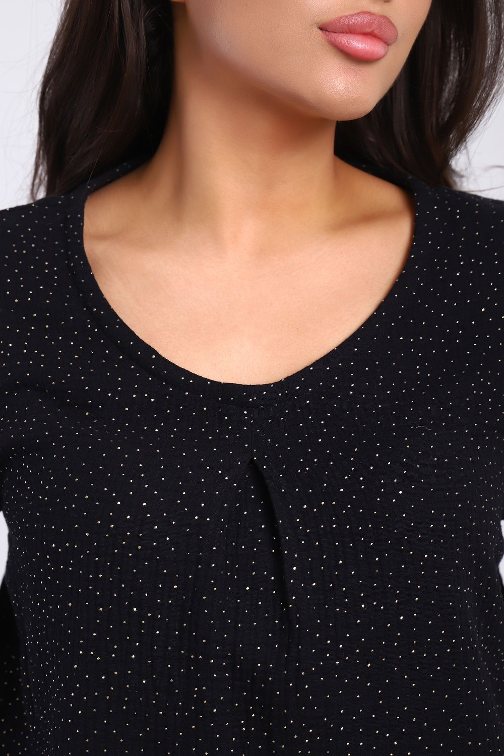 Настоящая находка для любителей натуральных тканей - очаровательная легкая блузка из муслина. Свободный крой блузки дополняют расклешенные рукава, присборенные на резинку по центру. Горловина округлая, окантованная косой бейкой, в центре застрочена встречная складка. Длина изделия до середины бедра. Низ блузки и низ рукавов обработаны на краевом оверлоке. Невесомая и воздушная блузка подойдет и для прогулок в жаркую погоду, и для работы в офисе. Черная ткань имеет золотистые вкрапления, что делает блузку очень эффектной. Стирать данную вещь рекомендуем вручную, утюжить только с изнаночной стороны.