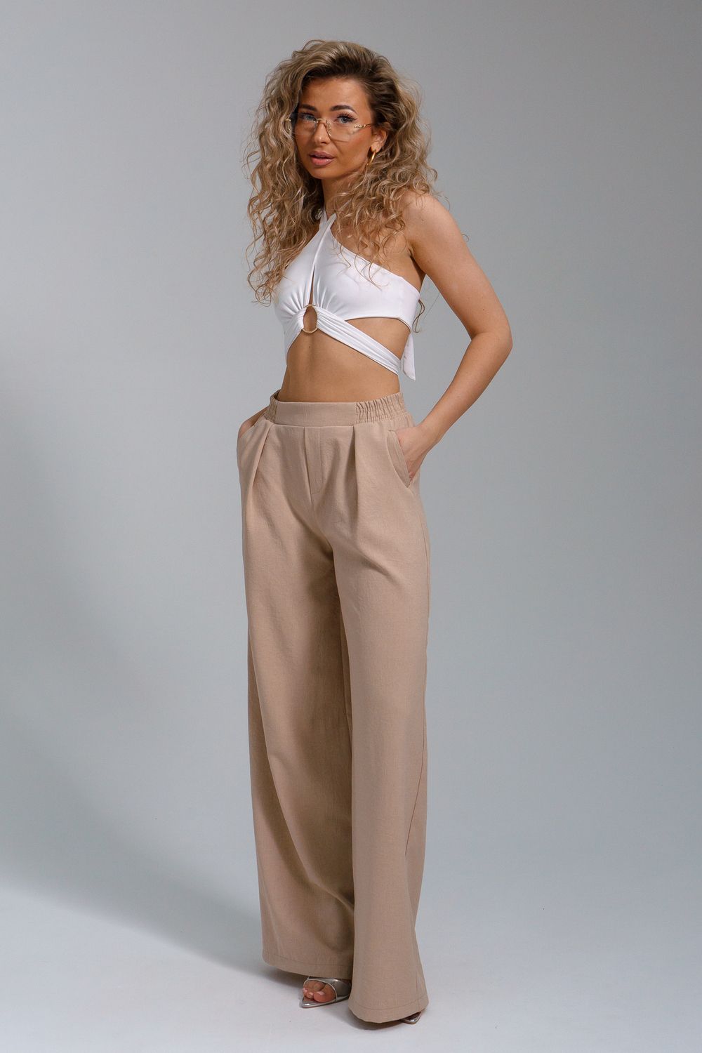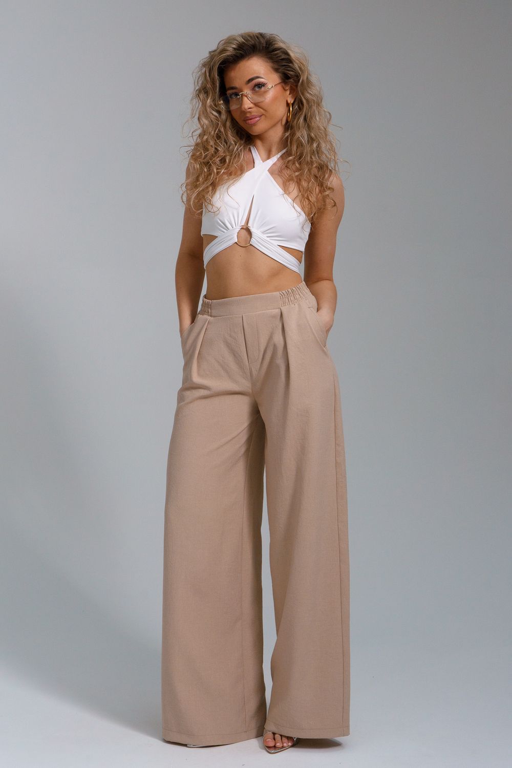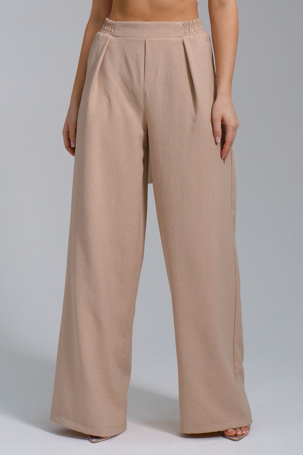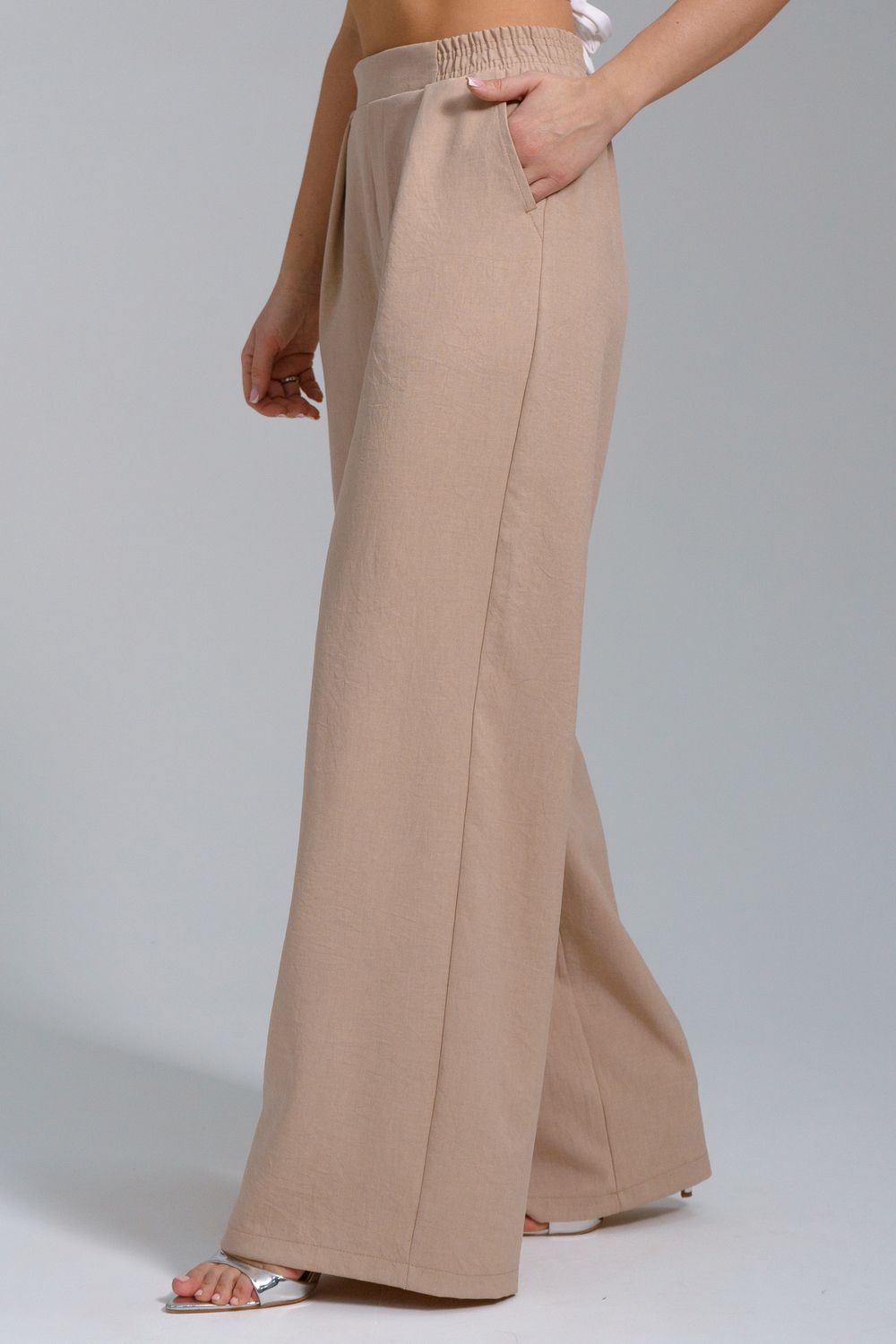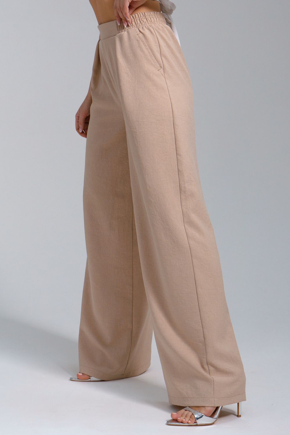 Брюки-палаццо – мастхэв базового женского гардероба. Модель выполнена из качественной льняной ткани. Материал прочный, приятный на ощупь, хорошо струится и дышит. Изделие представлено в классических модных цветах. Широкий крой со складками и высокой талией создает красивый силуэт и обеспечивает удобную посадку, на любой тип фигуры. Пояс выполнен на специализированной поясной машине, что добавляет изделию качество на долгое время и эстетичность. На брюках имеются боковые карманы с усиленными закрепками на закрепочной машине. На модели представлен 46 размер - фигура соответствует параметрам размера. УХОД ЗА ИЗДЕЛИЕМ: бережная стирка при максимальной температуре 30ºС, не отбеливать, машинная сушка запрещена, глажение при 110ºС, профессиональная сухая чистка, стирать вывернутым наизнанку, глажение с использованием специальной сетки, стирать с изделиями похожих цветов . Брюки такого плана идеально впишутся в городской стиль, элегантность и комфорт, женственные силуэты и мягкие линии, расслабленные, нарочито небрежные образы, стильные и комфортные. Широкие брюки со складками – модная одежда для женщин на любой случай жизни. Подойдут для стильных повседневных луков, офисных аутфитов, нарядных вечерних образов и прогулок.