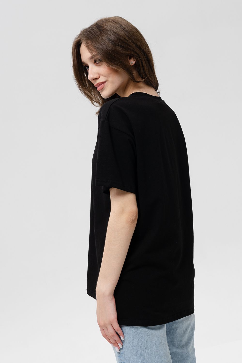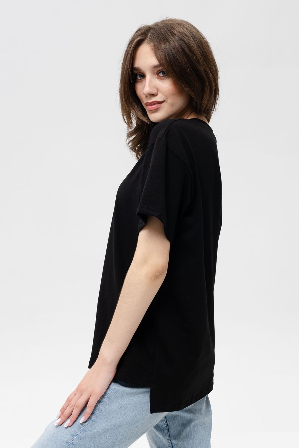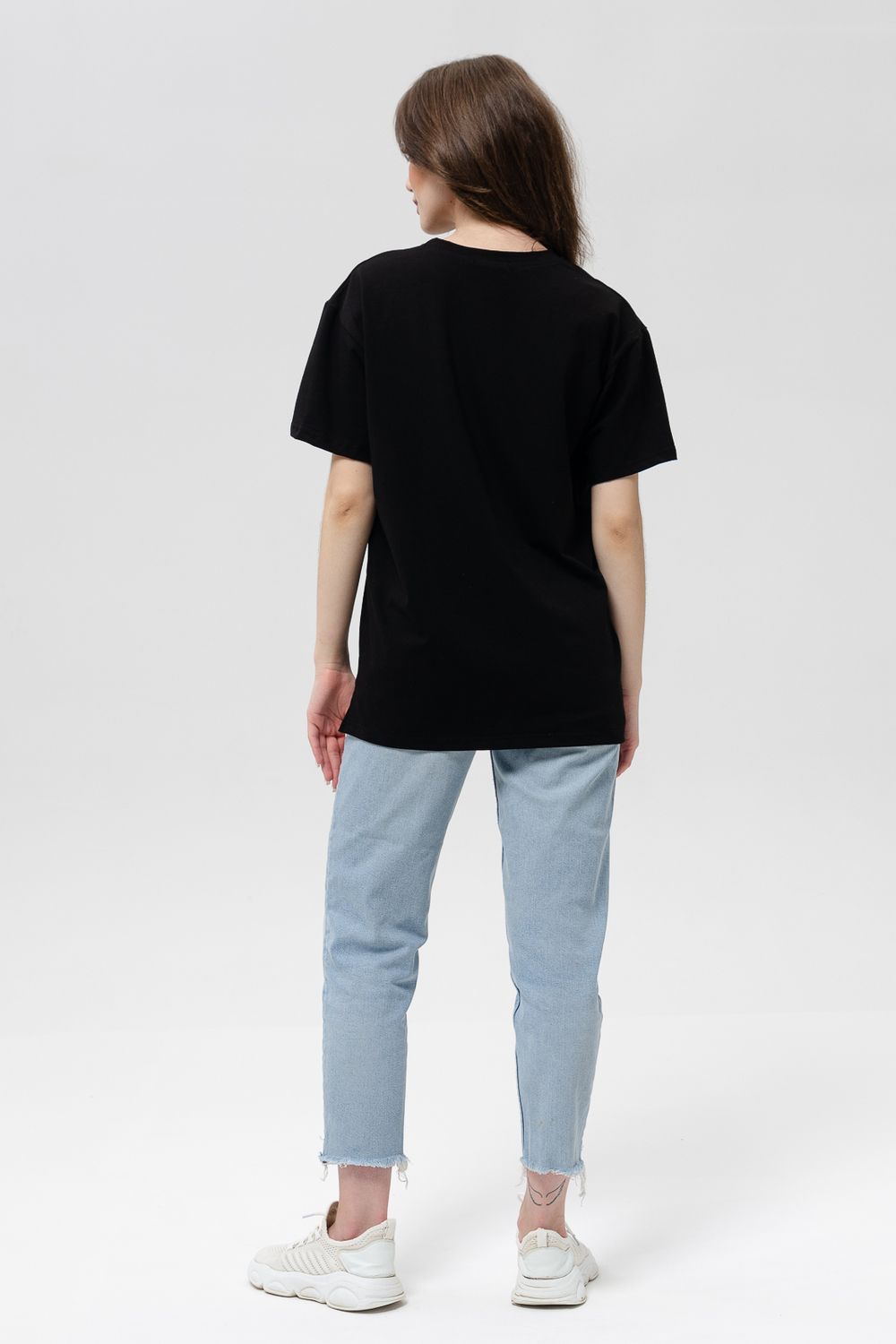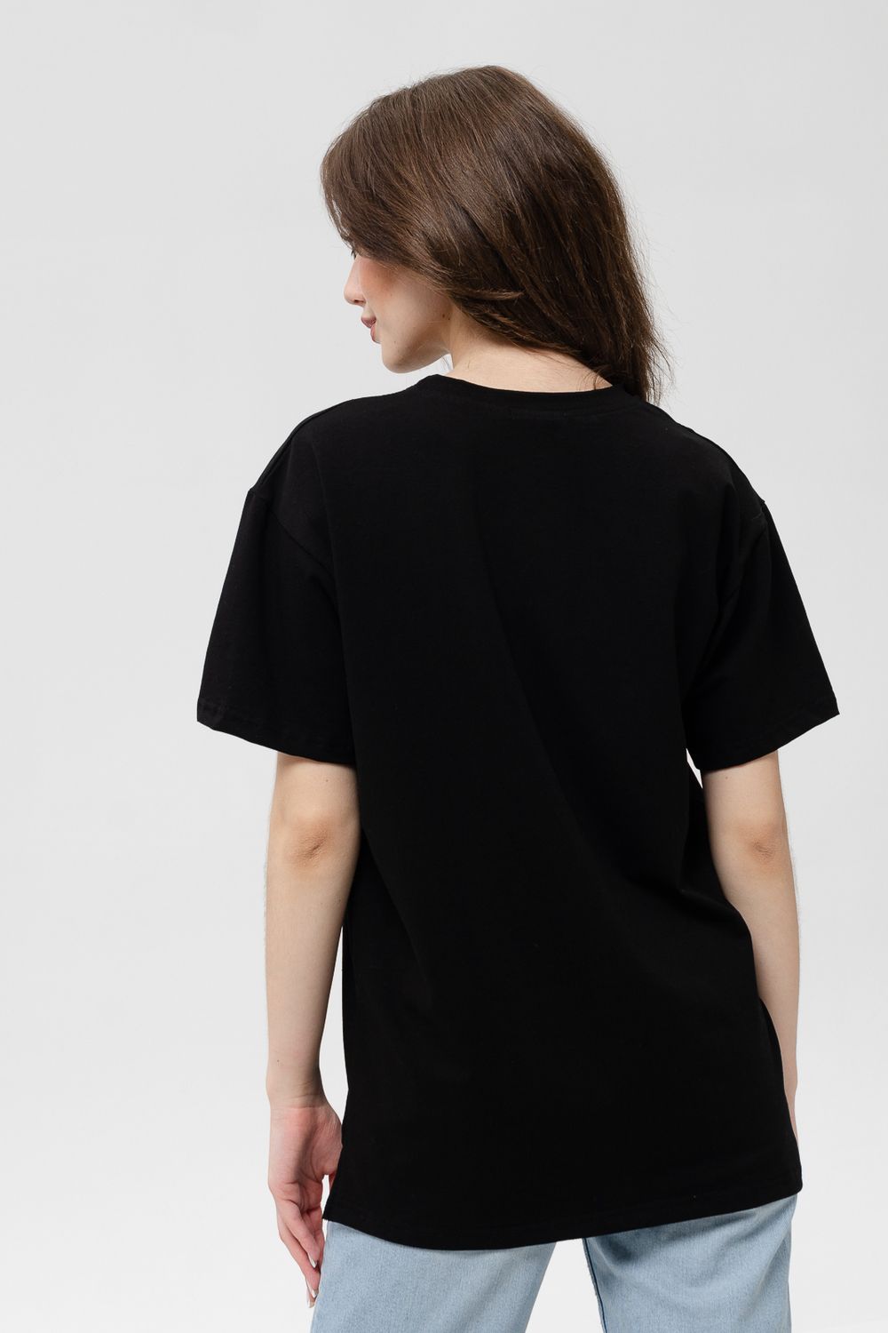 Футболка женская оверсайз свободного кроя со спущенным плечом. Модель выполнена из трикотажа, тактильно приятна к телу и не просвечивает. Футболка подходит для любого типа фигуры, так как имеет свободный крой. Свободную футболку можно сочетать с джинсами, джоггерами и юбками. Ткань футболок долгое время сохраняет свои первоначальные свойства.