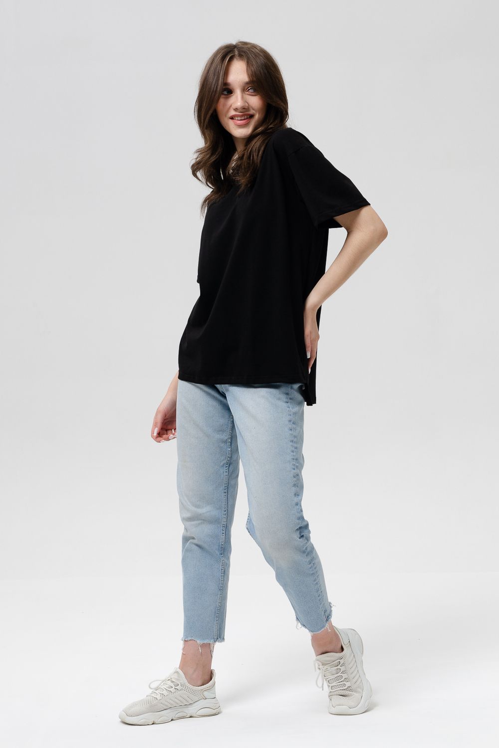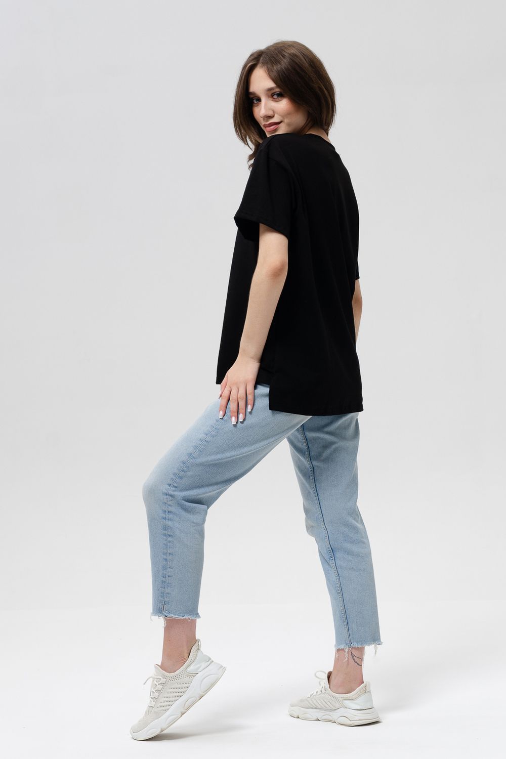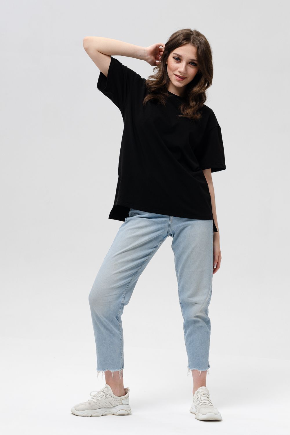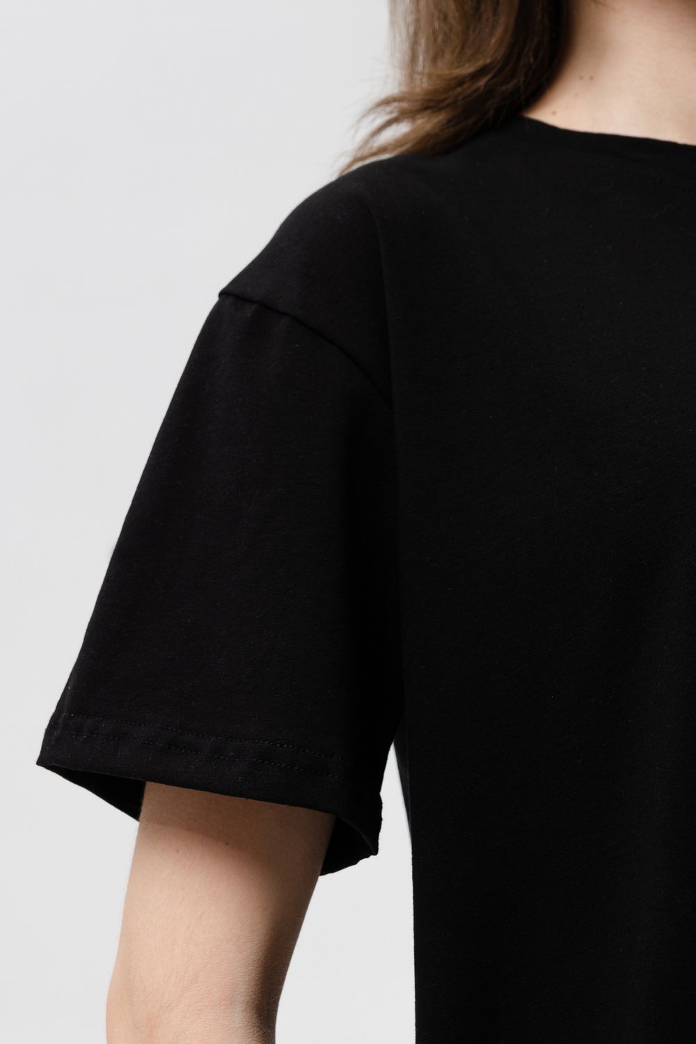 Футболка женская оверсайз свободного кроя со спущенным плечом. Модель выполнена из трикотажа, тактильно приятна к телу и не просвечивает. Футболка подходит для любого типа фигуры, так как имеет свободный крой. Свободную футболку можно сочетать с джинсами, джоггерами и юбками. Ткань футболок долгое время сохраняет свои первоначальные свойства.