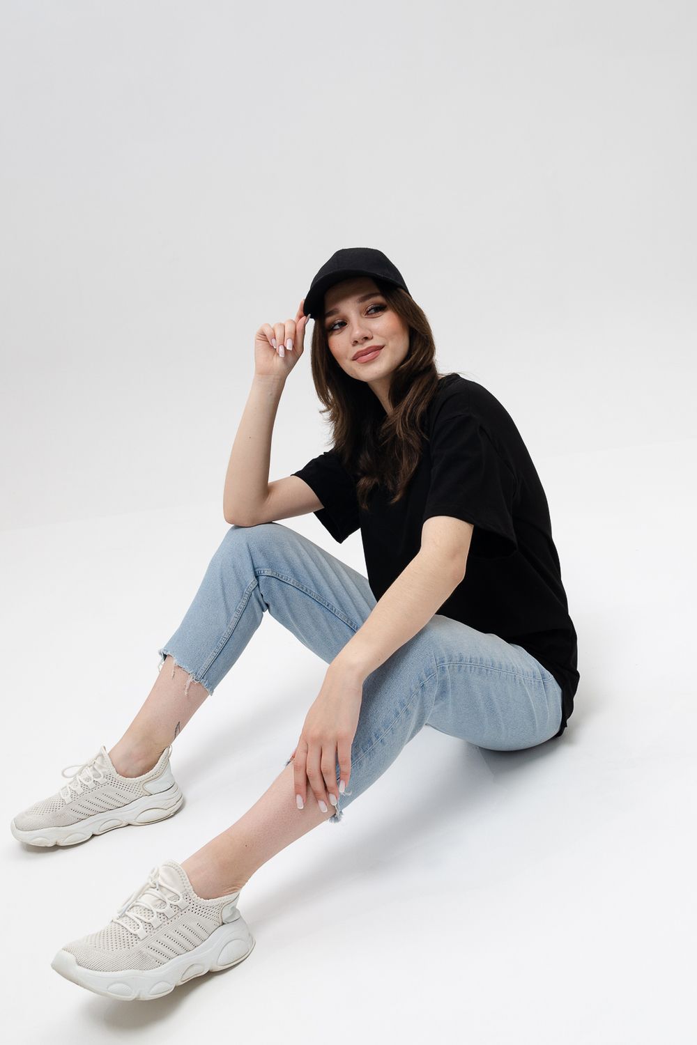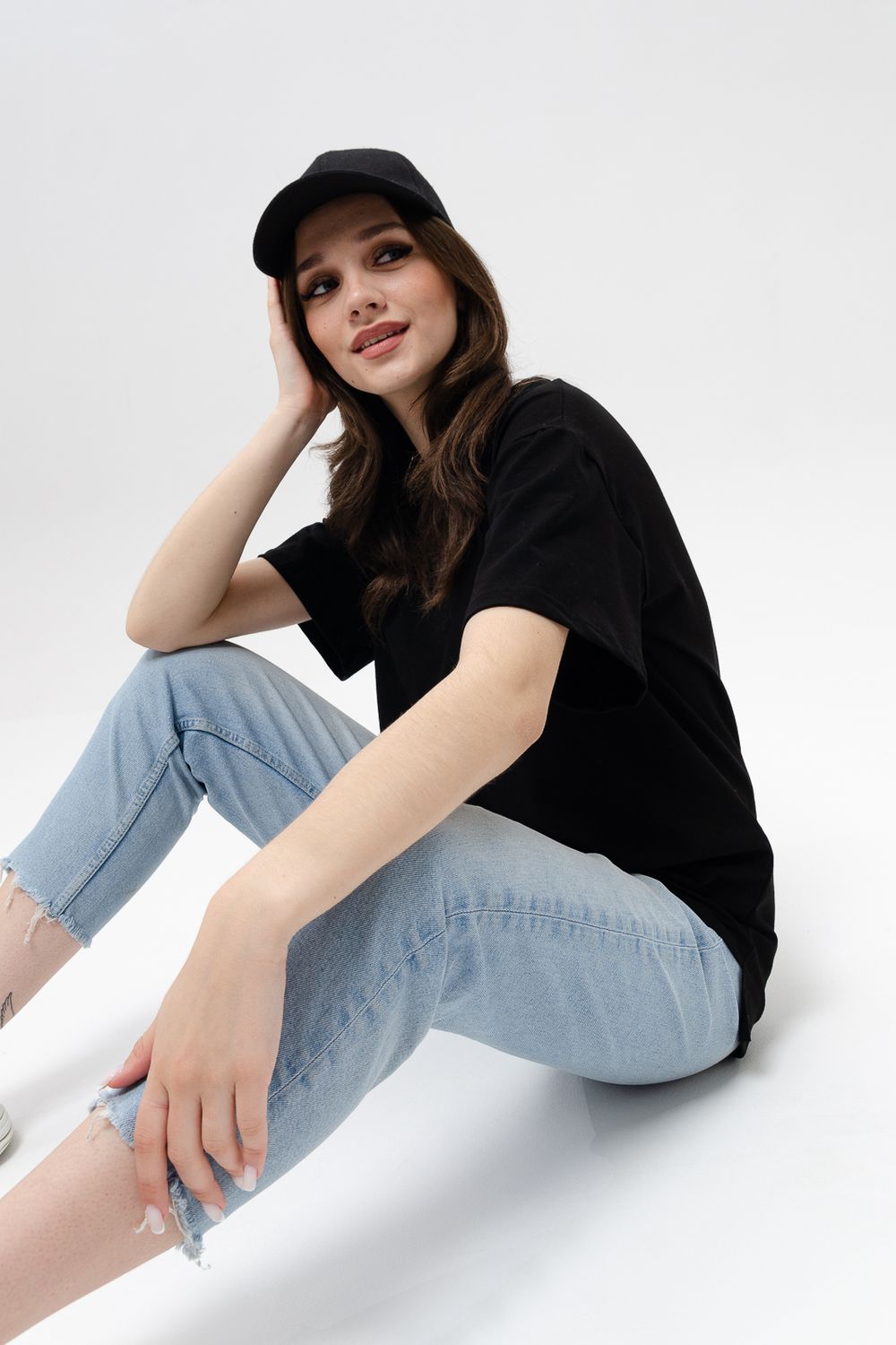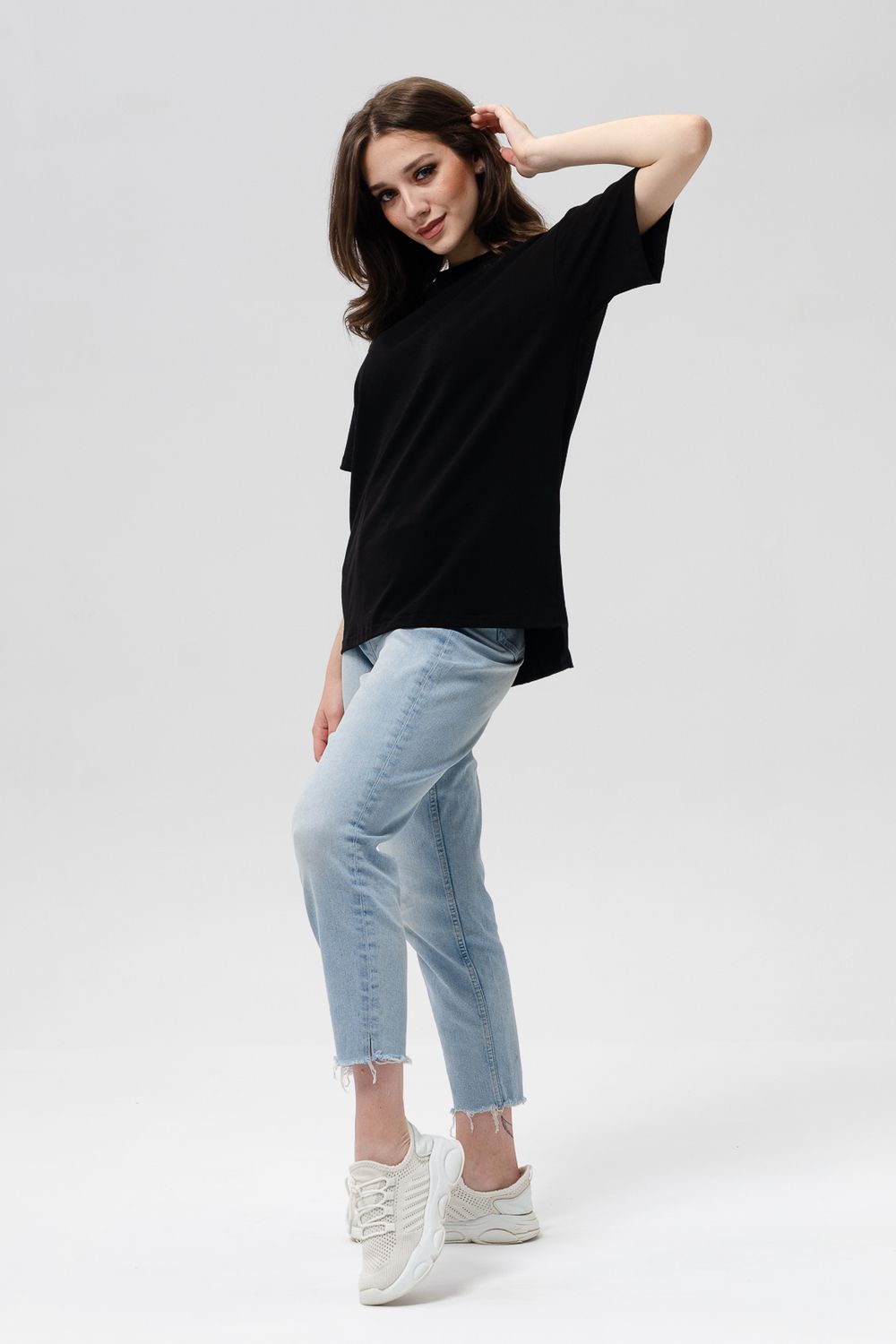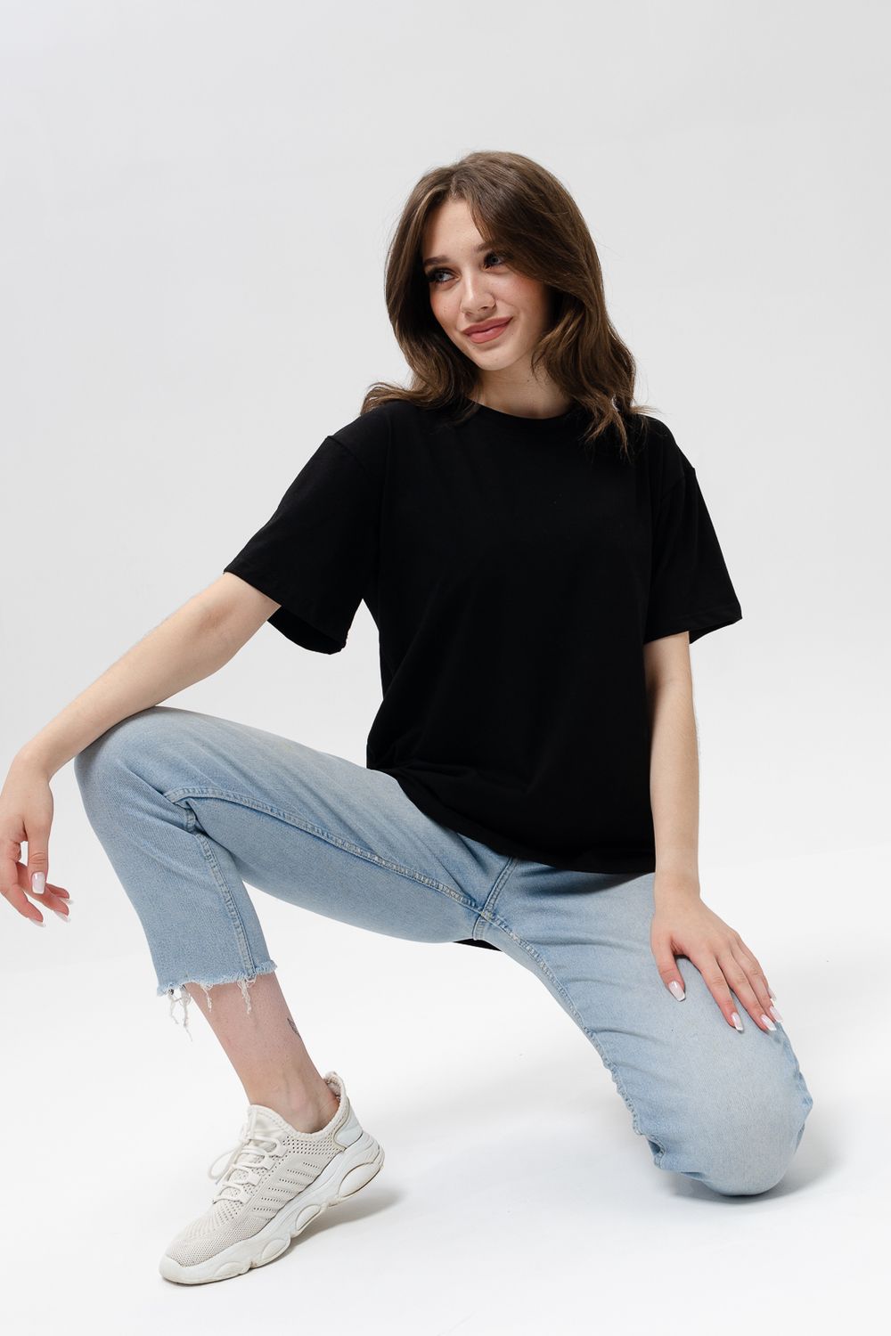 Футболка женская оверсайз свободного кроя со спущенным плечом. Модель выполнена из трикотажа, тактильно приятна к телу и не просвечивает. Футболка подходит для любого типа фигуры, так как имеет свободный крой. Свободную футболку можно сочетать с джинсами, джоггерами и юбками. Ткань футболок долгое время сохраняет свои первоначальные свойства.