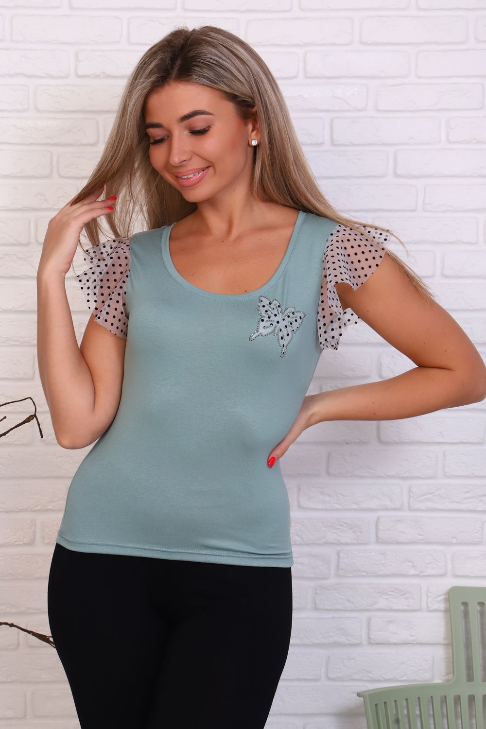 Футболка выполнена из вискозы: 95% вискоза, 5% лайкра, 210 - плотность. На данной модели имеется декоративный элемент в виде бабочки из сетки и страз на груди. Футболка прилегающая, на рукавах воланы из сетки. Такая модель подойдет всем, подчеркнет достоинства и скроет недостатки.