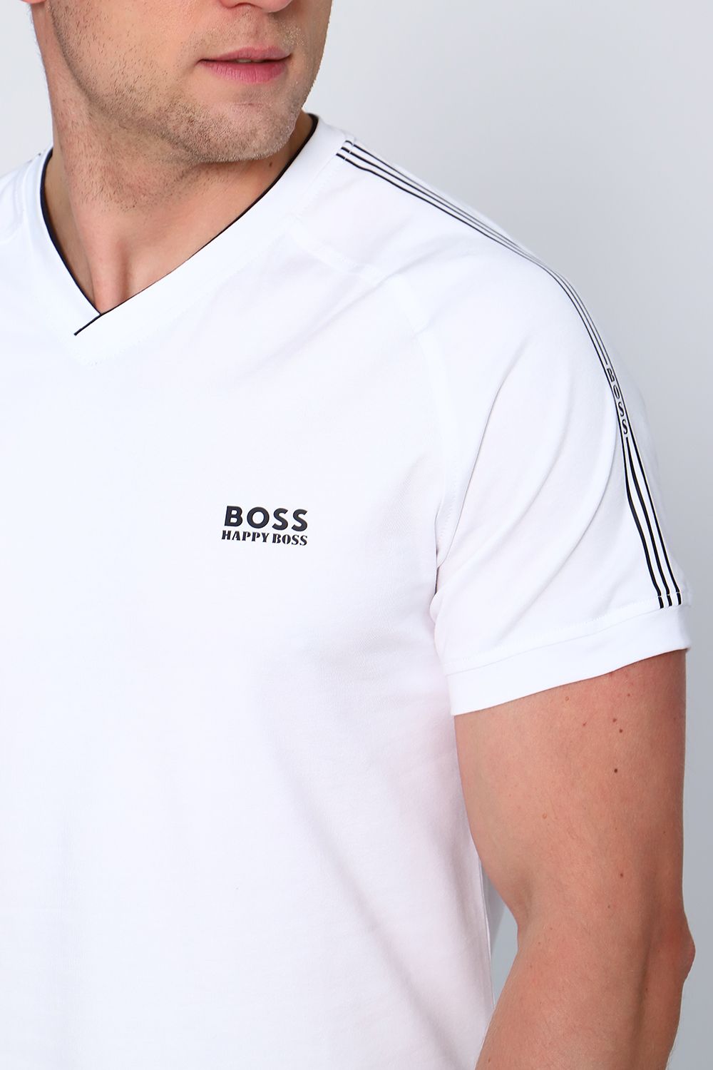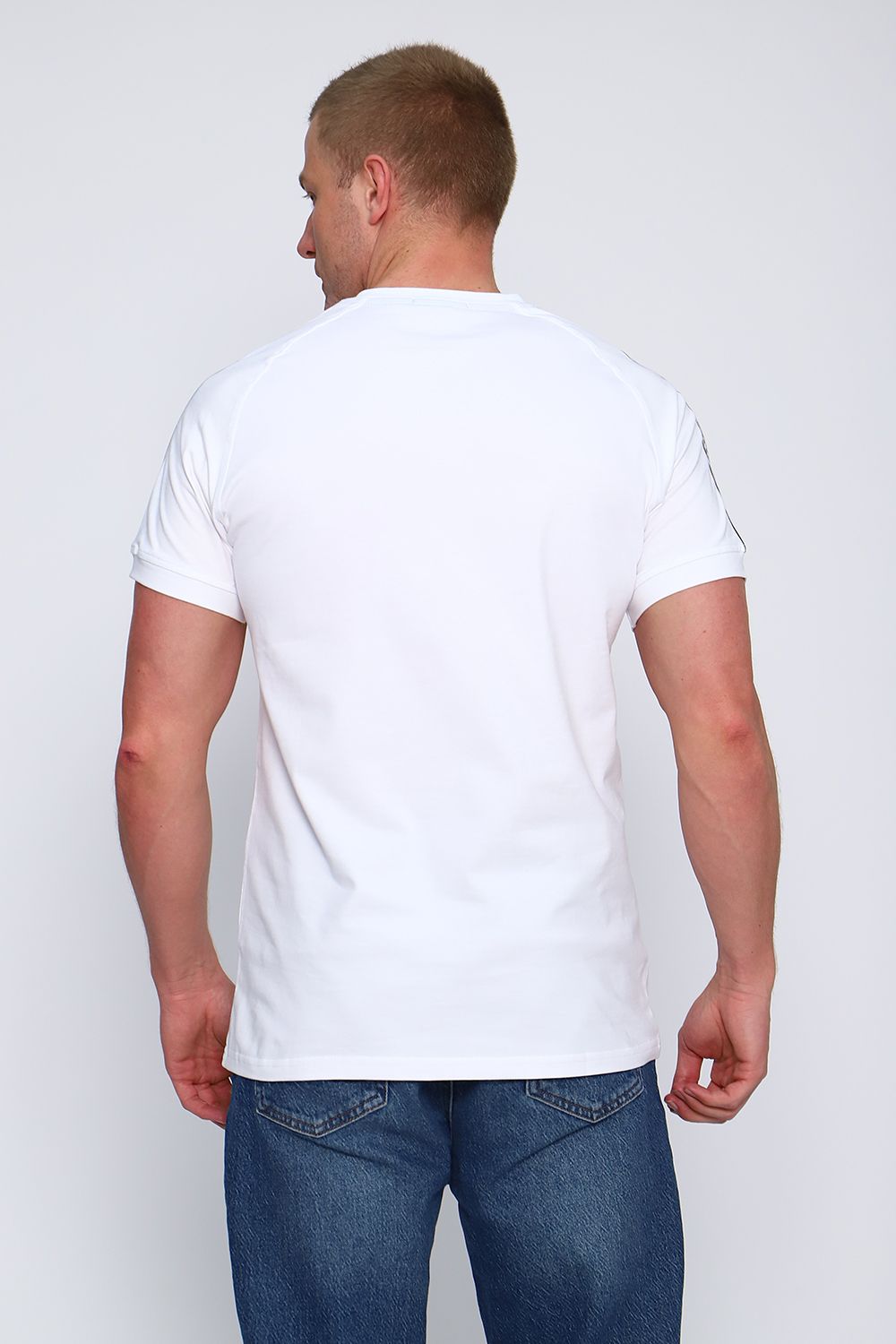 Мужская футболка представлена в пяти цветах, изготовлена из качественной кулирки с лайкрой; материал дышащий, крайне приятен к телу. Ворот футболки V-образный, обработан контрастной окантовкой, рукав-реглан на манжете. Изделие дополнено лаконичной печатью на груди, также печать нанесена вдоль по длине рукава. Футболка идеально садится на фигуру, не сковывает движения.