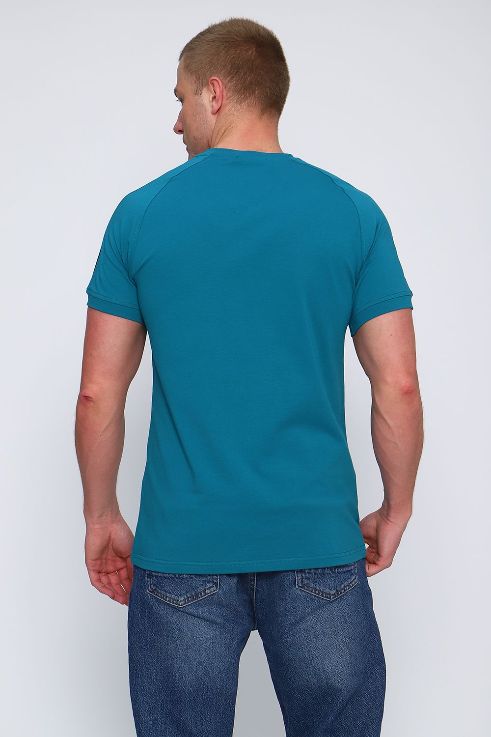 Мужская футболка представлена в пяти цветах, изготовлена из качественной кулирки с лайкрой; материал дышащий, крайне приятен к телу. Ворот футболки V-образный, обработан контрастной окантовкой, рукав-реглан на манжете. Изделие дополнено лаконичной печатью на груди, также печать нанесена вдоль по длине рукава. Футболка идеально садится на фигуру, не сковывает движения.