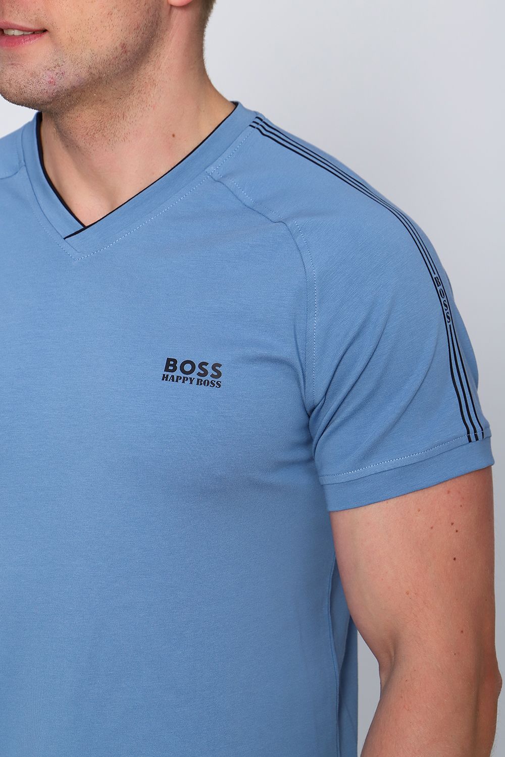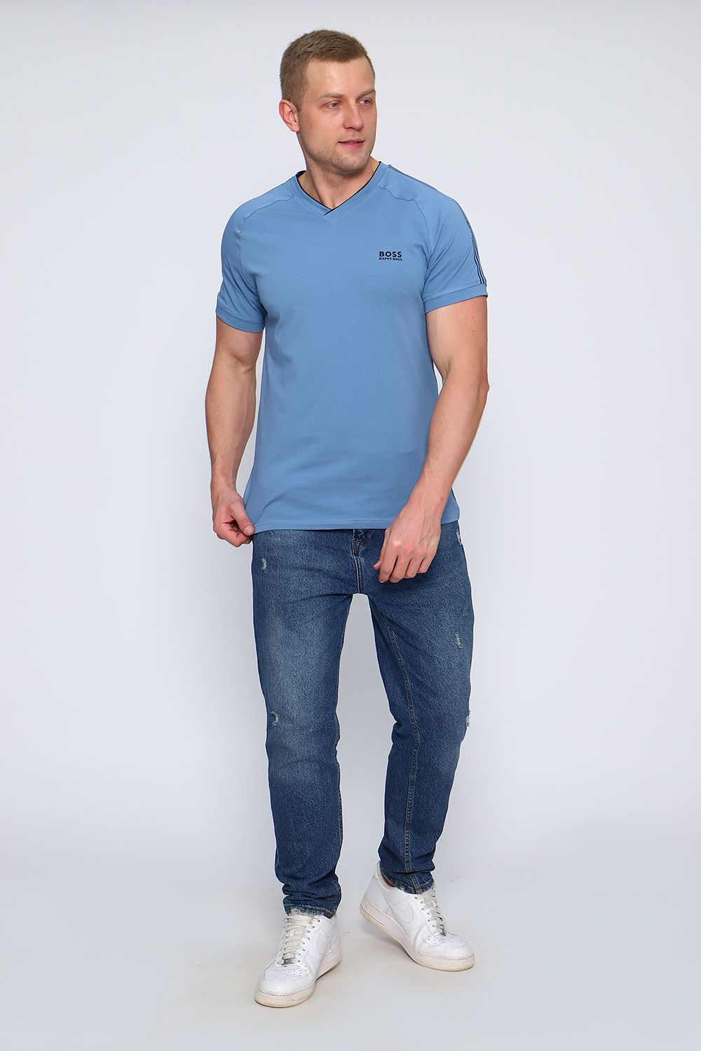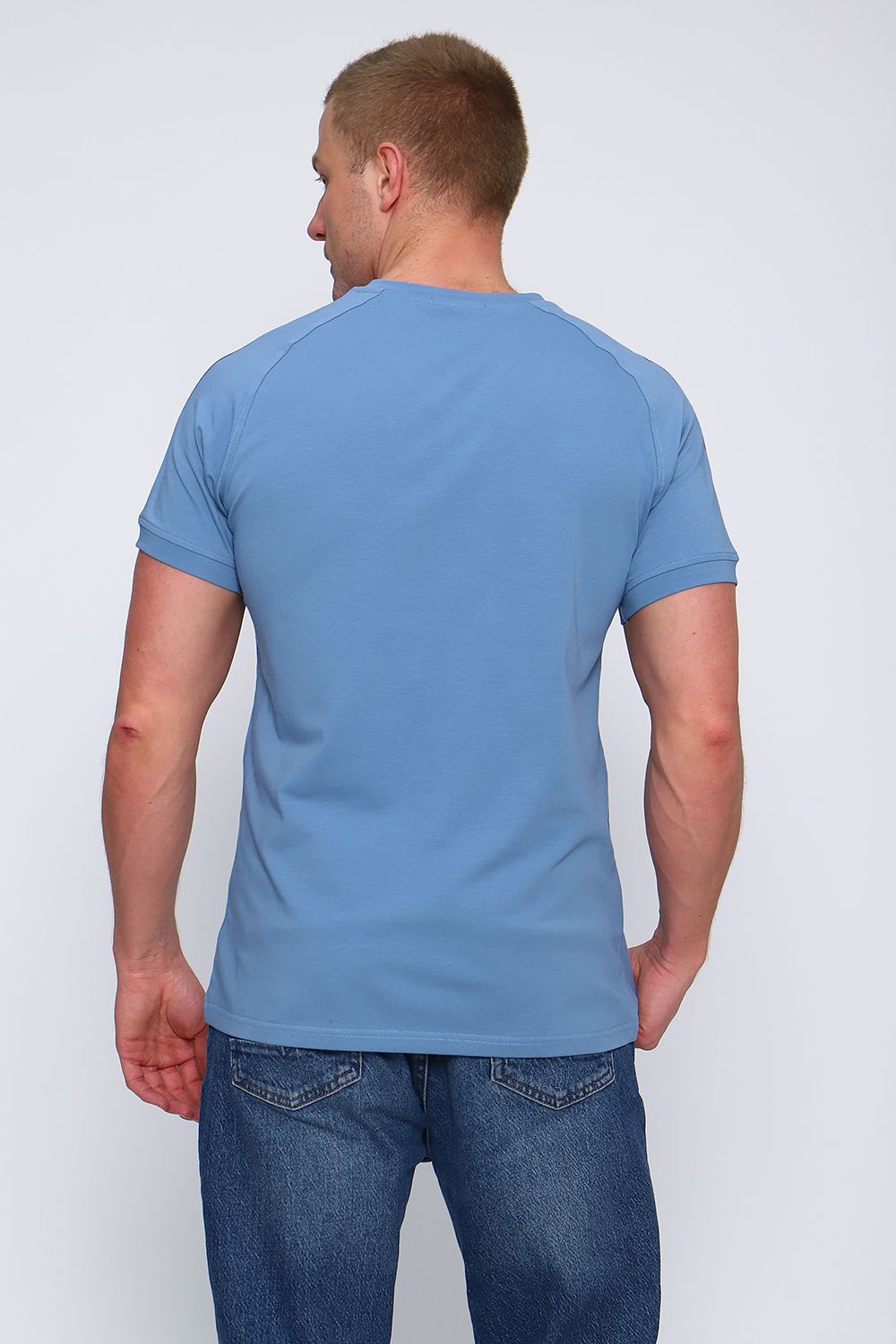 Мужская футболка представлена в пяти цветах, изготовлена из качественной кулирки с лайкрой; материал дышащий, крайне приятен к телу. Ворот футболки V-образный, обработан контрастной окантовкой, рукав-реглан на манжете. Изделие дополнено лаконичной печатью на груди, также печать нанесена вдоль по длине рукава. Футболка идеально садится на фигуру, не сковывает движения.
