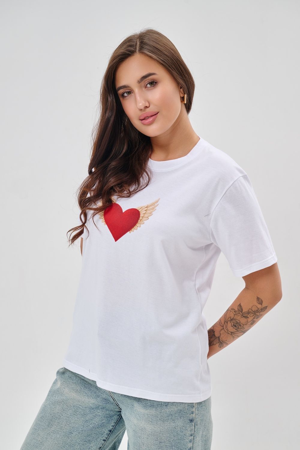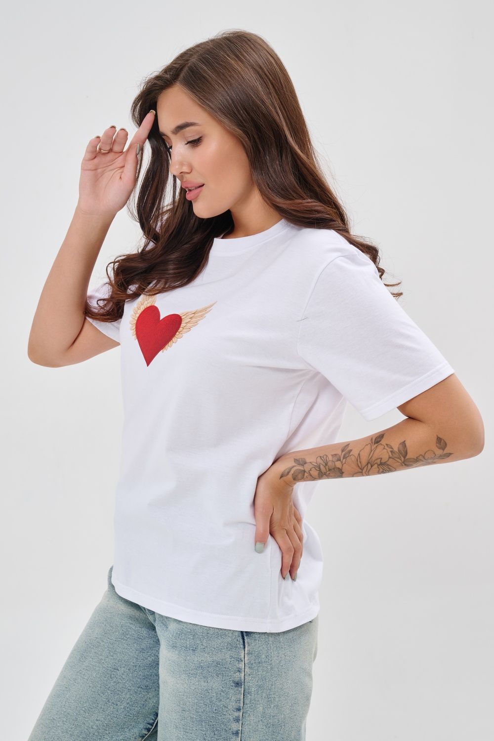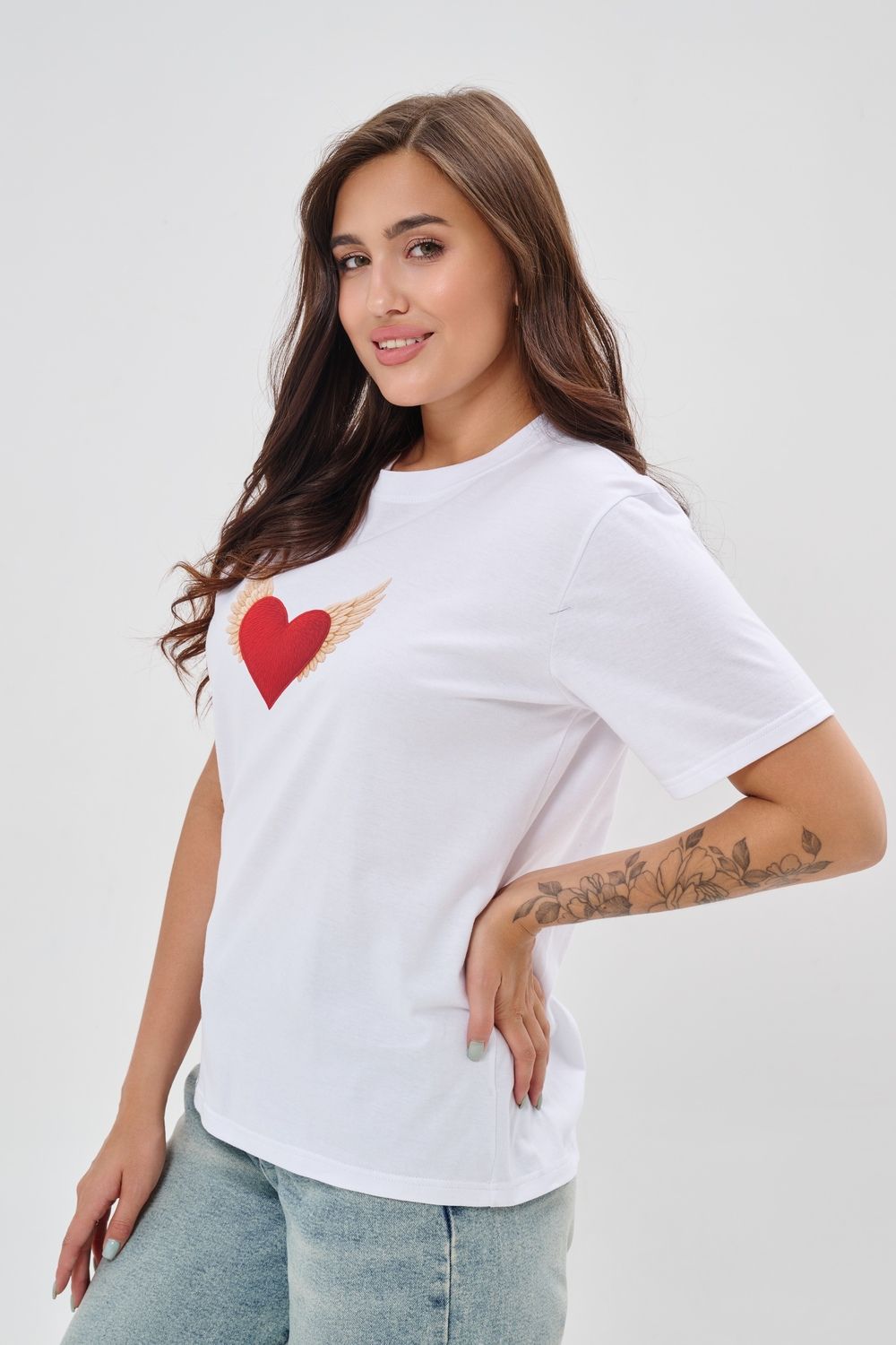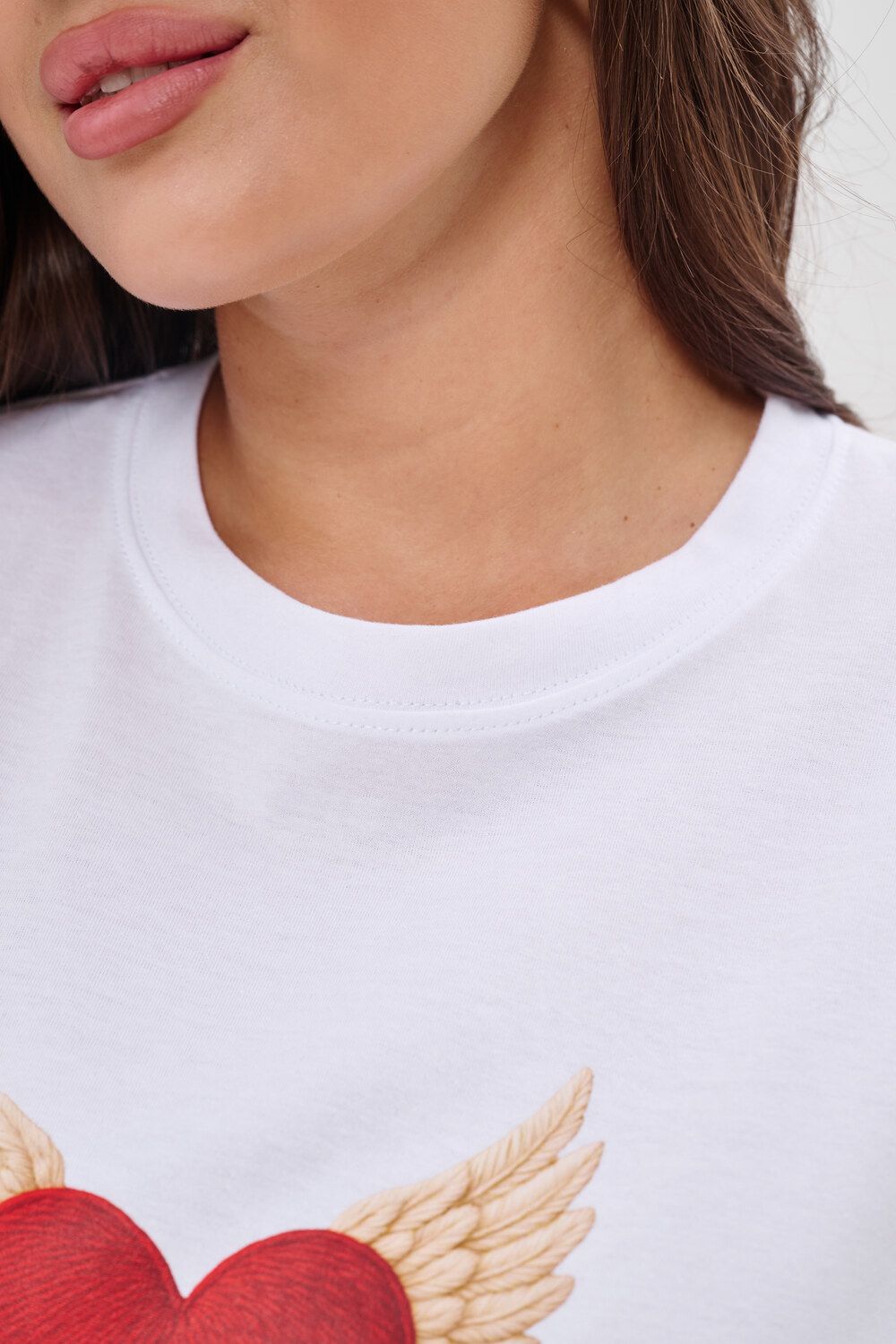 Женская футболка приталенного кроя из кулирки, идеально подчеркивает линии фигуры. Классический короткий рукав и круглый вырез делают её удобной и повседневной. Центральная деталь изделия — оригинальный принт на груди в виде красного сердца с крыльями, символично объединяя романтичность и воздушность. Такая футболка обязательно привлечёт внимание и станет любимой вещью вашего гардероба!