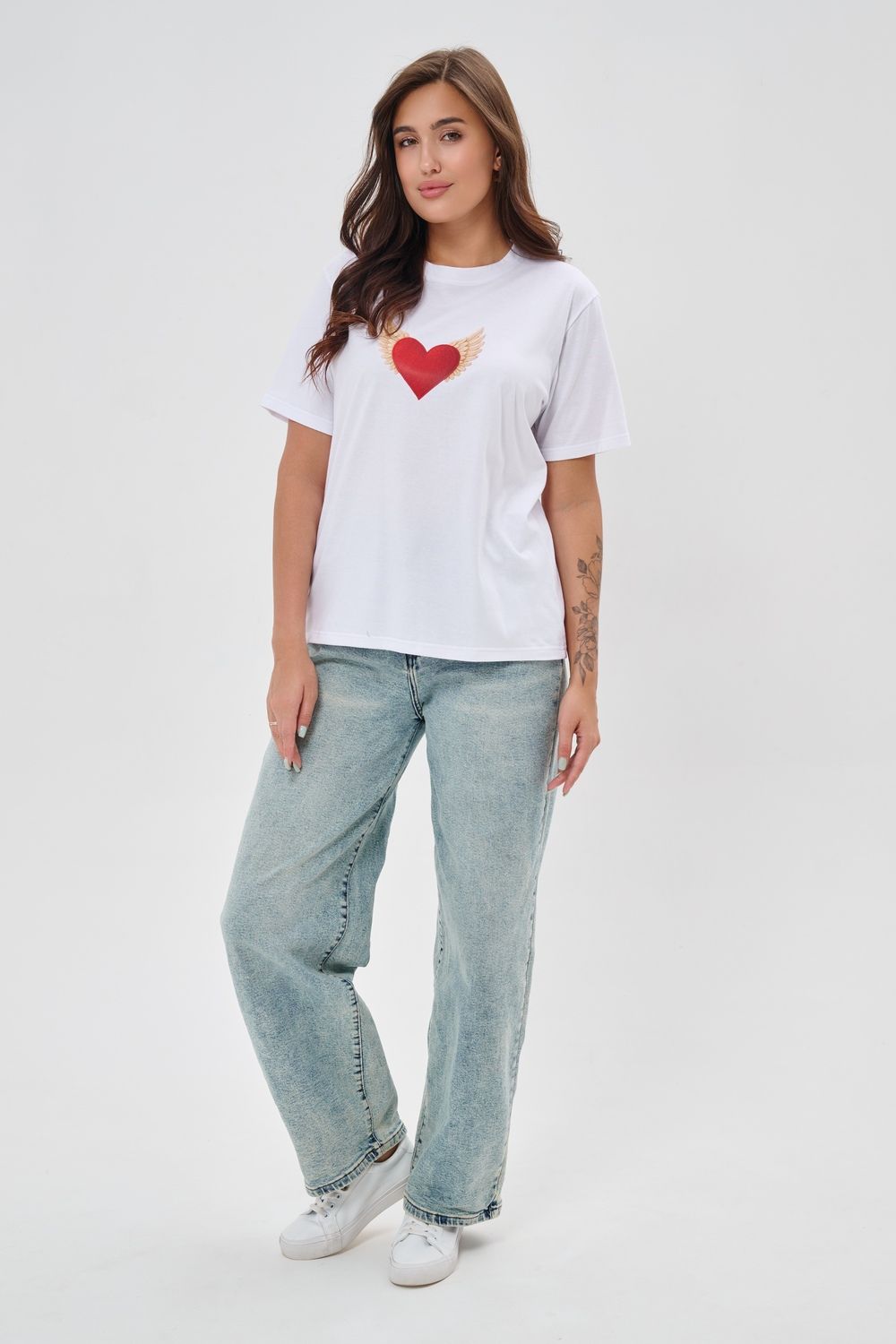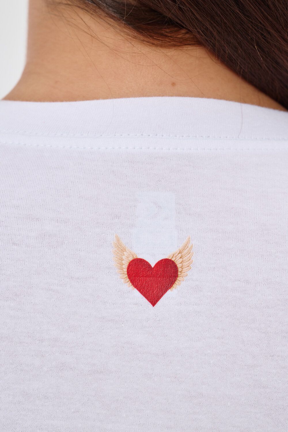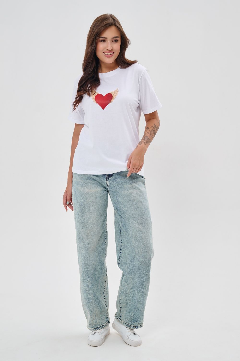 Женская футболка приталенного кроя из кулирки, идеально подчеркивает линии фигуры. Классический короткий рукав и круглый вырез делают её удобной и повседневной. Центральная деталь изделия — оригинальный принт на груди в виде красного сердца с крыльями, символично объединяя романтичность и воздушность. Такая футболка обязательно привлечёт внимание и станет любимой вещью вашего гардероба!