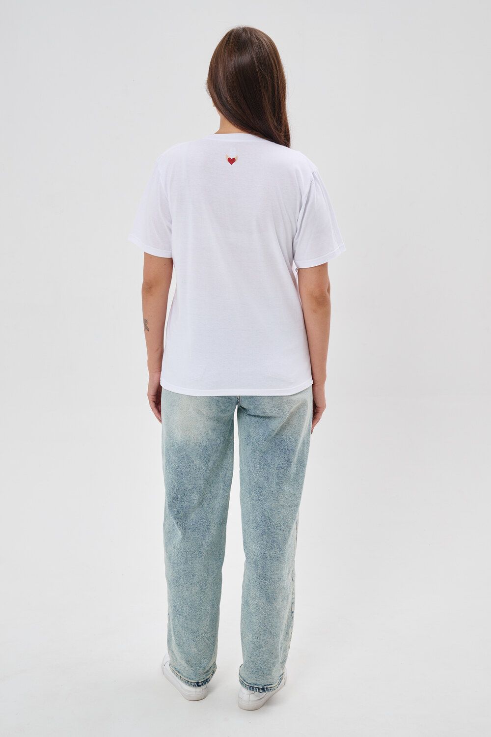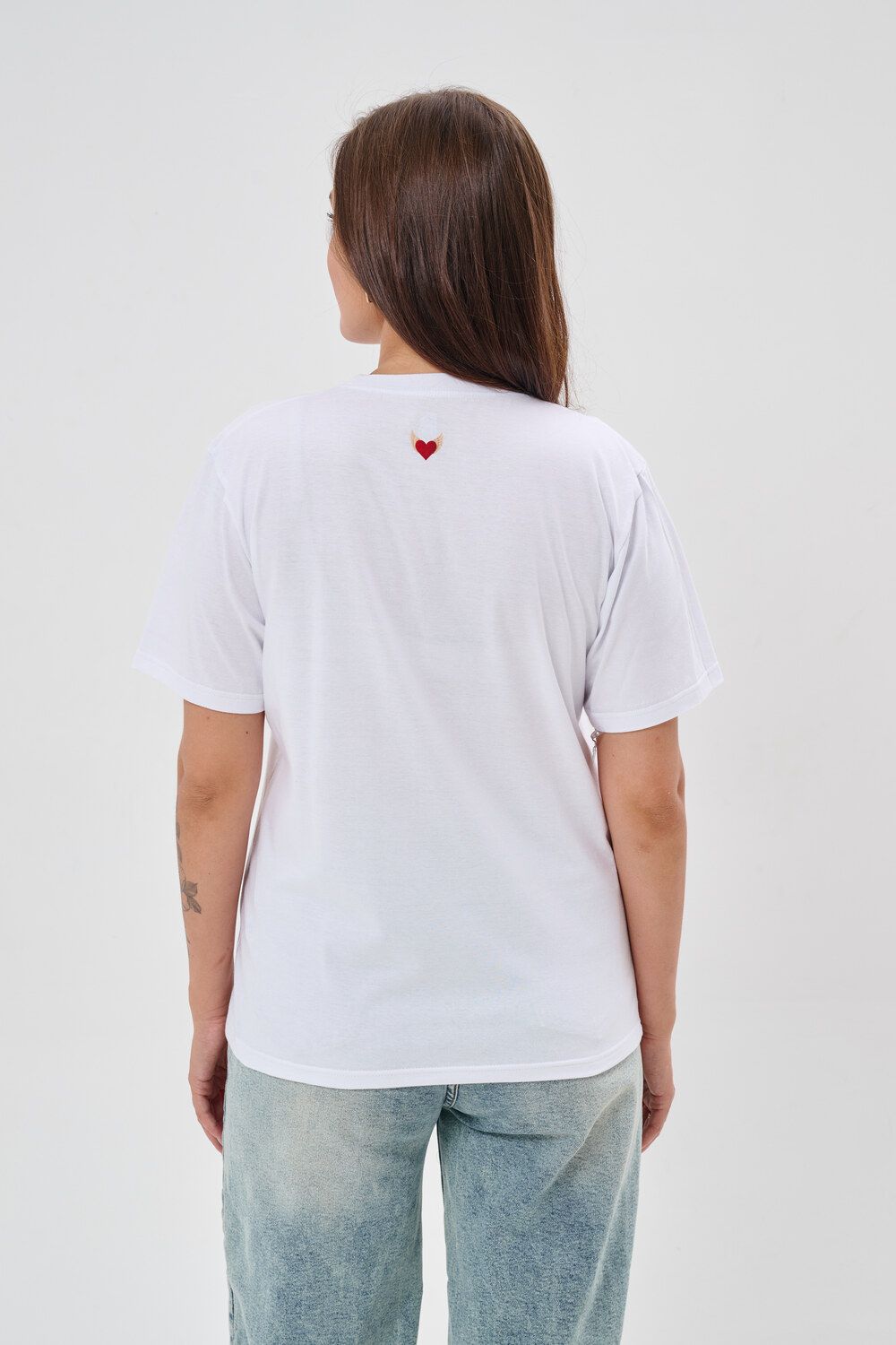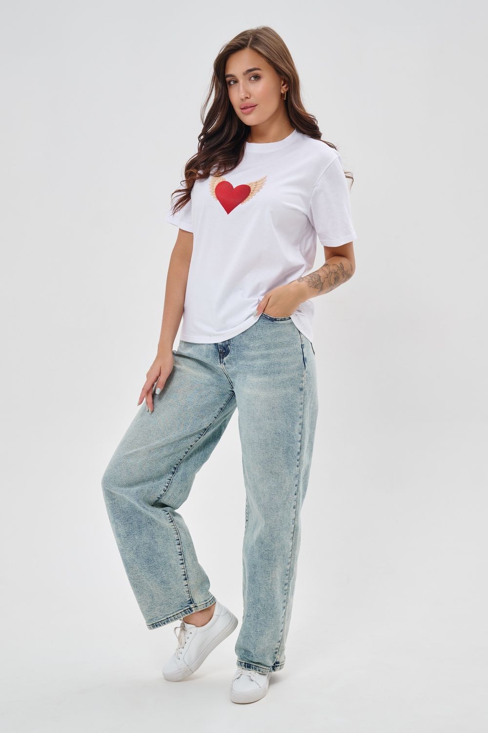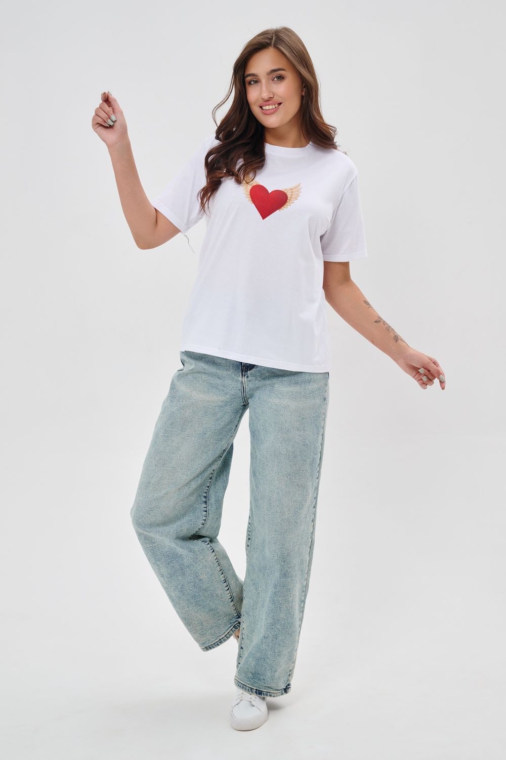 Женская футболка приталенного кроя из кулирки, идеально подчеркивает линии фигуры. Классический короткий рукав и круглый вырез делают её удобной и повседневной. Центральная деталь изделия — оригинальный принт на груди в виде красного сердца с крыльями, символично объединяя романтичность и воздушность. Такая футболка обязательно привлечёт внимание и станет любимой вещью вашего гардероба!