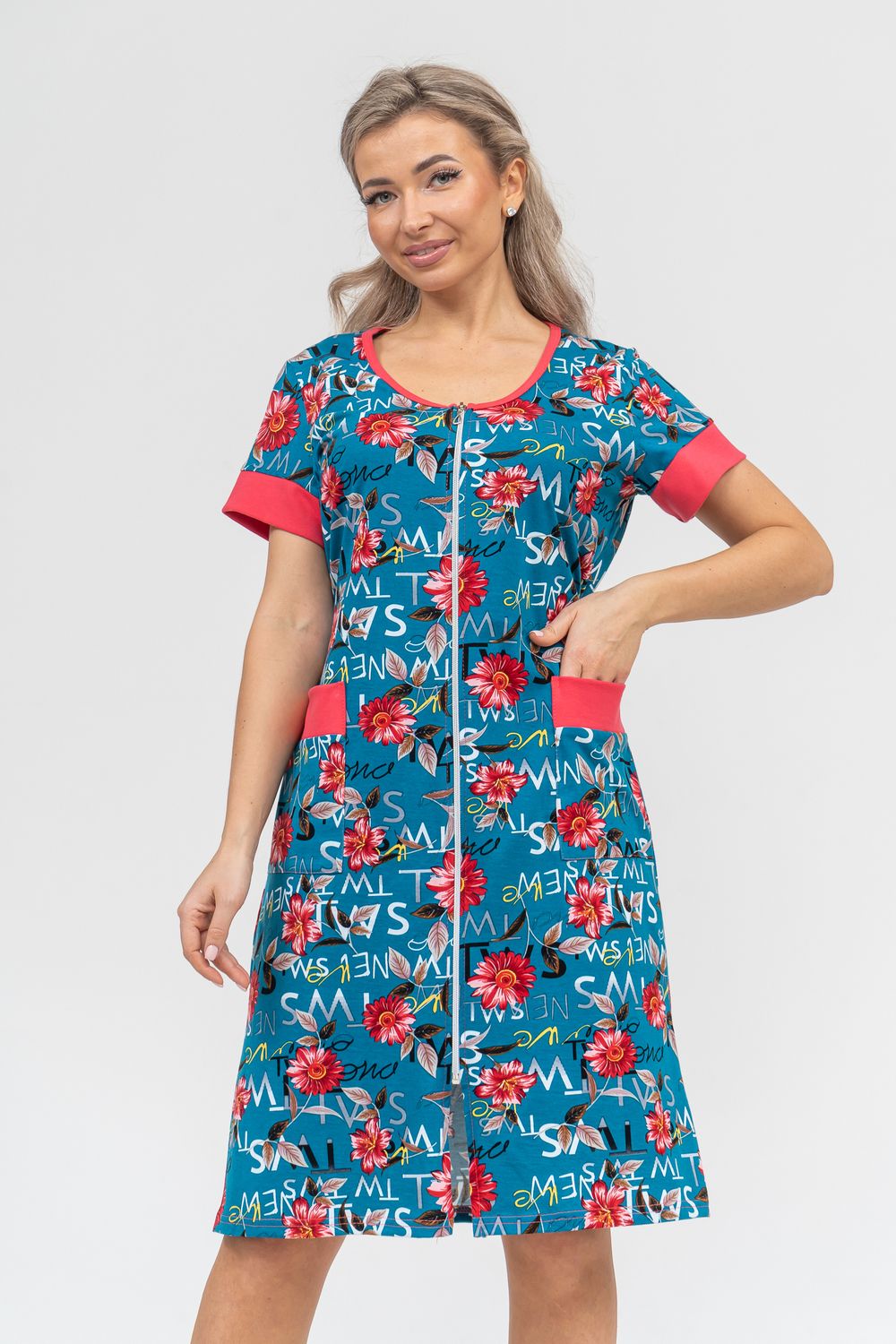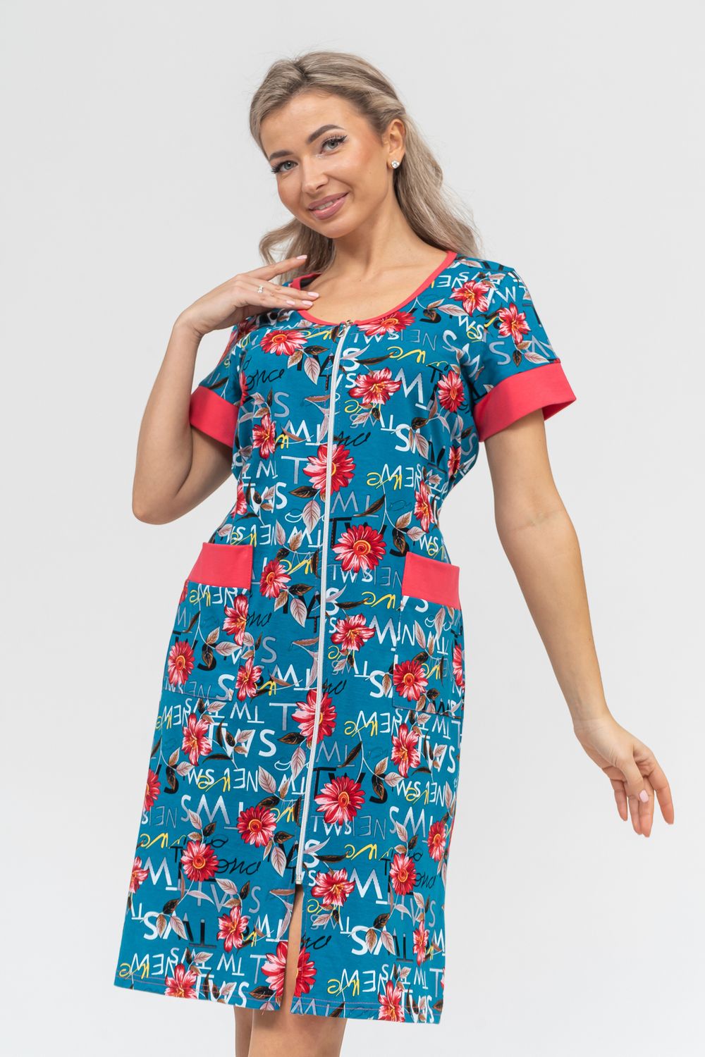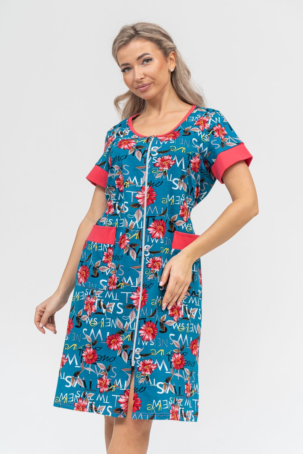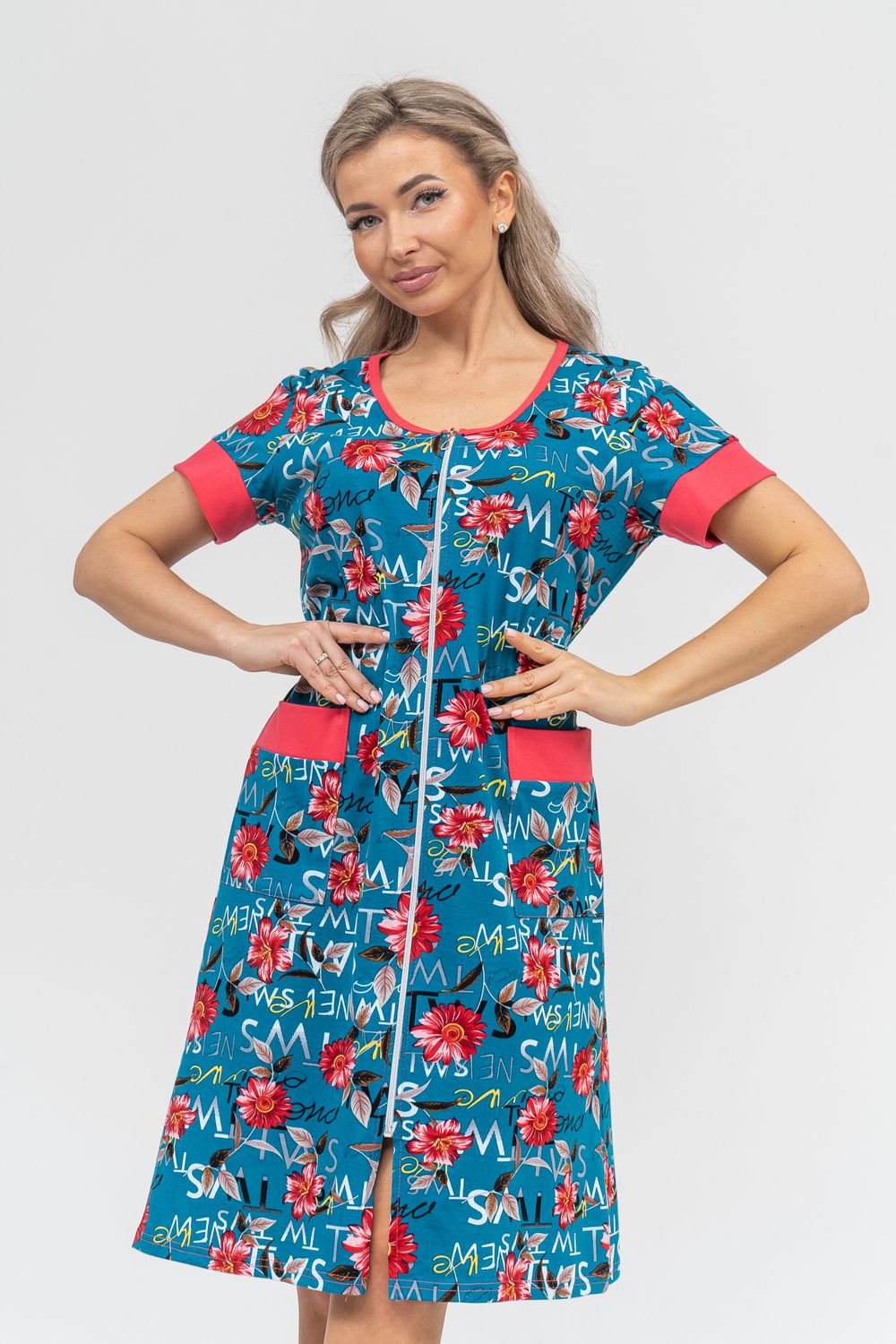 Женский халатик на молнии – самая распространенная и универсальная одежда для домашнего отдыха и хозяйственных хлопот. После трудного рабочего дня, приходя домой, первым делом хочется переодеться. И данная модель это идеальный вариант среди представительниц прекрасной половины человечества. Модель выполнена из 100% хлопчатобумажной ткани. Халат так же дополняет яркая отделка по рукавам и карманам. А пояс на линии талии поможет легко смоделировать женственный силуэт и при этом Вы будете чувствовать себя легко и непринуждённо. Данная модель прекрасно подойдёт для дома, дачи и отдыха, создавая по-настоящему яркий образ и хорошее настроение!