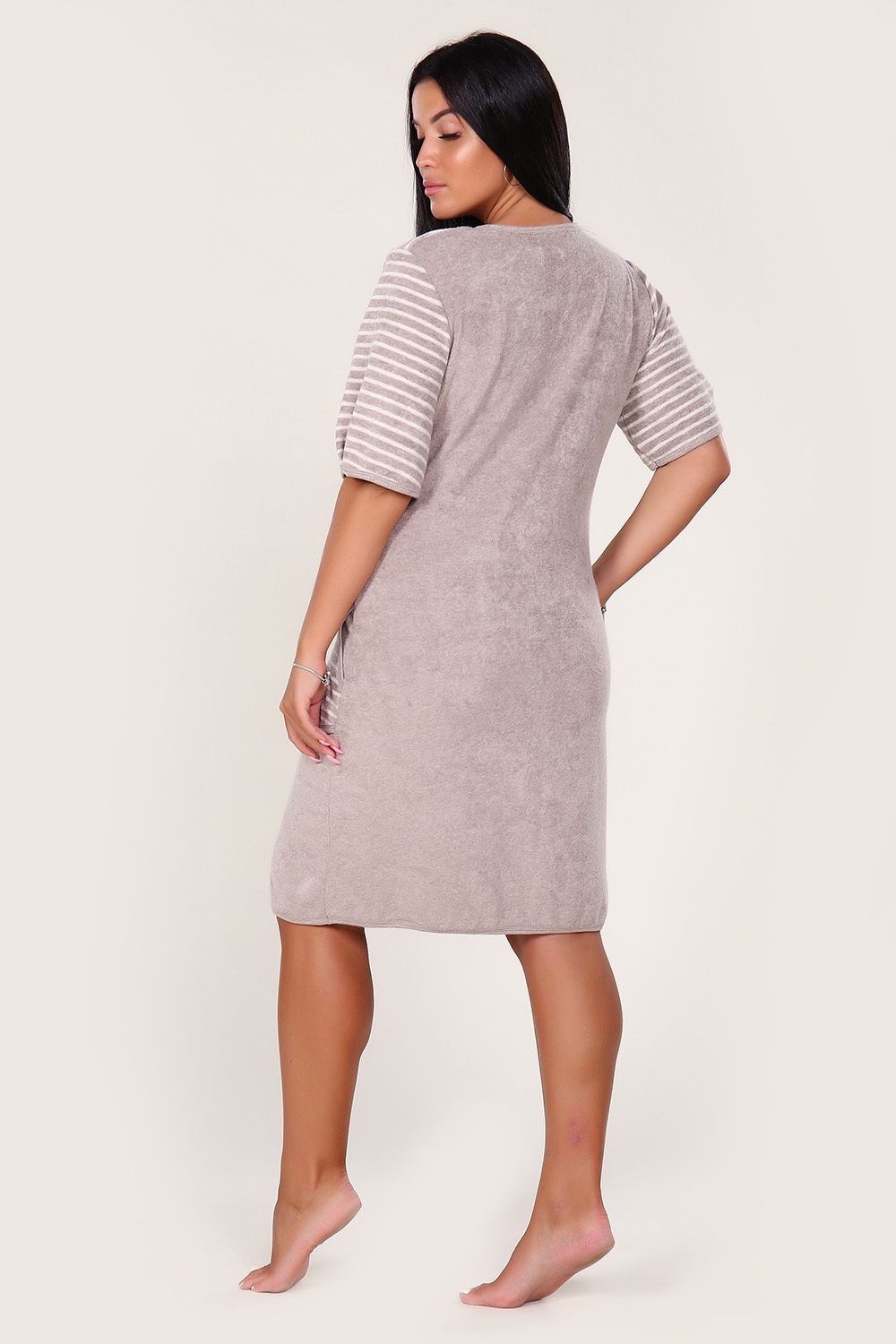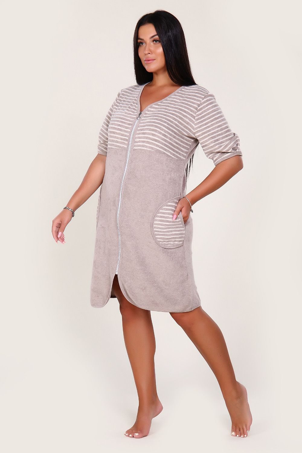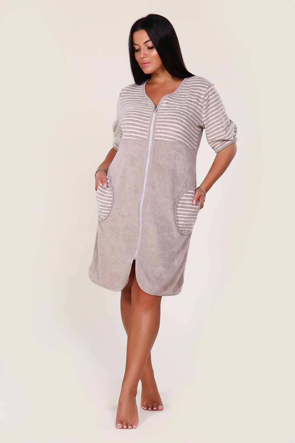 Женский махровый халат Terry Light Средняя длина, застежка по молнии Рукава до локтей, боковые фигурные накладные карманы Однотонный с принтом полос или цветочный на верхней части и карманах Свободный прямой крой — универсален для любого типа фигуры, подходит для беременных Замок-молния удобен для кормящих женщин; можно использовать в роддоме Натуральная ткань приятна к телу, не раздражает кожу; стойкий к стиркам Широкий размерный ряд, есть большие размеры/