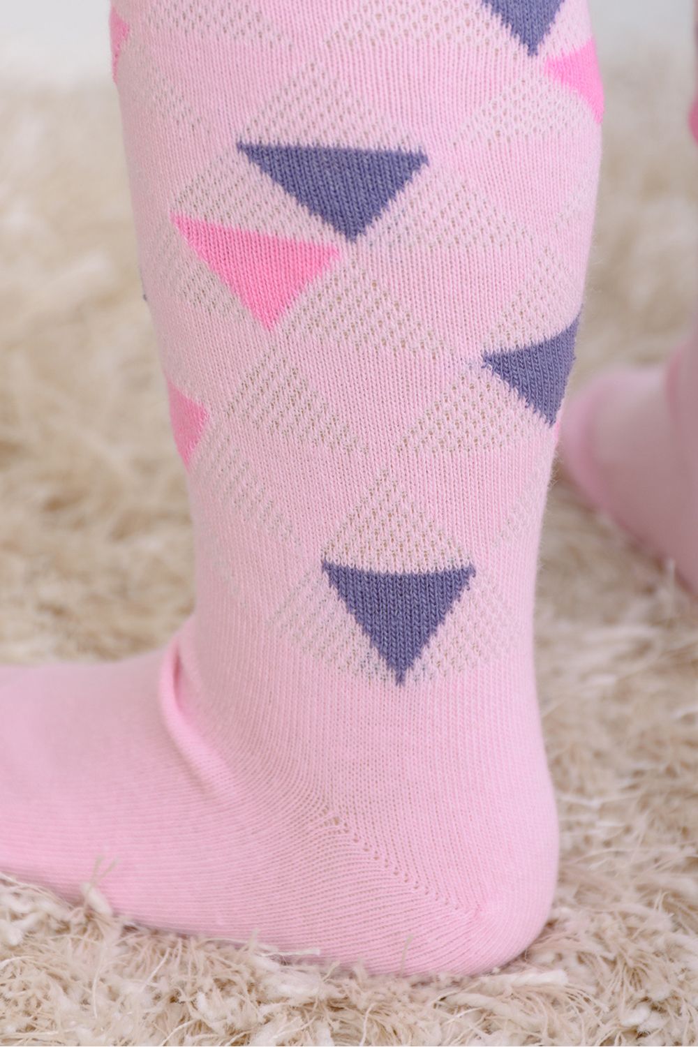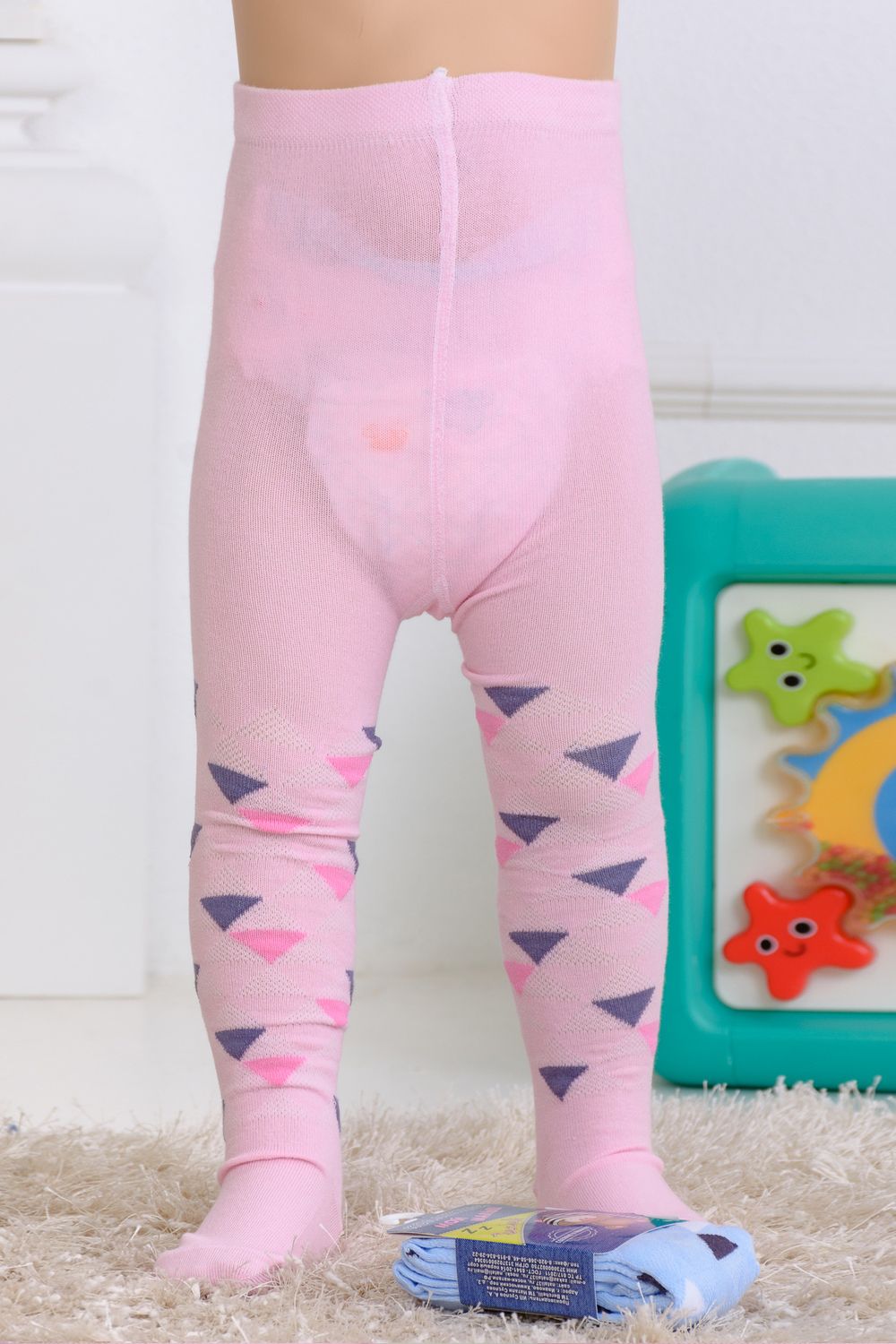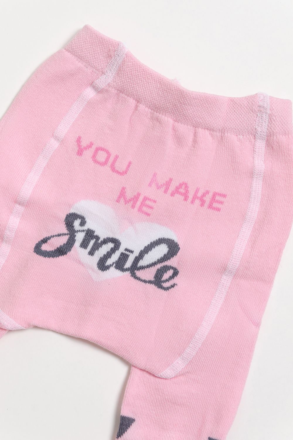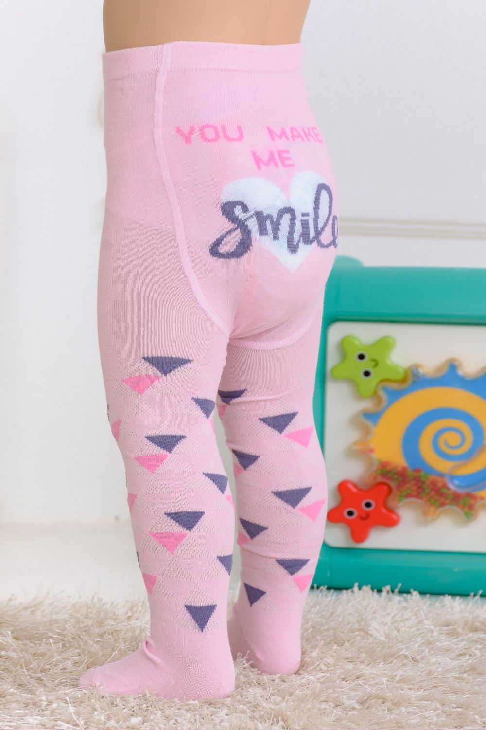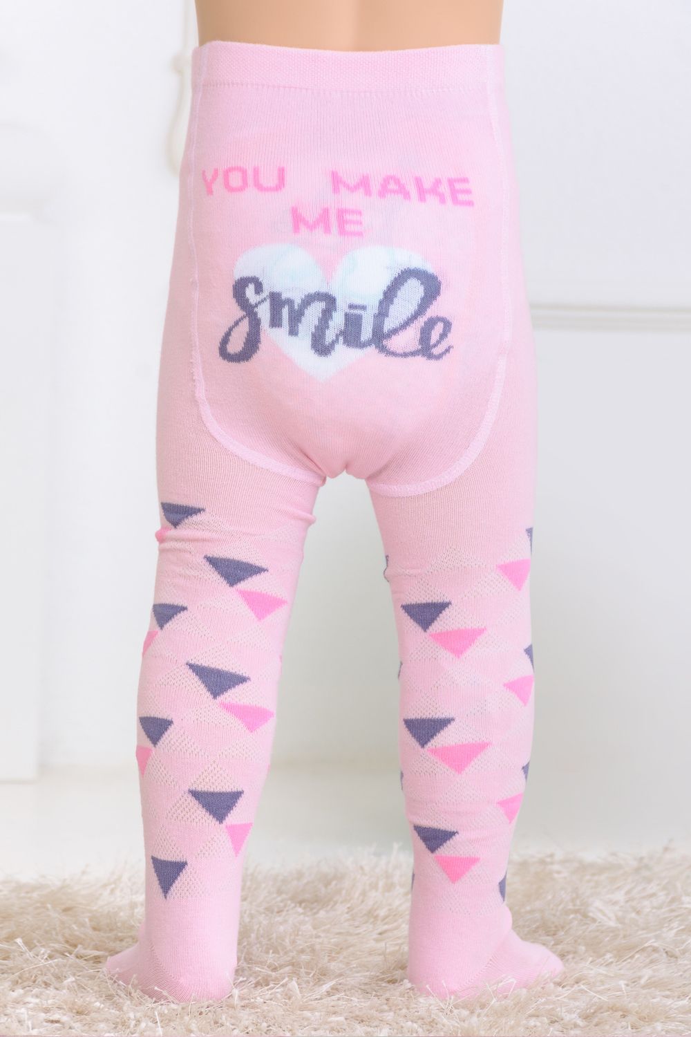 Колготки для самых маленьких. Приятные пастельные расцветки - розовая и голубая. По длине колготок вывязаны разноцветные треугольники, сзади надпись "You make me smile" ("Ты заставляешь меня улыбаться")