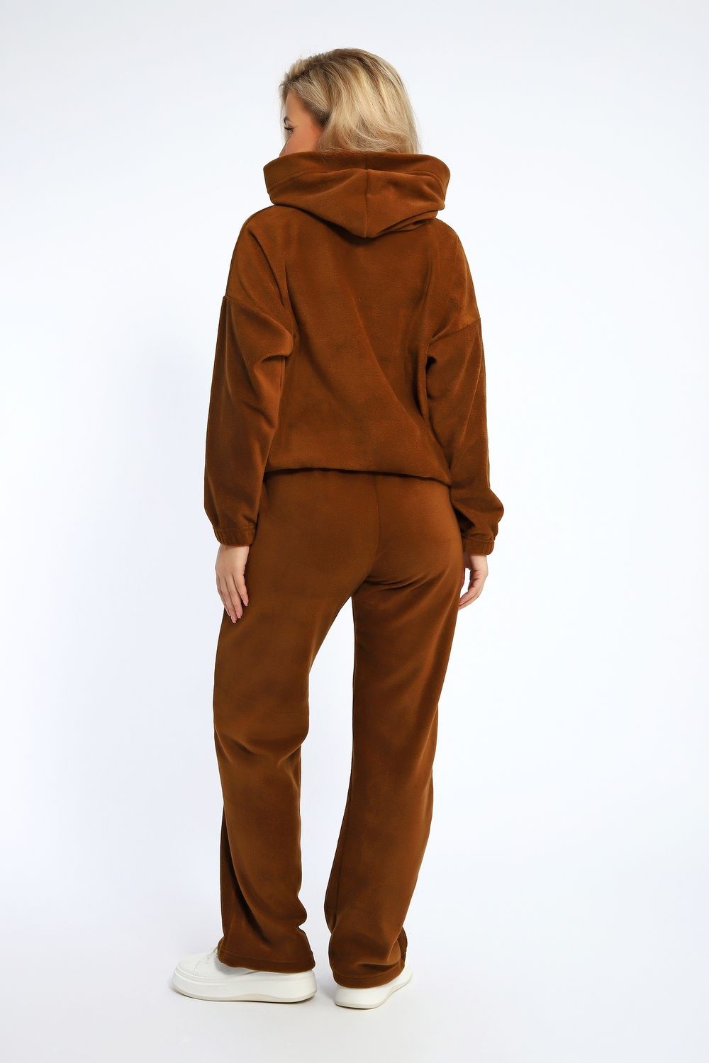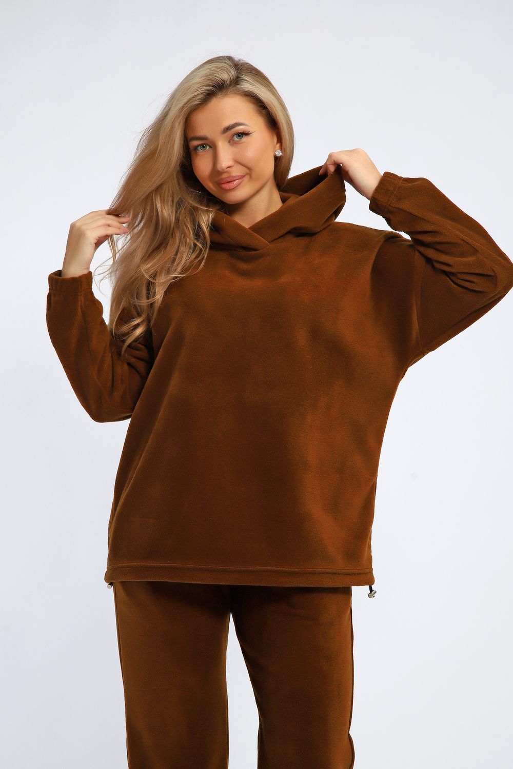 Костюм женский флисовый состоит из худи свободного кроя и брюк. Худи с капюшоном, рукав на резинке, по низу утягивается эластичным шнурком с фиксаторами. Брюки свободные, с карманами, внизу можно также утягивать эластичным шнурком с фиксаторами. Костюм мягкий, комфортный, отлично подойдет для прогулок в прохладное время года.