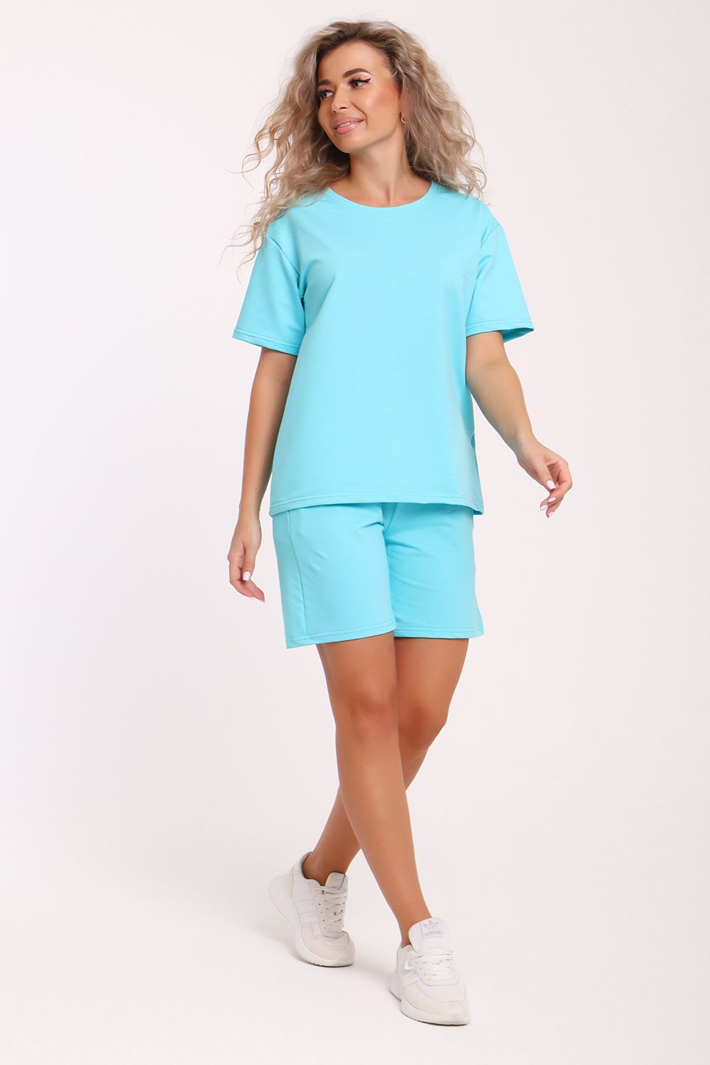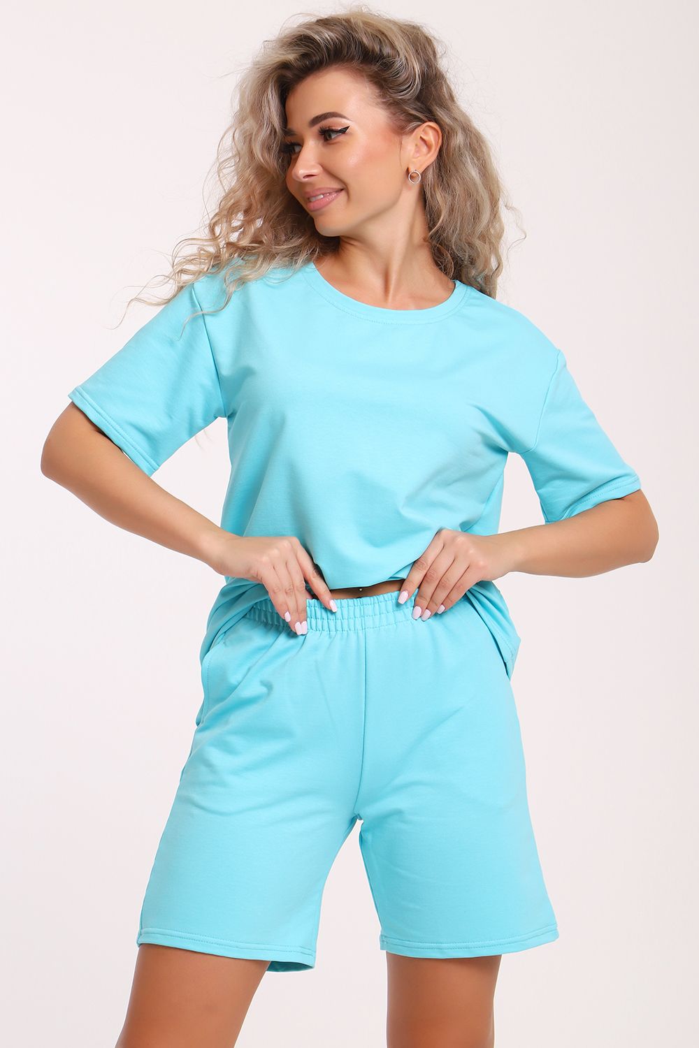 Костюм футболка с короткими рукавами и свободные шорты с карманами.