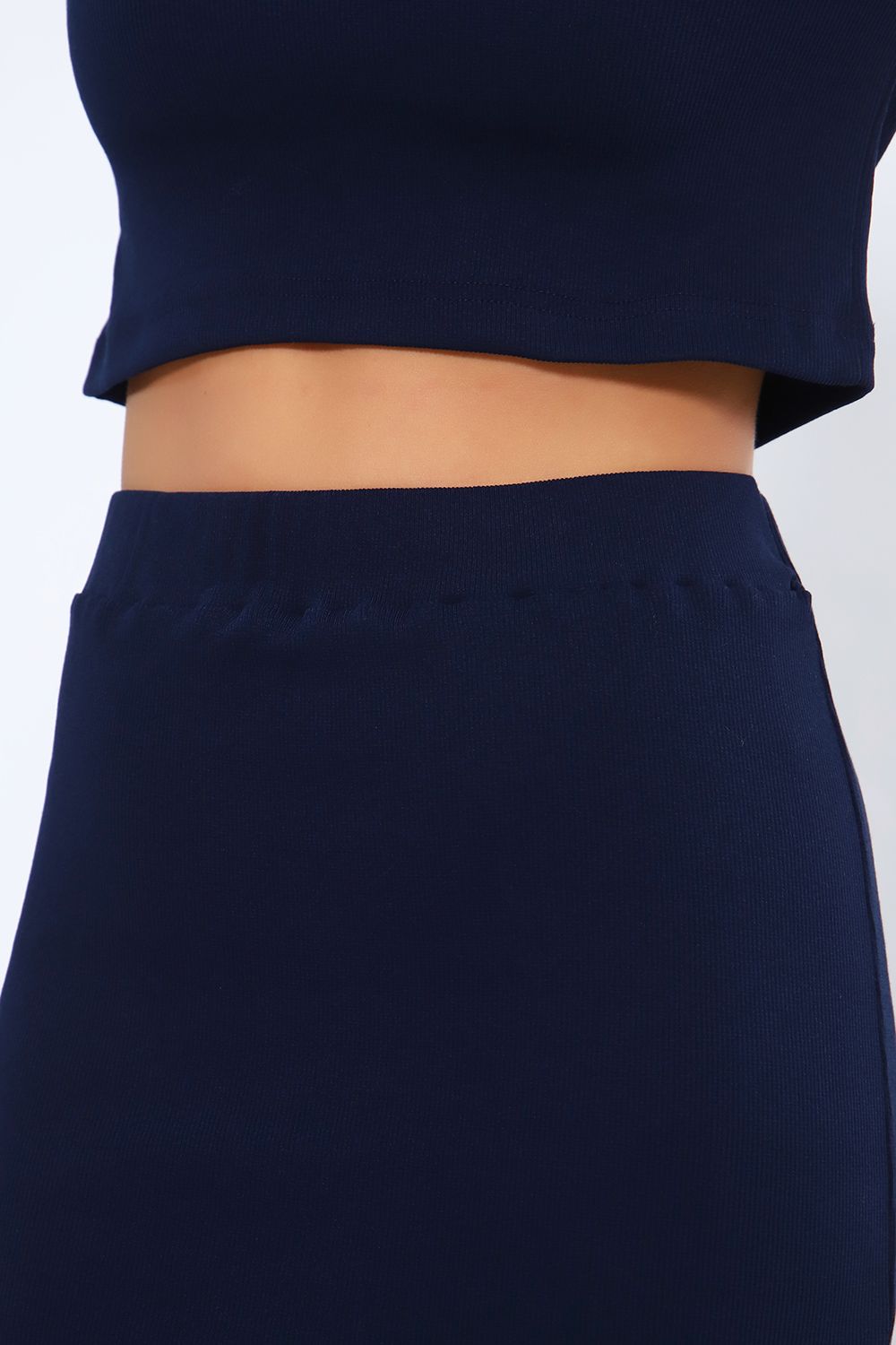 Костюм состоит из топа с длинными рукавами и юбки с двумя разрезами в боковых швах. Замеры без учета растяжения ткани.