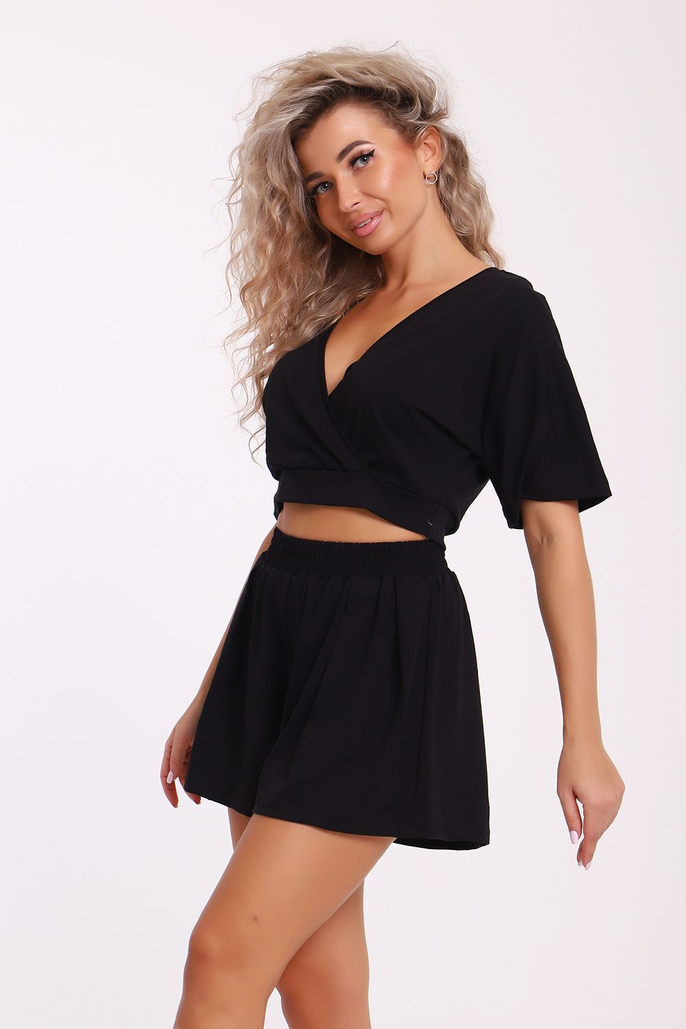 Костюм состоит из топа и шорт. Топ с лифом на запах и короткими цельнокроеными рукавами. Шорты свободного кроя и с высокой посадкой.