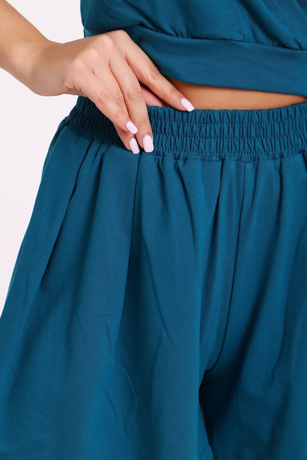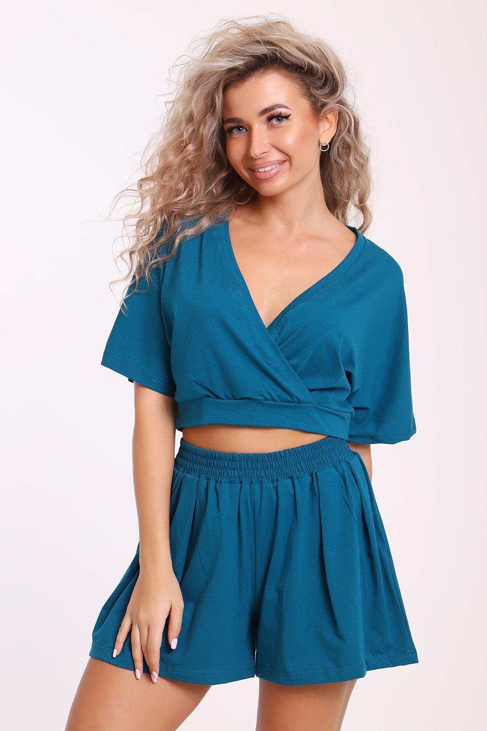 Костюм состоит из топа и шорт. Топ с лифом на запах и короткими цельнокроеными рукавами. Шорты свободного кроя и с высокой посадкой.