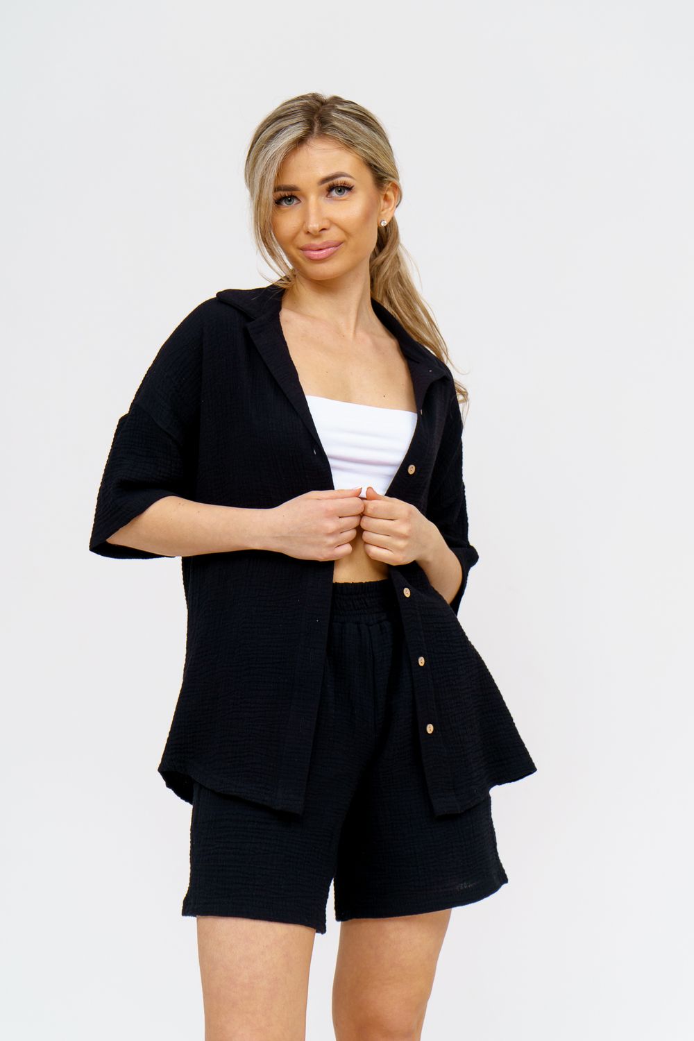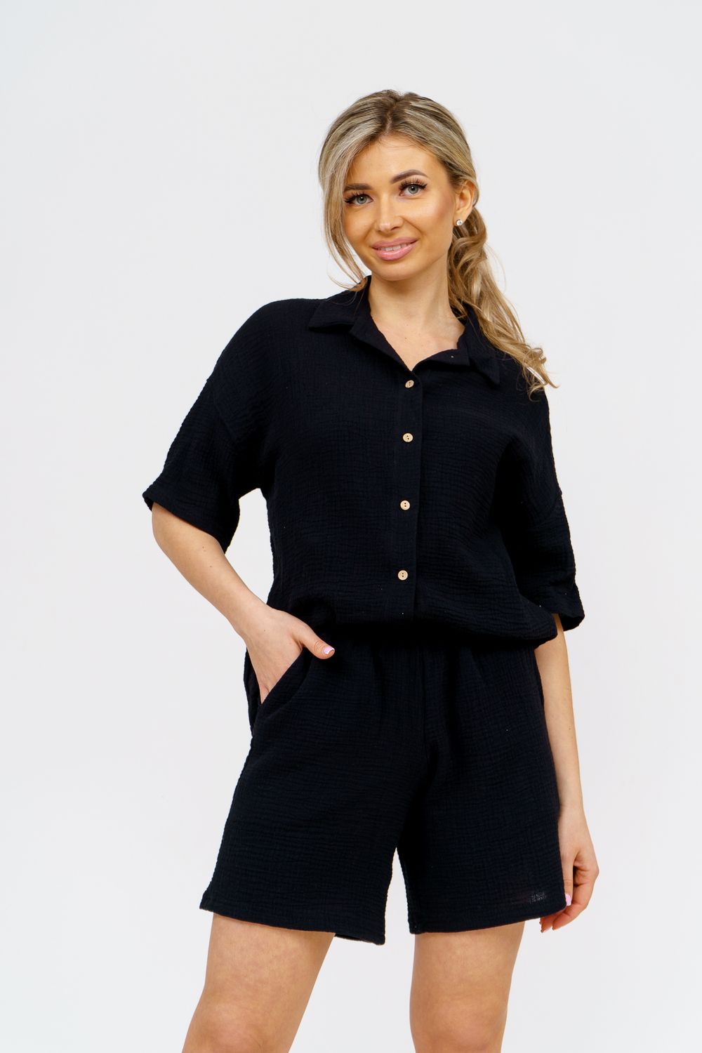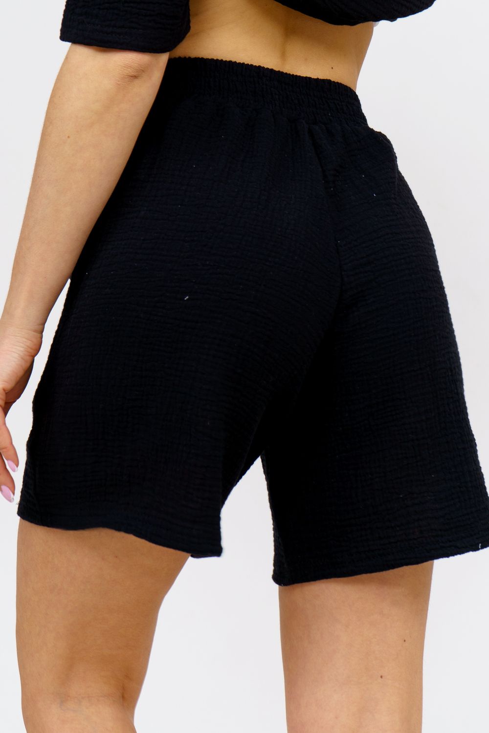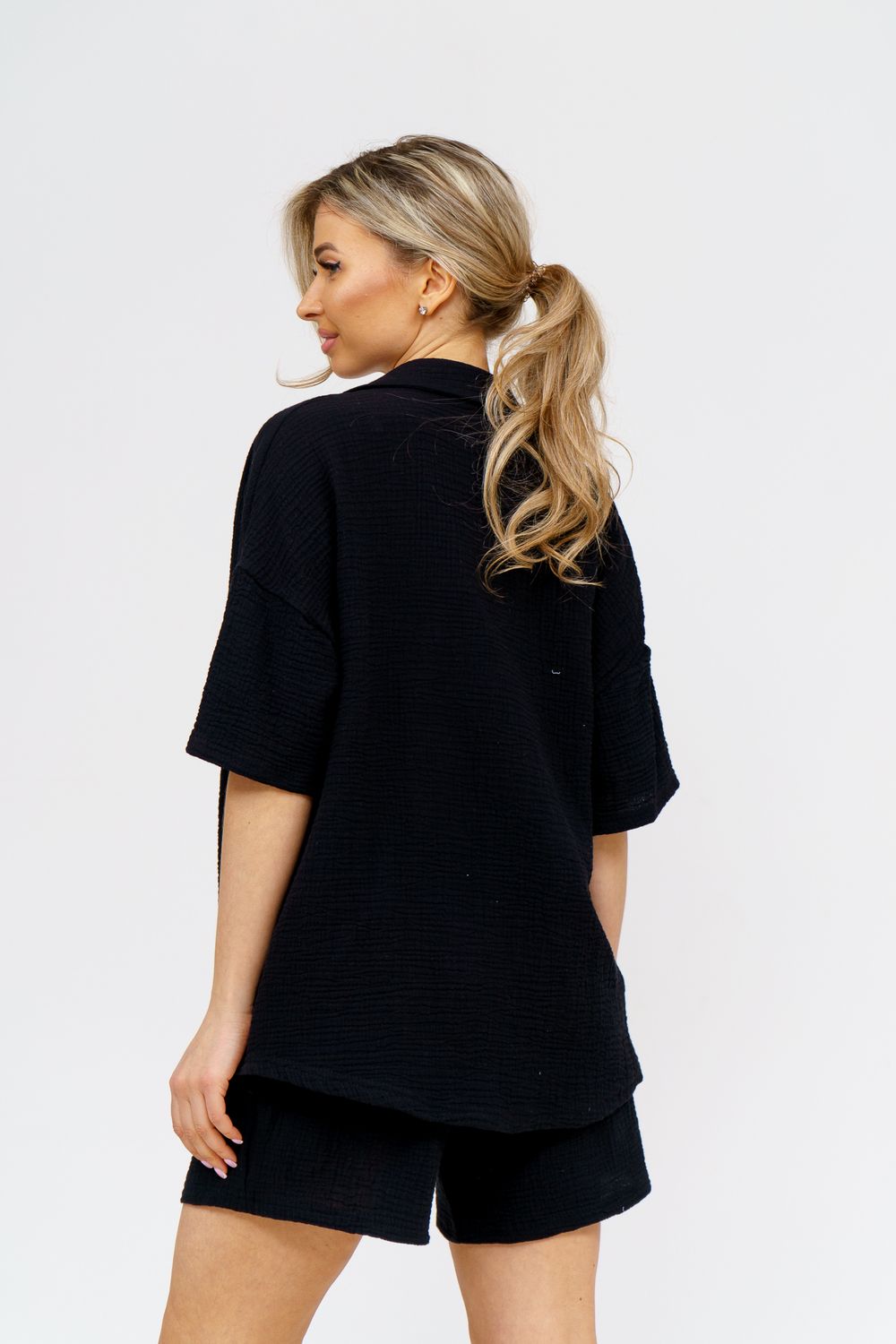Модный костюм в стиле oversize выполнен из воздушного и приятного к телу 2-х слойного жатого муслина. Это одна из самых модных и популярных моделей сезона. Рубашка имеет слегка удлинённую спинку, спущенную линию плечевого шва, укороченный рукав, классический рубашечный воротник и планку на пуговках. Шорты бермуды с высокой посадкой создадут модный образ для любой девушки. Пояс шорт выполнен на специализированной поясной машине, что добавляет изделию большую износостойкость и эстетический внешний вид. По бокам, для удобства, расположены вместительные карманы. Изделие из муслина имеет много положительных качеств: нежность и лёгкость, высокая прочность и воздухопроницаемость. А модные цвета этого лета добавляют законченность деталям и определяют "must have" сезона. За счёт свободного фасона костюм можно носить с любым типом фигуры, отлично подойдёт для беременных женщин, а также кормящих мам. Женская хлопковый костюм идеален как для лета, так и для прохладного вечера. С помощью такого костюма Вы можете создать любой образ. А также отправиться на праздник, вечеринку или на прогулку, на пляж или провести незабываемый вечер дома. Модель такого плана идеально подойдёт и в качестве подарка для себя и своих любимых! Стирать муслиновые вещи нужно только в теплой воде при температуре не выше 40°С. У нас Вы также можете приобрести только рубашку из такого материала- модель 36766 и создать свой неповторимый образ! Ориентируясь по таблице замеров, обратите внимание, что замеры длины рукава проводились от точки основания шеи.