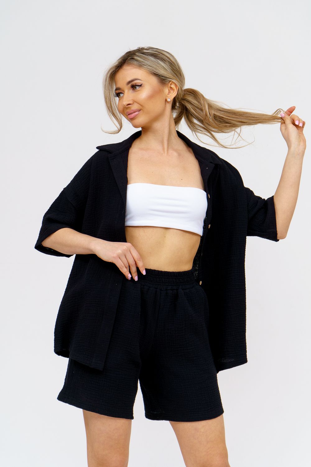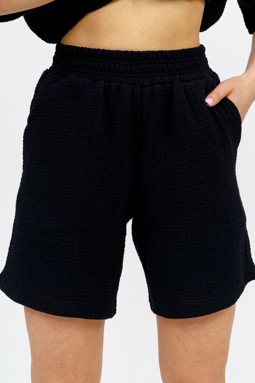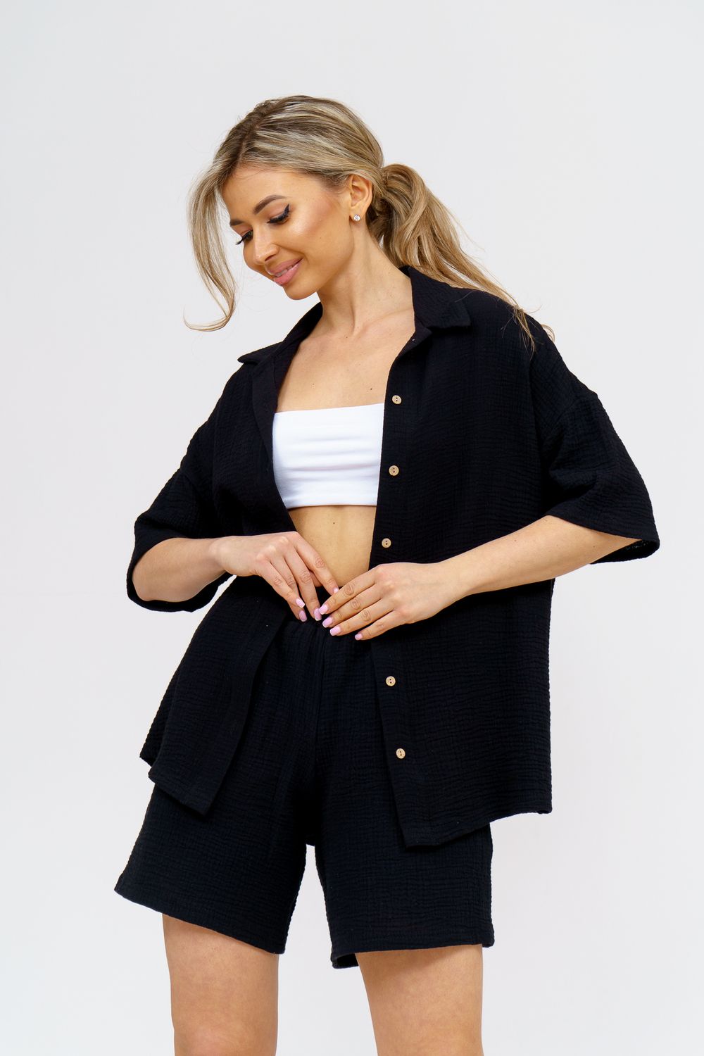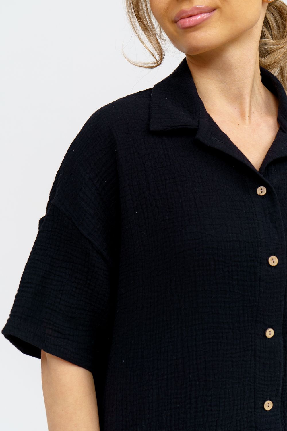 Модный костюм в стиле oversize выполнен из воздушного и приятного к телу 2-х слойного жатого муслина. Это одна из самых модных и популярных моделей сезона. Рубашка имеет слегка удлинённую спинку, спущенную линию плечевого шва, укороченный рукав, классический рубашечный воротник и планку на пуговках. Шорты бермуды с высокой посадкой создадут модный образ для любой девушки. Пояс шорт выполнен на специализированной поясной машине, что добавляет изделию большую износостойкость и эстетический внешний вид. По бокам, для удобства, расположены вместительные карманы. Изделие из муслина имеет много положительных качеств: нежность и лёгкость, высокая прочность и воздухопроницаемость. А модные цвета этого лета добавляют законченность деталям и определяют "must have" сезона. За счёт свободного фасона костюм можно носить с любым типом фигуры, отлично подойдёт для беременных женщин, а также кормящих мам. Женская хлопковый костюм идеален как для лета, так и для прохладного вечера. С помощью такого костюма Вы можете создать любой образ. А также отправиться на праздник, вечеринку или на прогулку, на пляж или провести незабываемый вечер дома. Модель такого плана идеально подойдёт и в качестве подарка для себя и своих любимых! Стирать муслиновые вещи нужно только в теплой воде при температуре не выше 40°С. У нас Вы также можете приобрести только рубашку из такого материала- модель 36766 и создать свой неповторимый образ! Ориентируясь по таблице замеров, обратите внимание, что замеры длины рукава проводились от точки основания шеи.