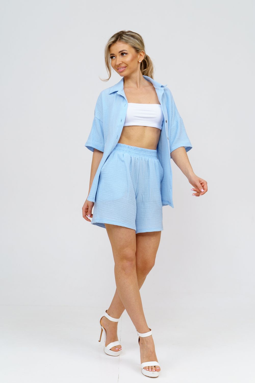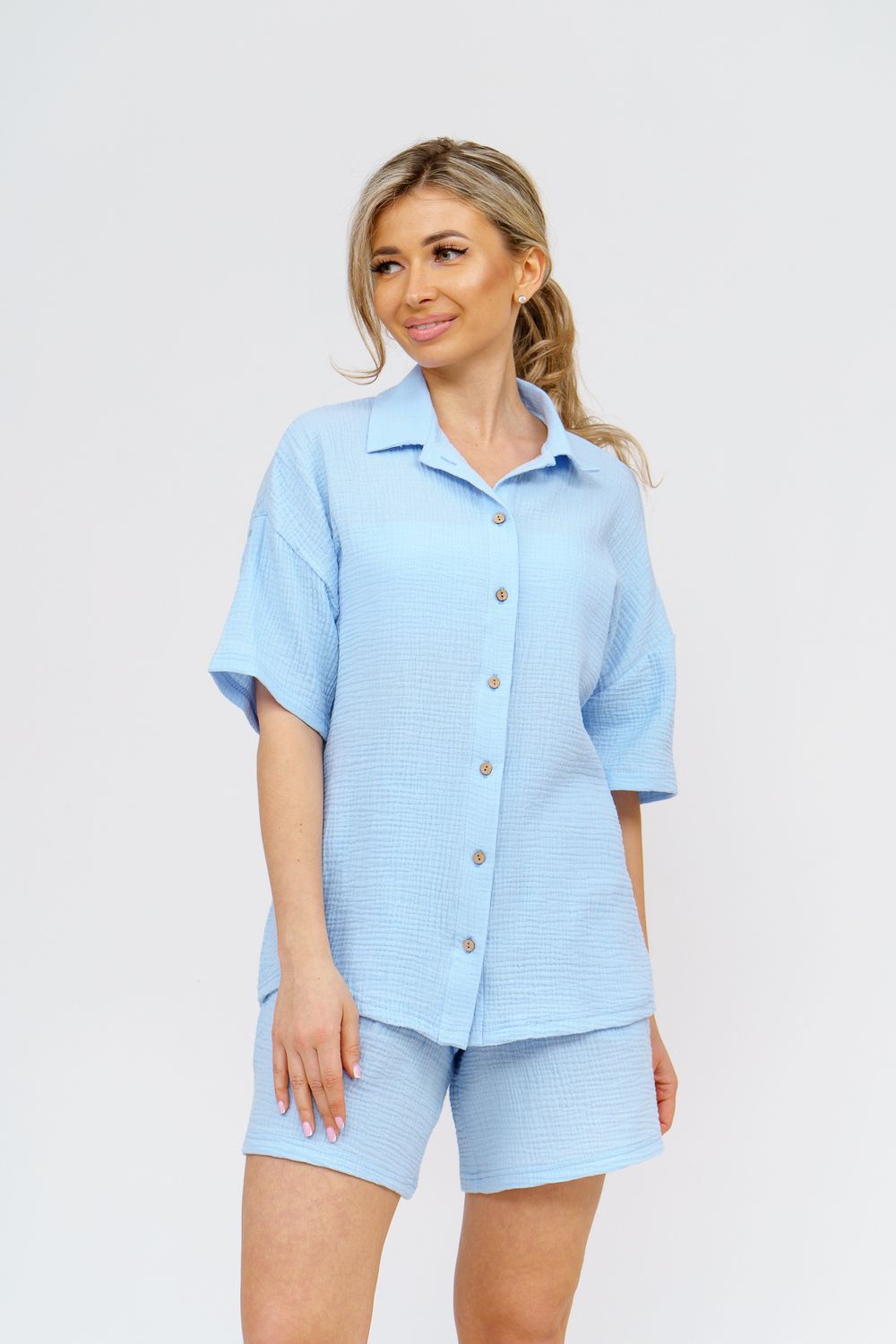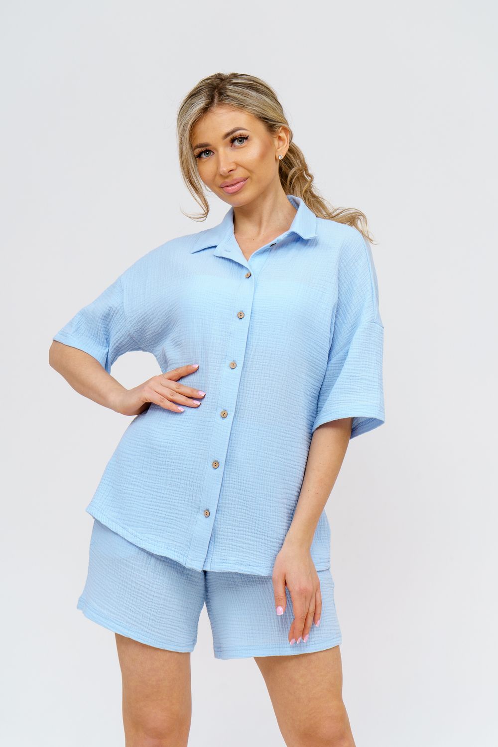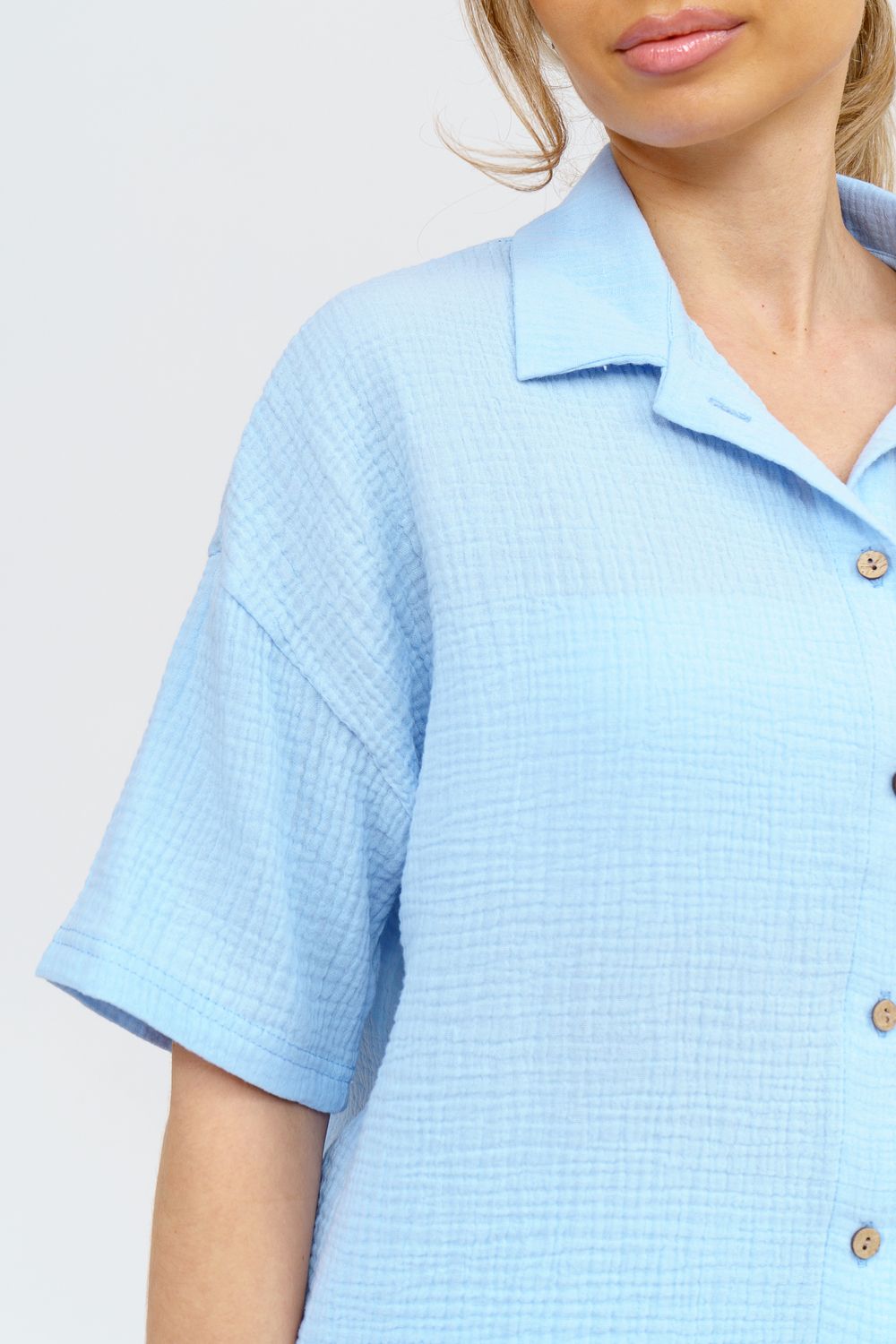 Модный костюм в стиле oversize выполнен из воздушного и приятного к телу 2-х слойного жатого муслина. Это одна из самых модных и популярных моделей сезона. Рубашка имеет слегка удлинённую спинку, спущенную линию плечевого шва, укороченный рукав, классический рубашечный воротник и планку на пуговках. Шорты бермуды с высокой посадкой создадут модный образ для любой девушки. Пояс шорт выполнен на специализированной поясной машине, что добавляет изделию большую износостойкость и эстетический внешний вид. По бокам, для удобства, расположены вместительные карманы. Изделие из муслина имеет много положительных качеств: нежность и лёгкость, высокая прочность и воздухопроницаемость. А модные цвета этого лета добавляют законченность деталям и определяют "must have" сезона. За счёт свободного фасона костюм можно носить с любым типом фигуры, отлично подойдёт для беременных женщин, а также кормящих мам. Женская хлопковый костюм идеален как для лета, так и для прохладного вечера. С помощью такого костюма Вы можете создать любой образ. А также отправиться на праздник, вечеринку или на прогулку, на пляж или провести незабываемый вечер дома. Модель такого плана идеально подойдёт и в качестве подарка для себя и своих любимых! Стирать муслиновые вещи нужно только в теплой воде при температуре не выше 40°С. У нас Вы также можете приобрести только рубашку из такого материала- модель 36766 и создать свой неповторимый образ! Ориентируясь по таблице замеров, обратите внимание, что замеры длины рукава проводились от точки основания шеи.