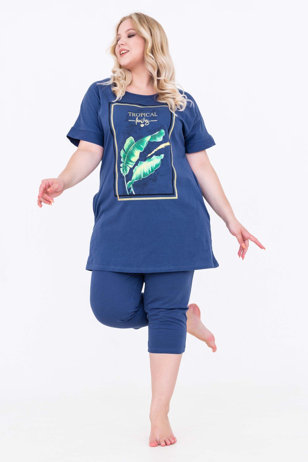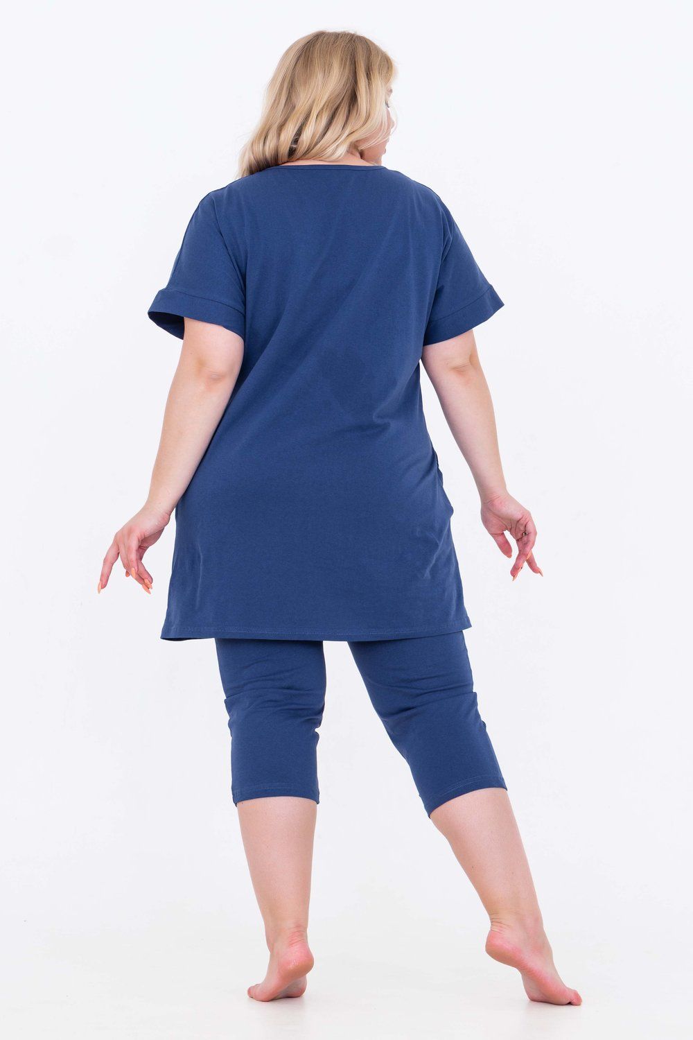 Домашний костюм женский изготовлен из ткани кулирка - мягкого и гладкого трикотажного полотна из хлопка. Костюм женский для дома и отдыха состоит из удлиненной футболки и бридж. Футболка прямого кроя, горловина круглая, обработана окантовкой, по бокам карманы. Рукав короткий. На полочке выполнен принт. За счет свободного кроя, брюки очень удобны и комфортны в эксплуатации.