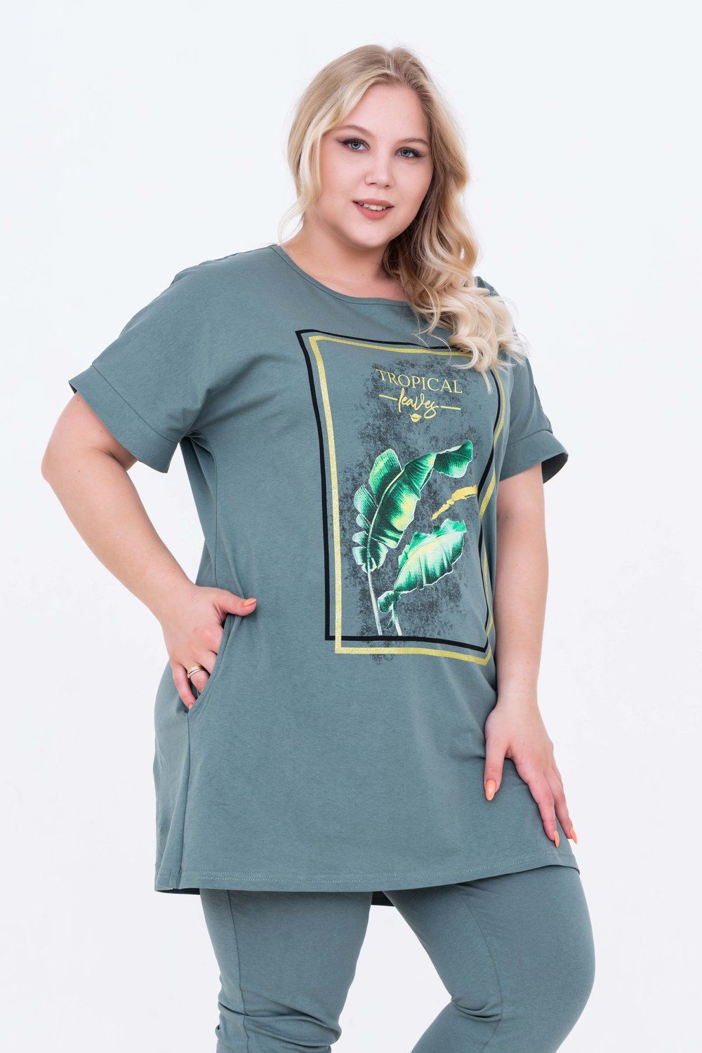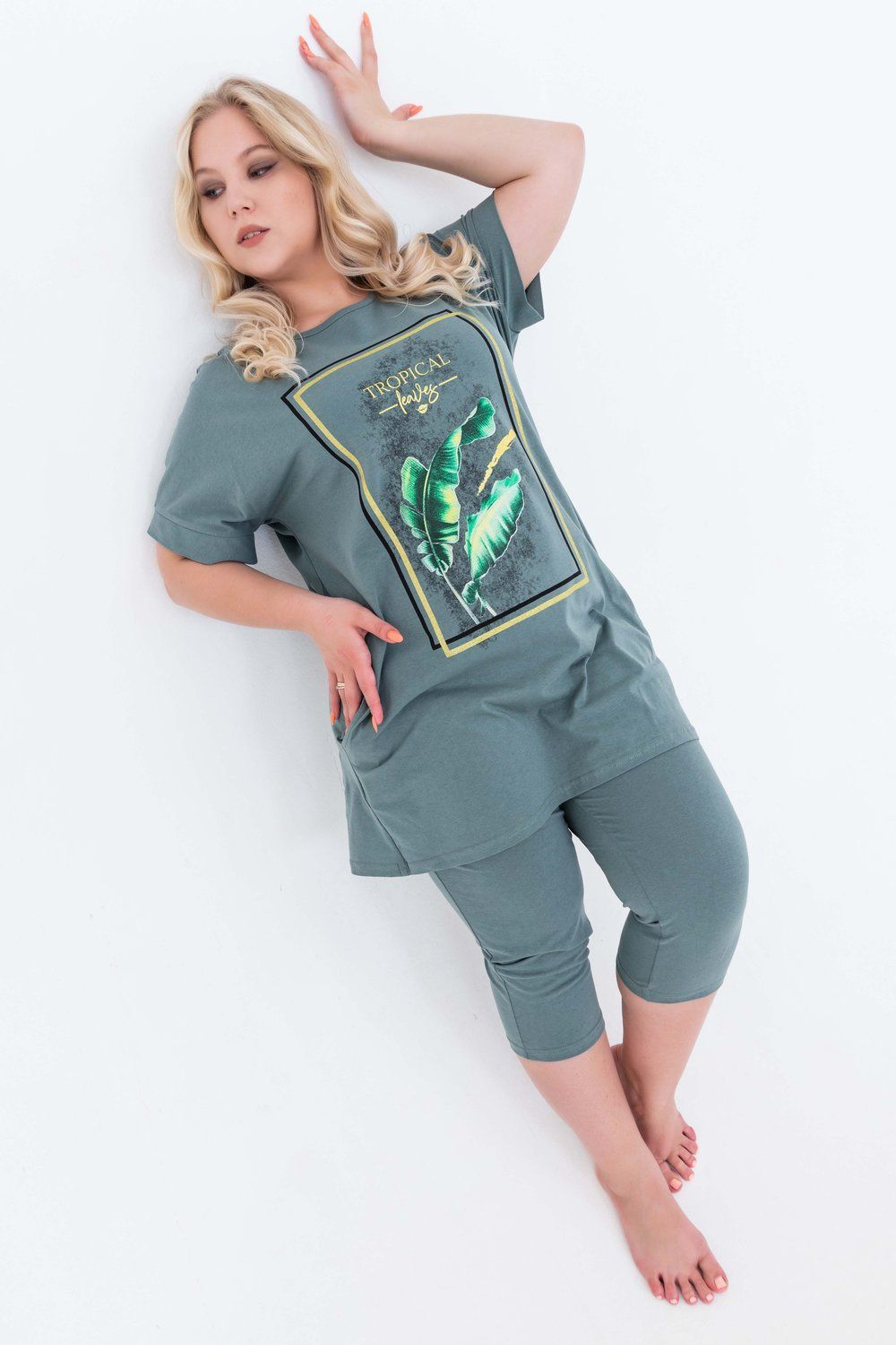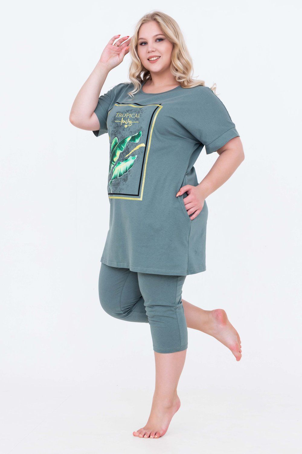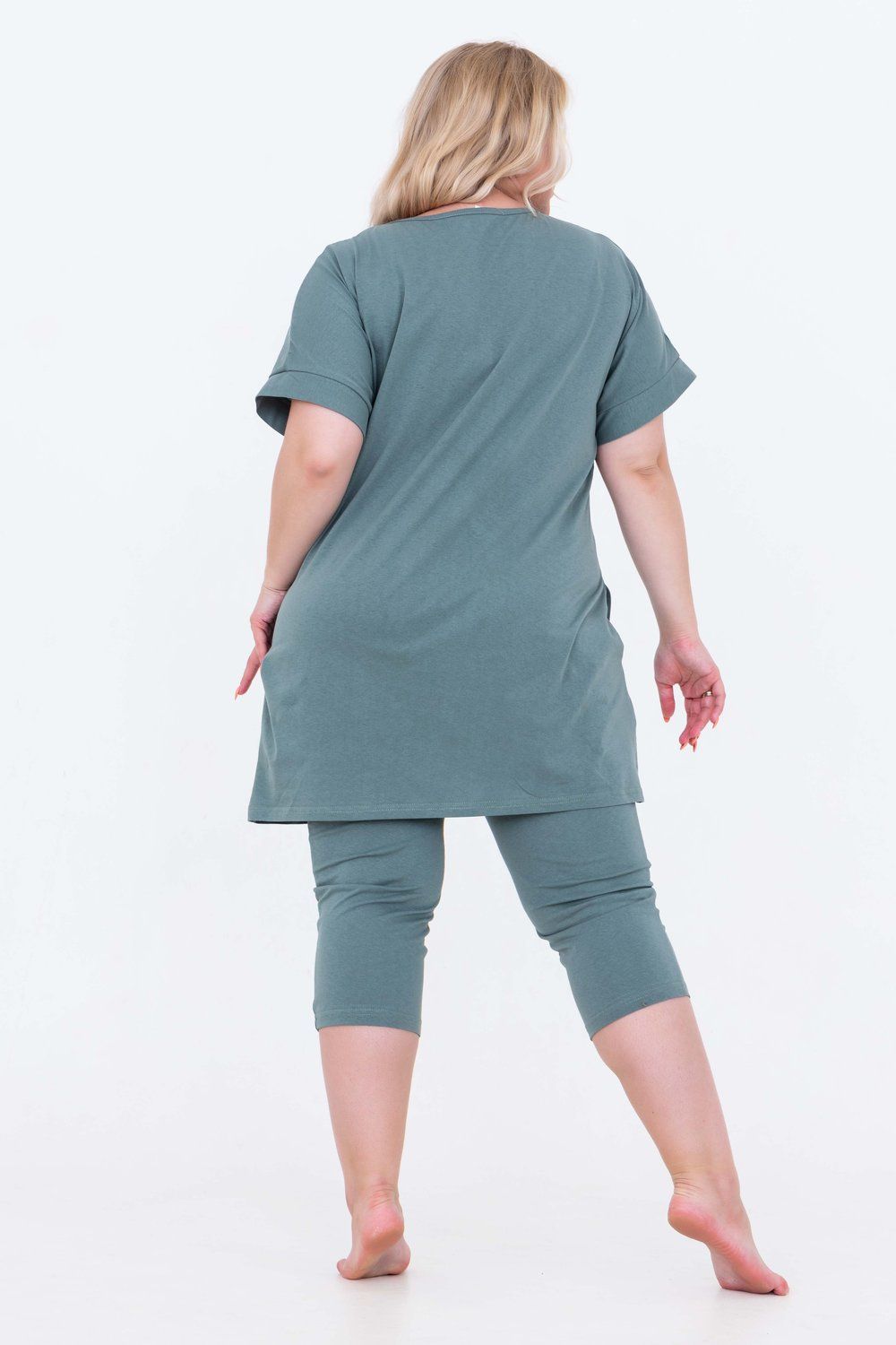 Домашний костюм женский изготовлен из ткани кулирка - мягкого и гладкого трикотажного полотна из хлопка. Костюм женский для дома и отдыха состоит из удлиненной футболки и бридж. Футболка прямого кроя, горловина круглая, обработана окантовкой, по бокам карманы. Рукав короткий. На полочке выполнен принт. За счет свободного кроя, брюки очень удобны и комфортны в эксплуатации.