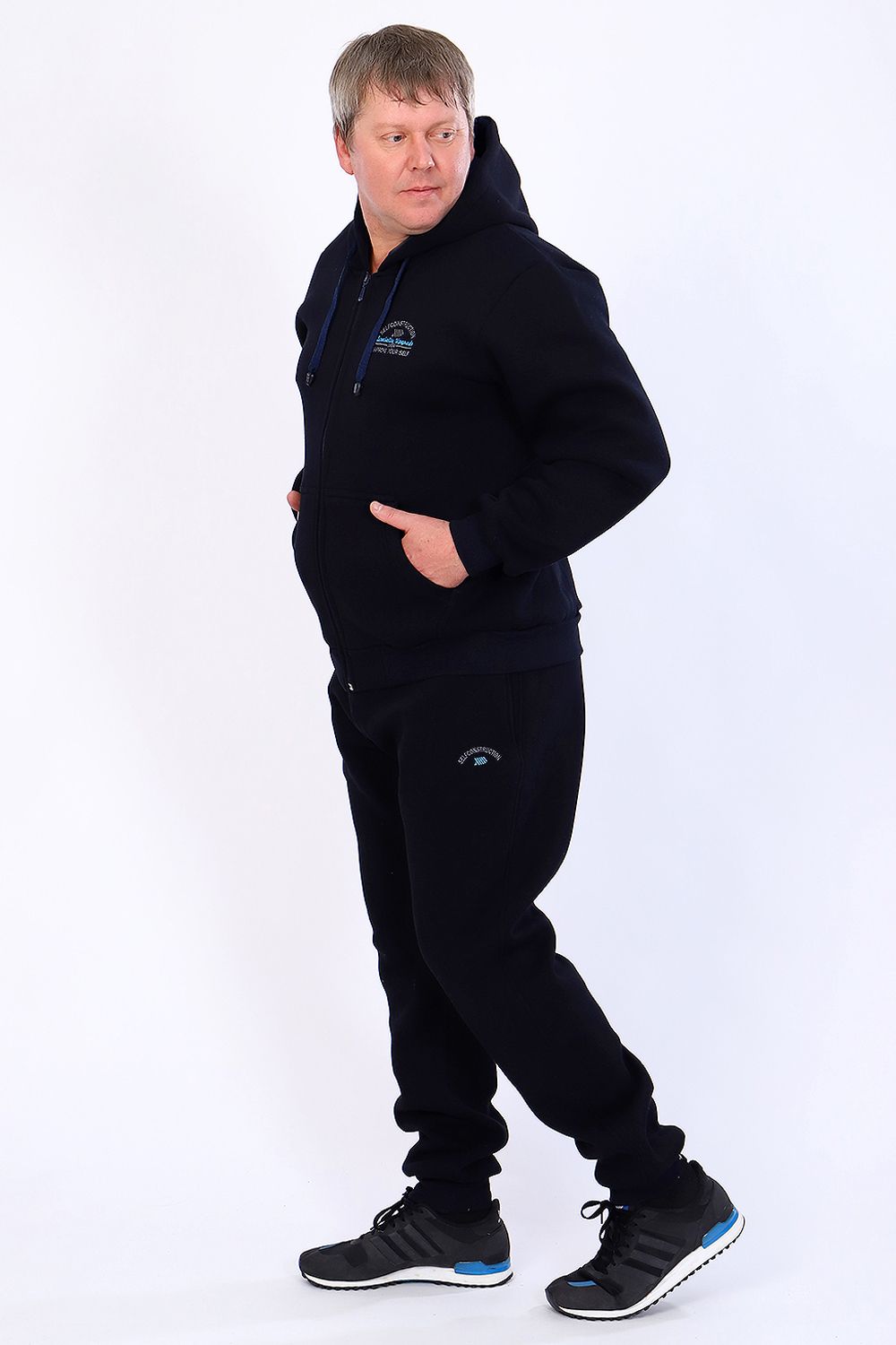 Теплый мужской костюм толстовка + брюки. Толстовка с капюшоном, застегивается на молнию, на животе карманы, рукава и низ отделаны манжетами. Брюки с карманами, внизу манжеты. Несколько вариантов расцветки. Размеры от 46 до 58.