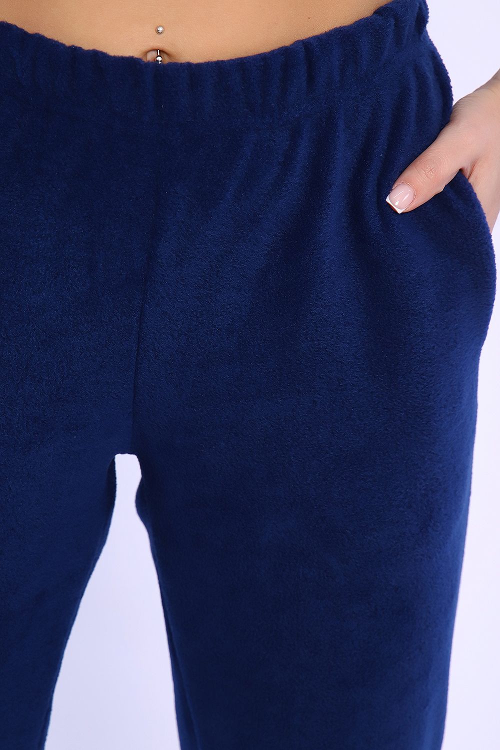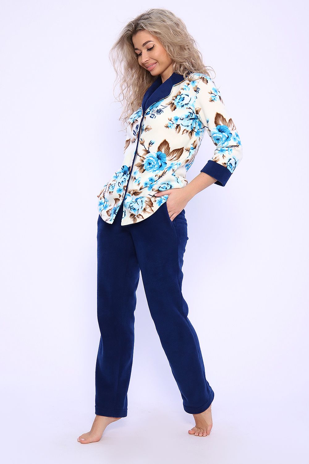 Домашний женский костюм из мягкого, теплого флиса. Кофта полуприлегающего силуэта, застегивается на петли и пуговицы. Длиной до бедер с фигурной линией низа. Рукав втачной, длиной 3/4 с манжетом из отделочной ткани. Воротник пиджачного типа с закругленными углами, из отделочной ткани. Борта, воротник и лацканы отстрочены. Домашние брюки прямого кроя с вместительными карманами в боковом шве, комфортный пояс на резинке, располагается на линии талии, длина брюк ниже щиколотки.