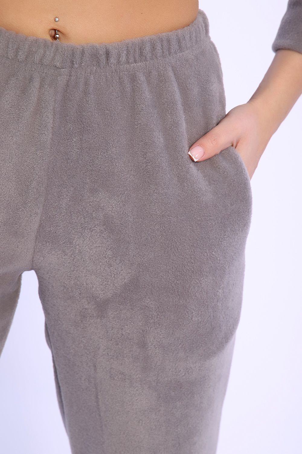 Домашний женский костюм из мягкого, теплого флиса. Кофта полуприлегающего силуэта, застегивается на петли и пуговицы. Длиной до бедер с фигурной линией низа. Рукав втачной, длиной 3/4 с манжетом из отделочной ткани. Воротник пиджачного типа с закругленными углами, из отделочной ткани. Борта, воротник и лацканы отстрочены. Домашние брюки прямого кроя с вместительными карманами в боковом шве, комфортный пояс на резинке, располагается на линии талии, длина брюк ниже щиколотки.