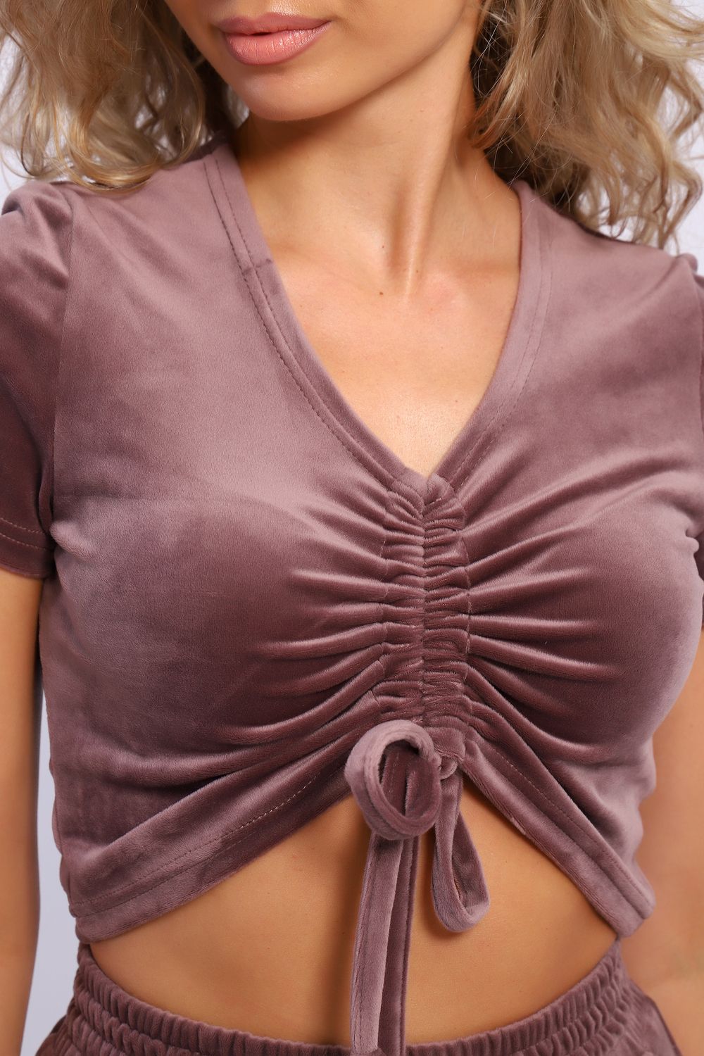 Костюм выполнен из мягкого велюра. Нежный материал придает изделию благородный лоск, а сборка на завязках на груди топа и складки на юбке-шортах образуют роскошные переливы. Облегающий крой топа подчеркнет изгибы вашей фигуры, а укороченная длина акцентирует изящную талию. Юбка-шорты позволяет чувствовать себя уверенно и комфортно, не сковывает движения. Имеет глубокие карманы, позволяющие взять с собой всё необходимое. Юбка-шорты на резинке оригинального фасона, сочетается с любым верхом. Костюм подходит для любых мероприятий, от прогулки по городу, на природе, до танцев и спорта.