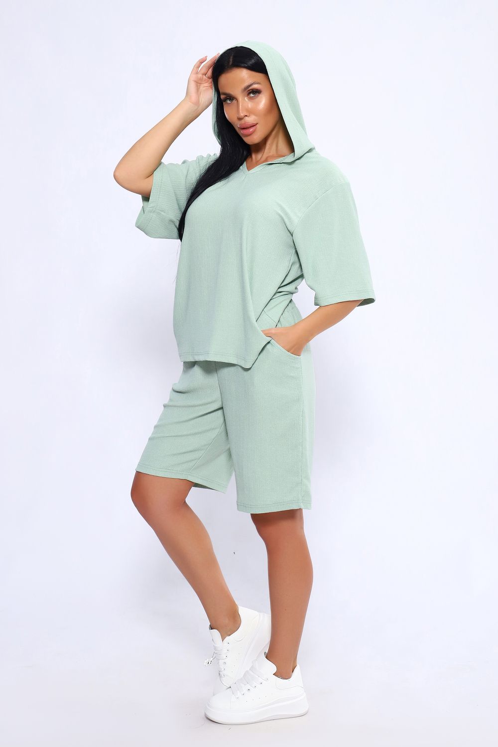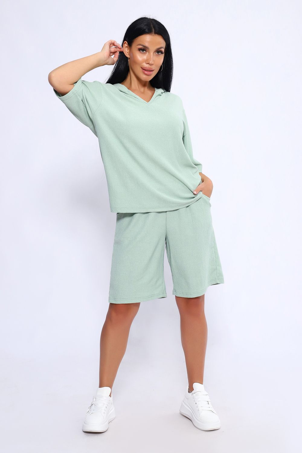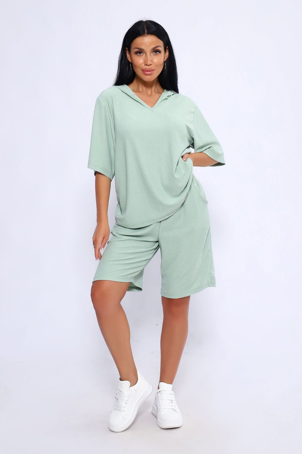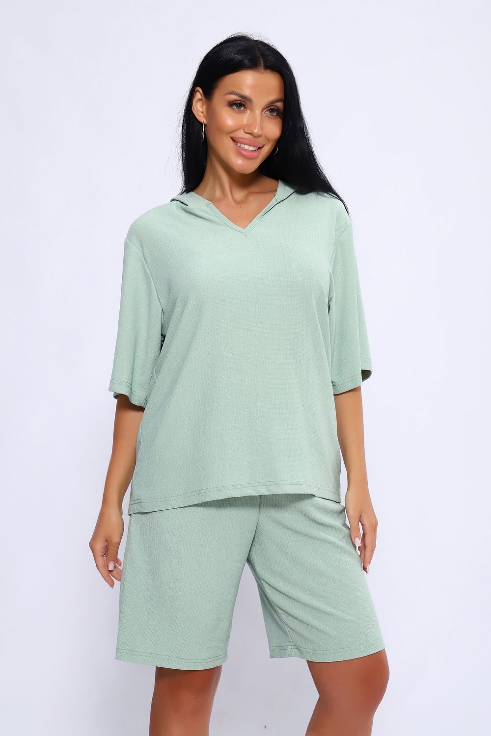 Женский летний костюм из интересного легкого, жатого материла в пастельных тонах. Ткань износостойкая, с приятными тактильными свойствами. Комплект состоит из кофты свободного кроя с капюшоном и шорт на эластичной резинке шириной 3 см., в боковых швах расположены карманы, длина шорт чуть выше колена. Комплект подходит как для отдыха дома, так и более активного времяпрепровождения как на природе, так и в городе. В нем будет очень удобно находиться и выполнять привычные для вас действия. По спинке кофты может быть шов. На фото модель представлена в 48 размере.