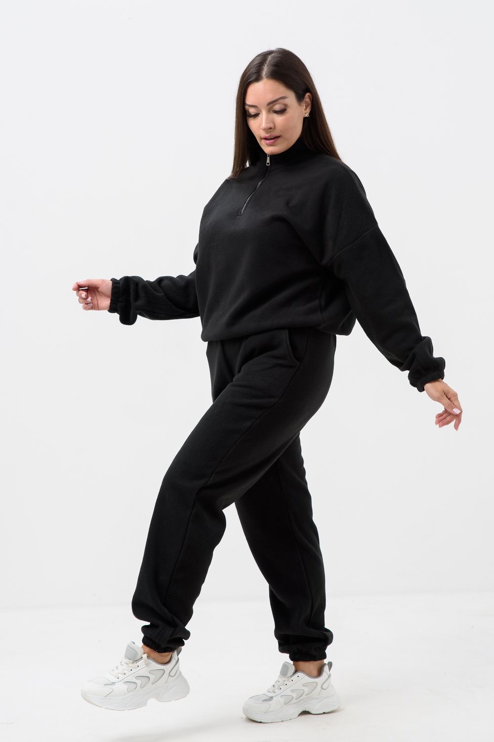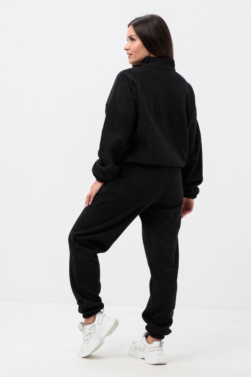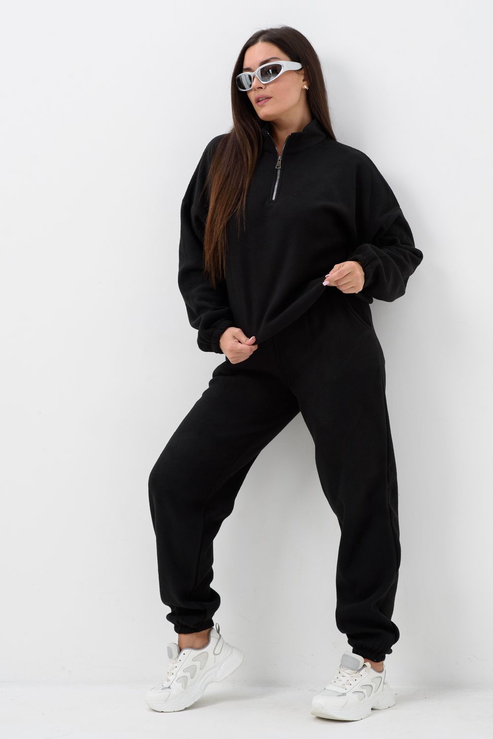 Женский спортивный костюм из теплой ткани - флис, прекрасный выбор на прохладную погоду, Верх - толстовка с горлом-стойкой и короткой молнией, понизу и на манжетах резинка, низ - брюки с карманами, пояс и низ штанов на резинке. Двойка подойдет для прогулок и дома.
