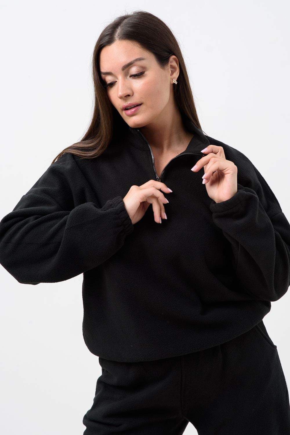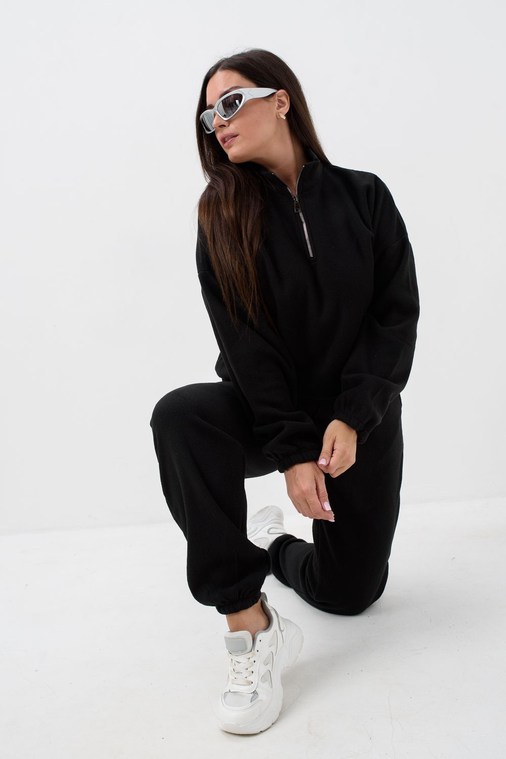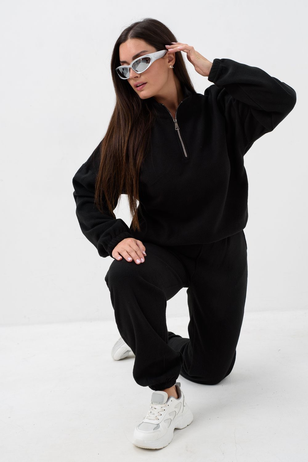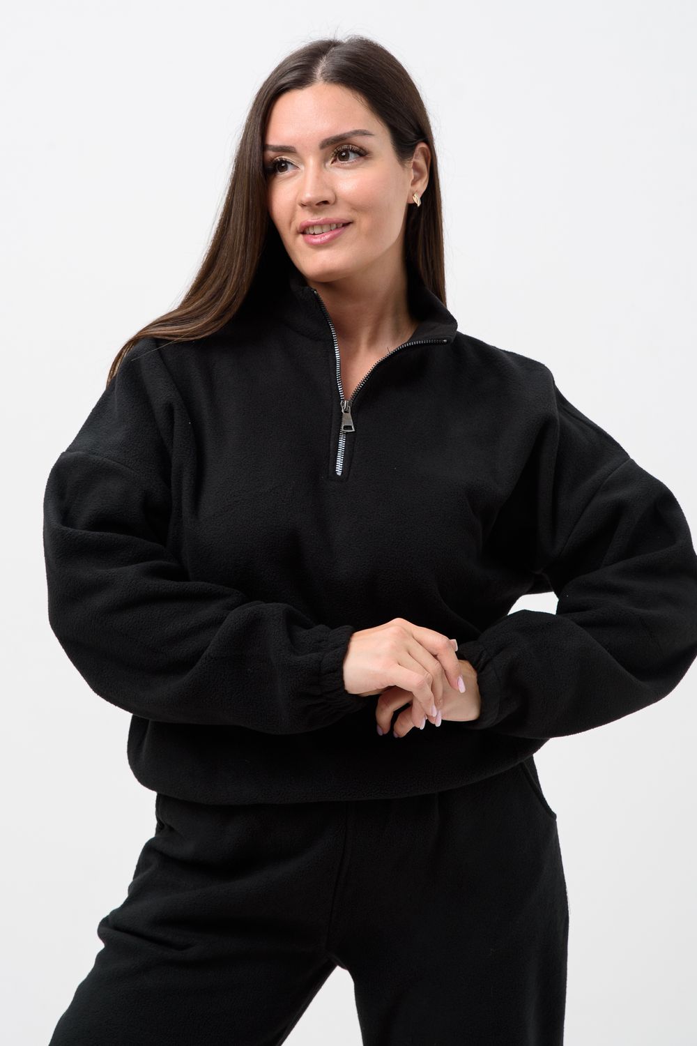 Женский спортивный костюм из теплой ткани - флис, прекрасный выбор на прохладную погоду, Верх - толстовка с горлом-стойкой и короткой молнией, понизу и на манжетах резинка, низ - брюки с карманами, пояс и низ штанов на резинке. Двойка подойдет для прогулок и дома.