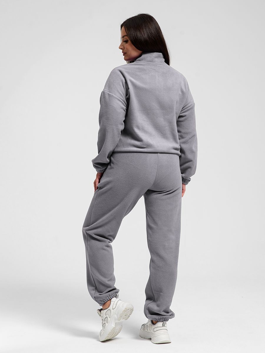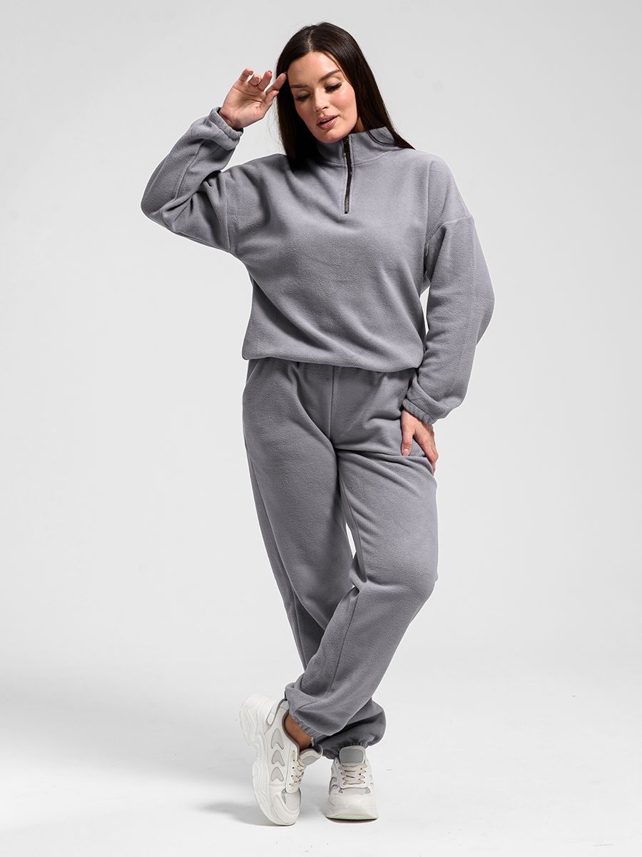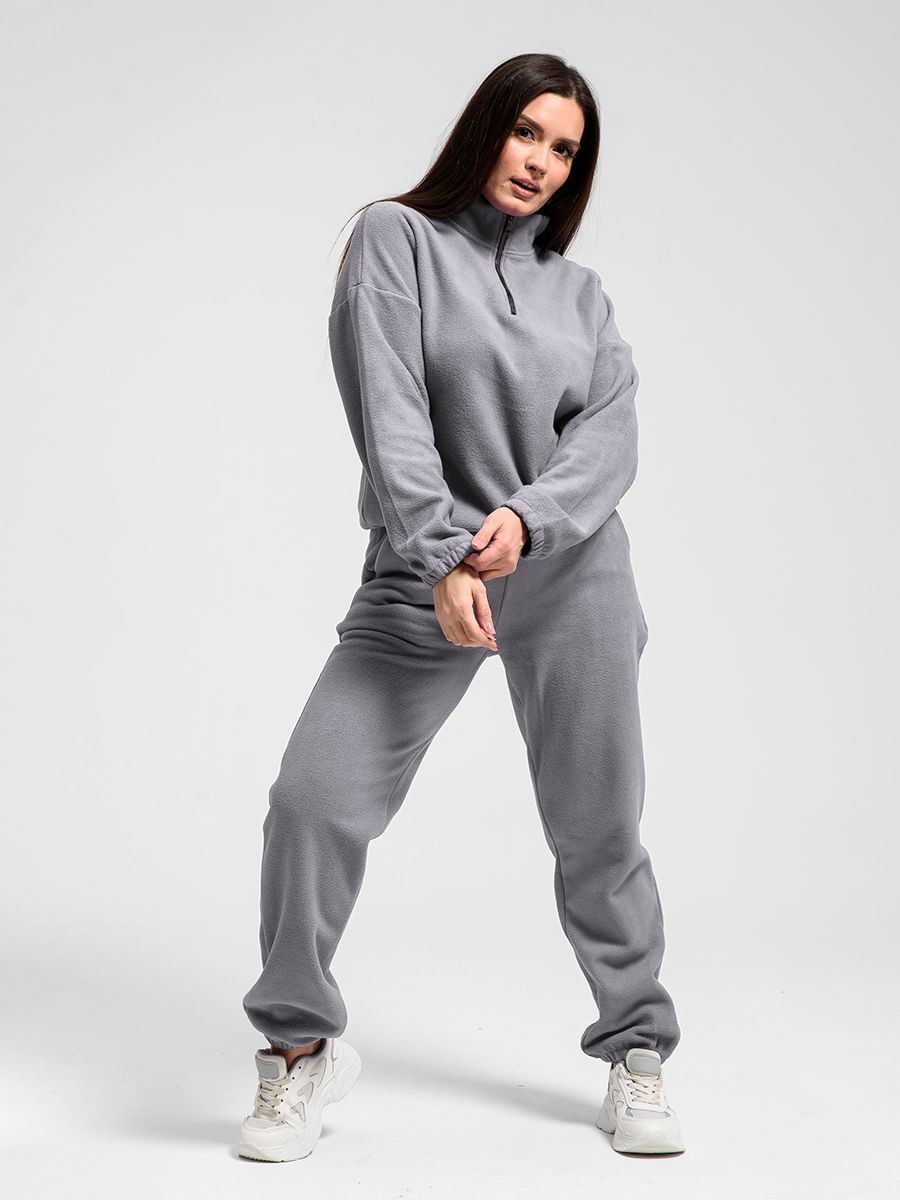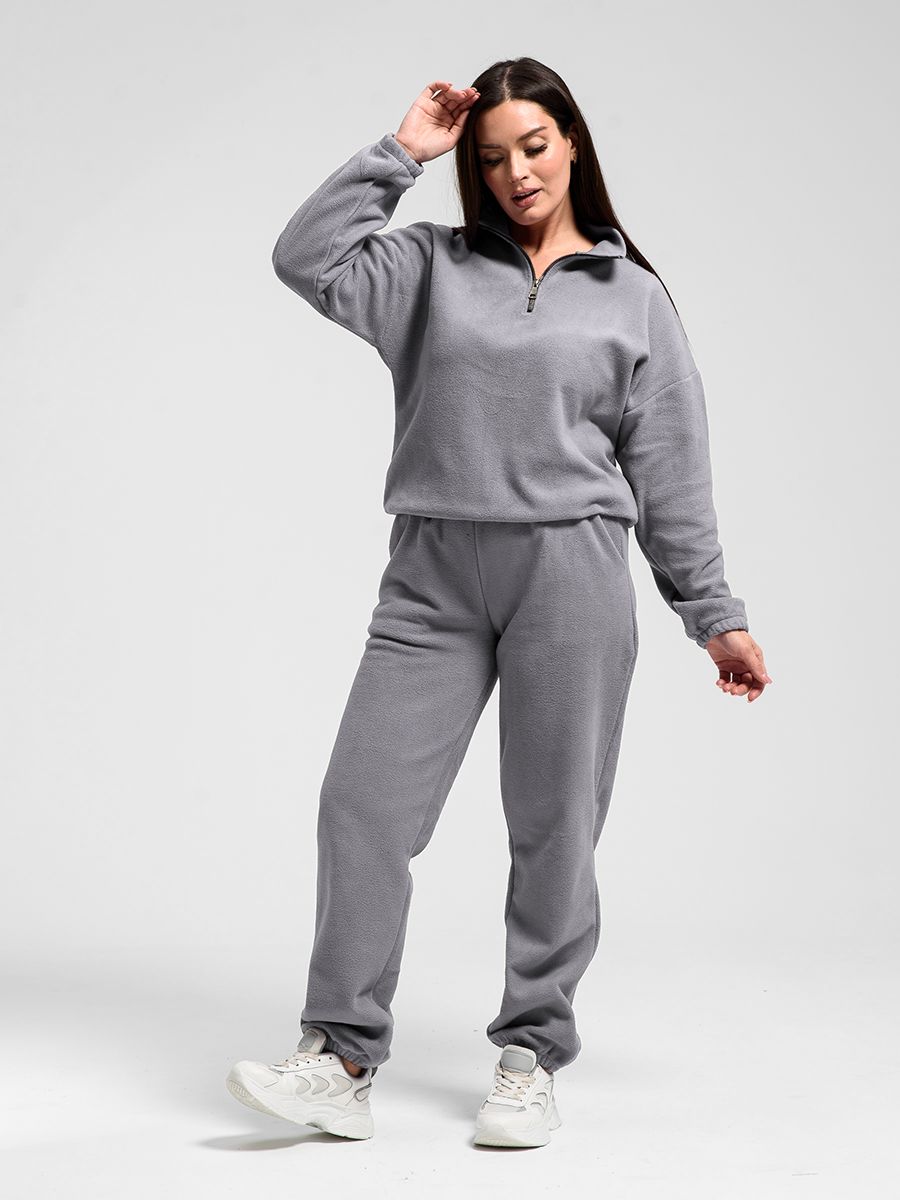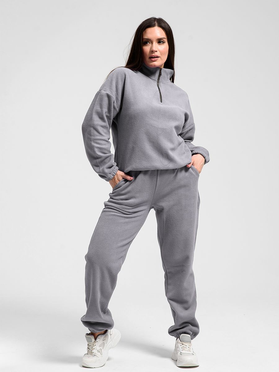 Женский спортивный костюм из теплой ткани - флис, прекрасный выбор на прохладную погоду, Верх - толстовка с горлом-стойкой и короткой молнией, понизу и на манжетах резинка, низ - брюки с карманами, пояс и низ штанов на резинке. Двойка подойдет для прогулок и дома.