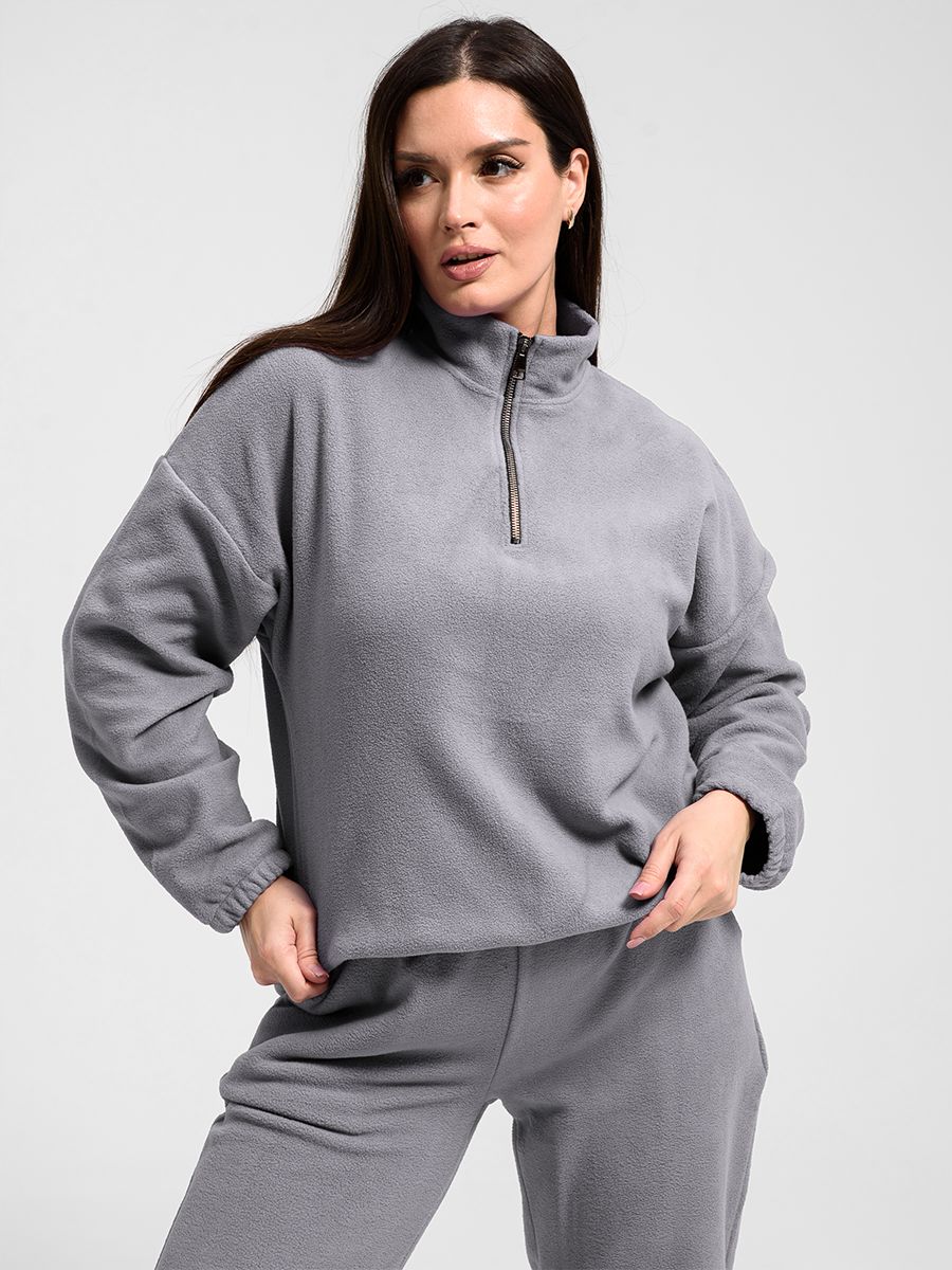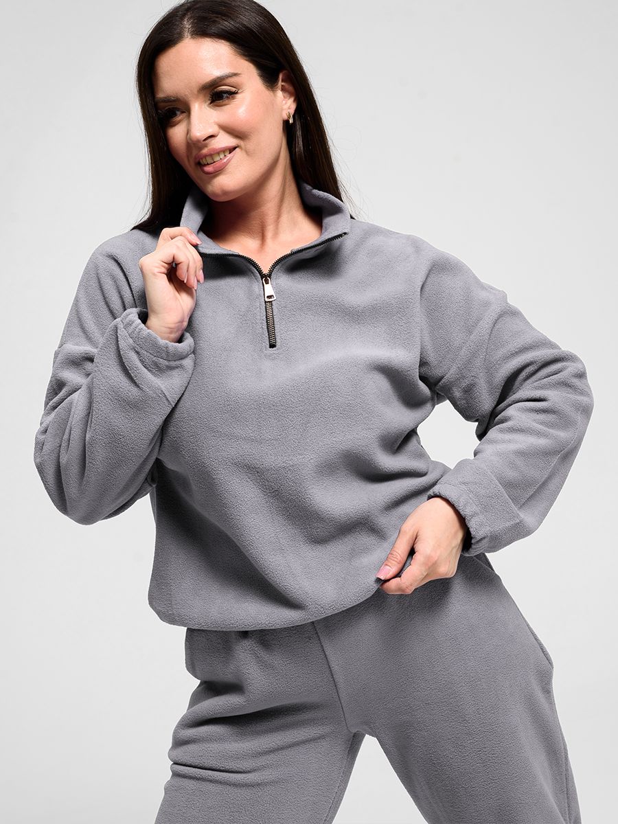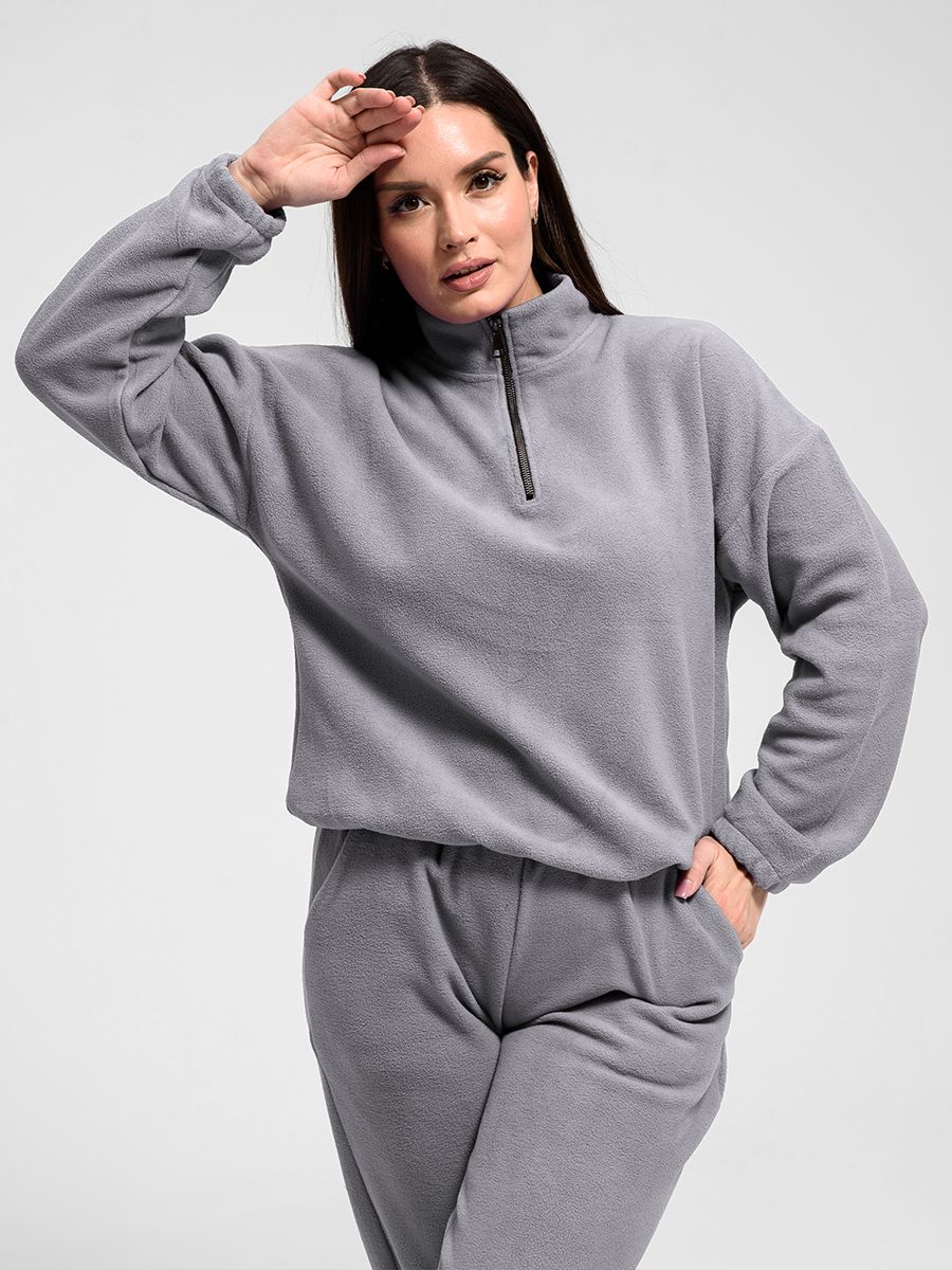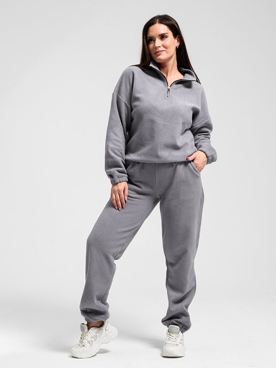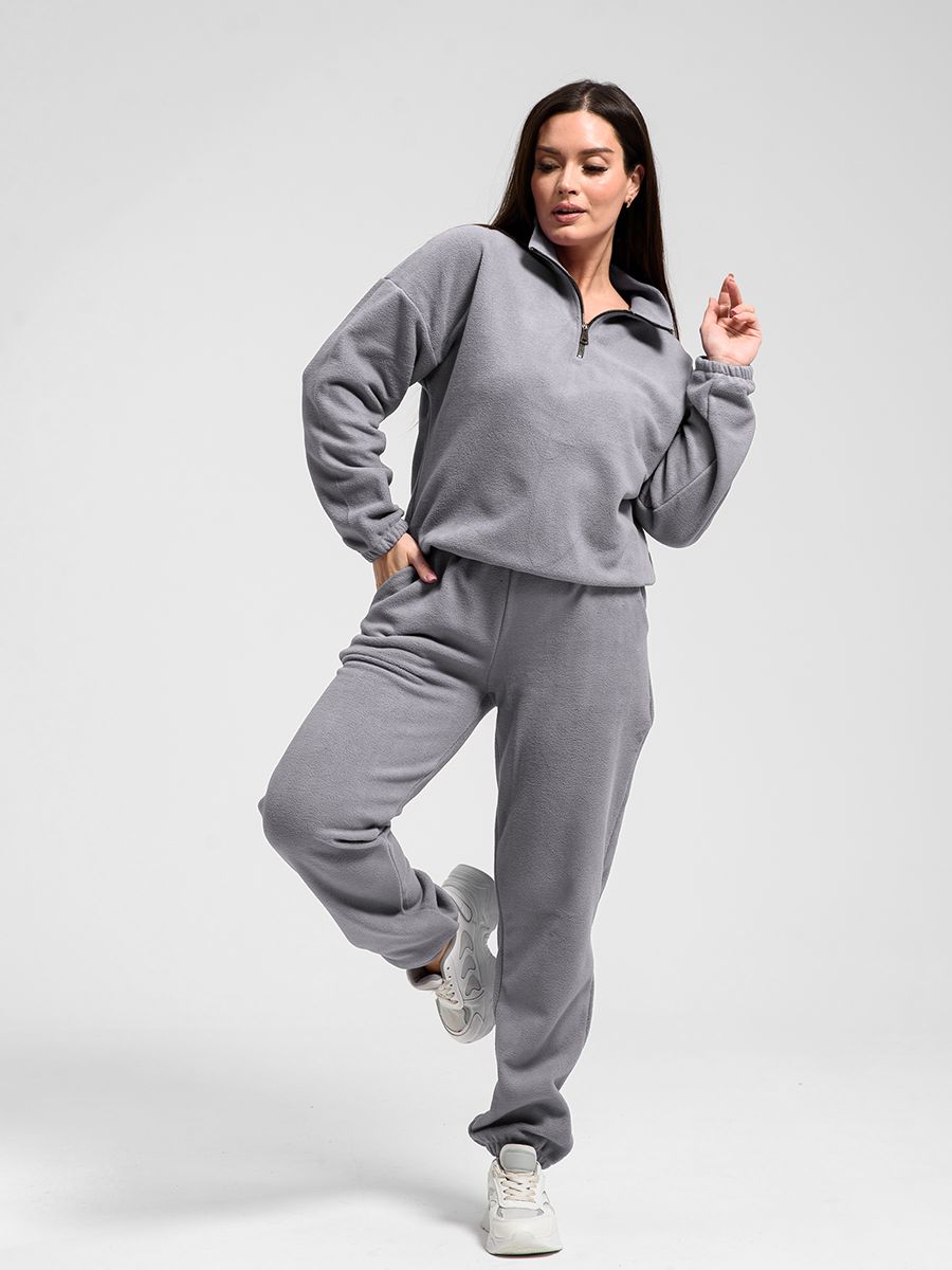 Женский спортивный костюм из теплой ткани - флис, прекрасный выбор на прохладную погоду, Верх - толстовка с горлом-стойкой и короткой молнией, понизу и на манжетах резинка, низ - брюки с карманами, пояс и низ штанов на резинке. Двойка подойдет для прогулок и дома.