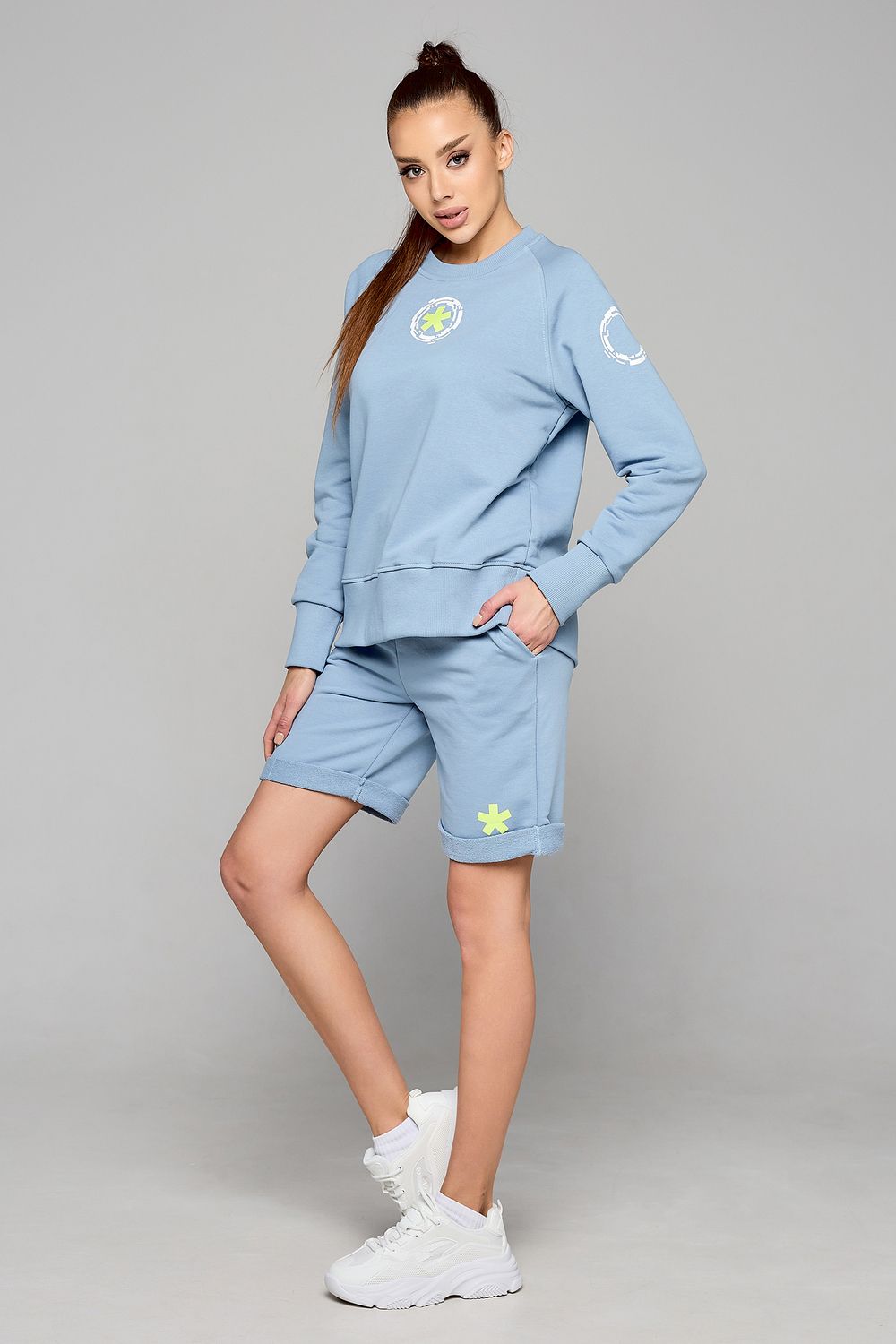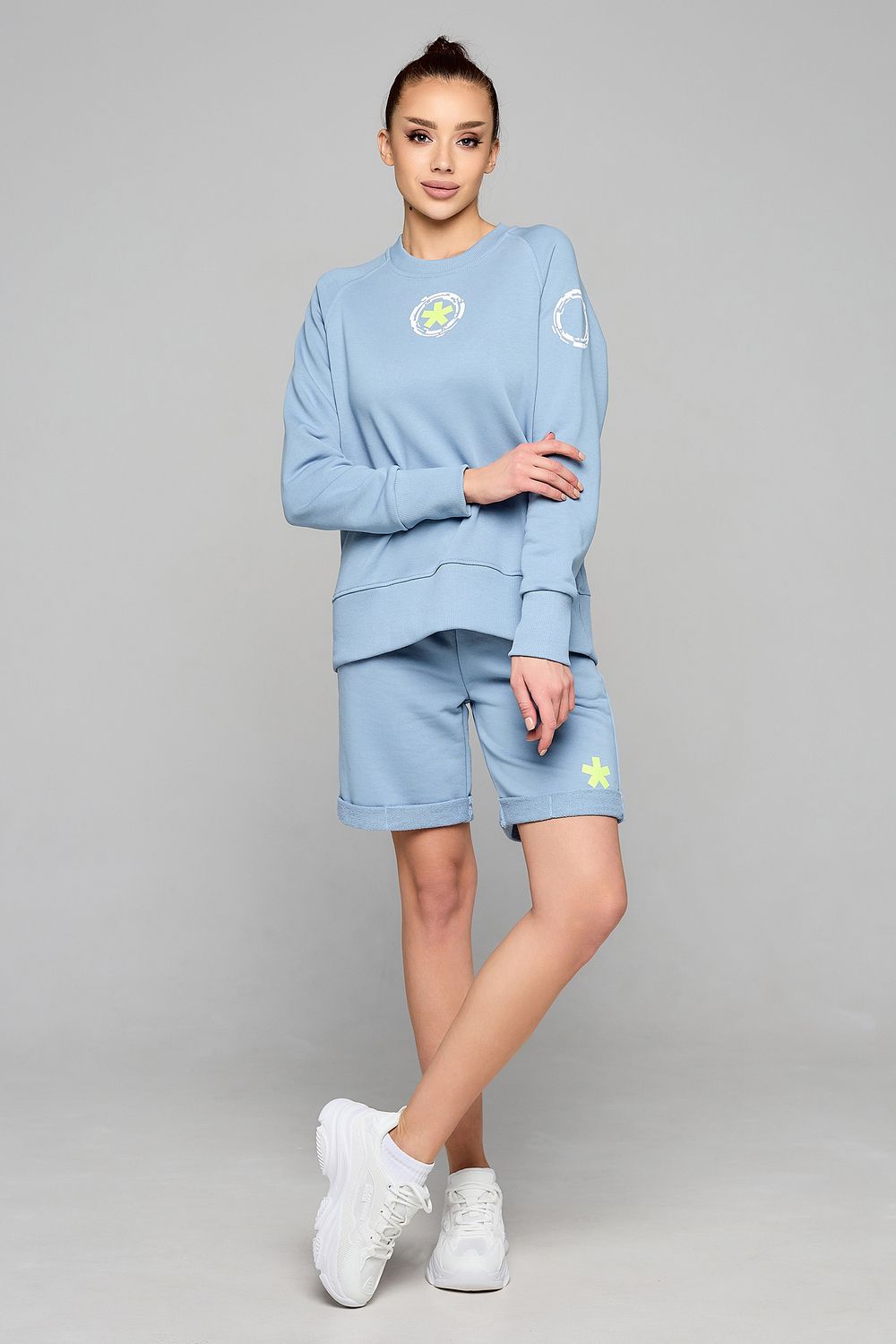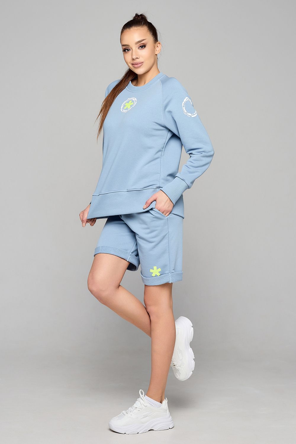 Этот стильный комплект одежды прекрасно подходит для активной и модной женщины. Он сочетает в себе комфорт и функциональность спортивного костюма, а также легкость и свободу летних нарядов. Этот спортивный костюм женский, в котором вы будете чувствовать себя уверенно и стильно в любых условиях. Комплект состоит из шорт и свитшота.