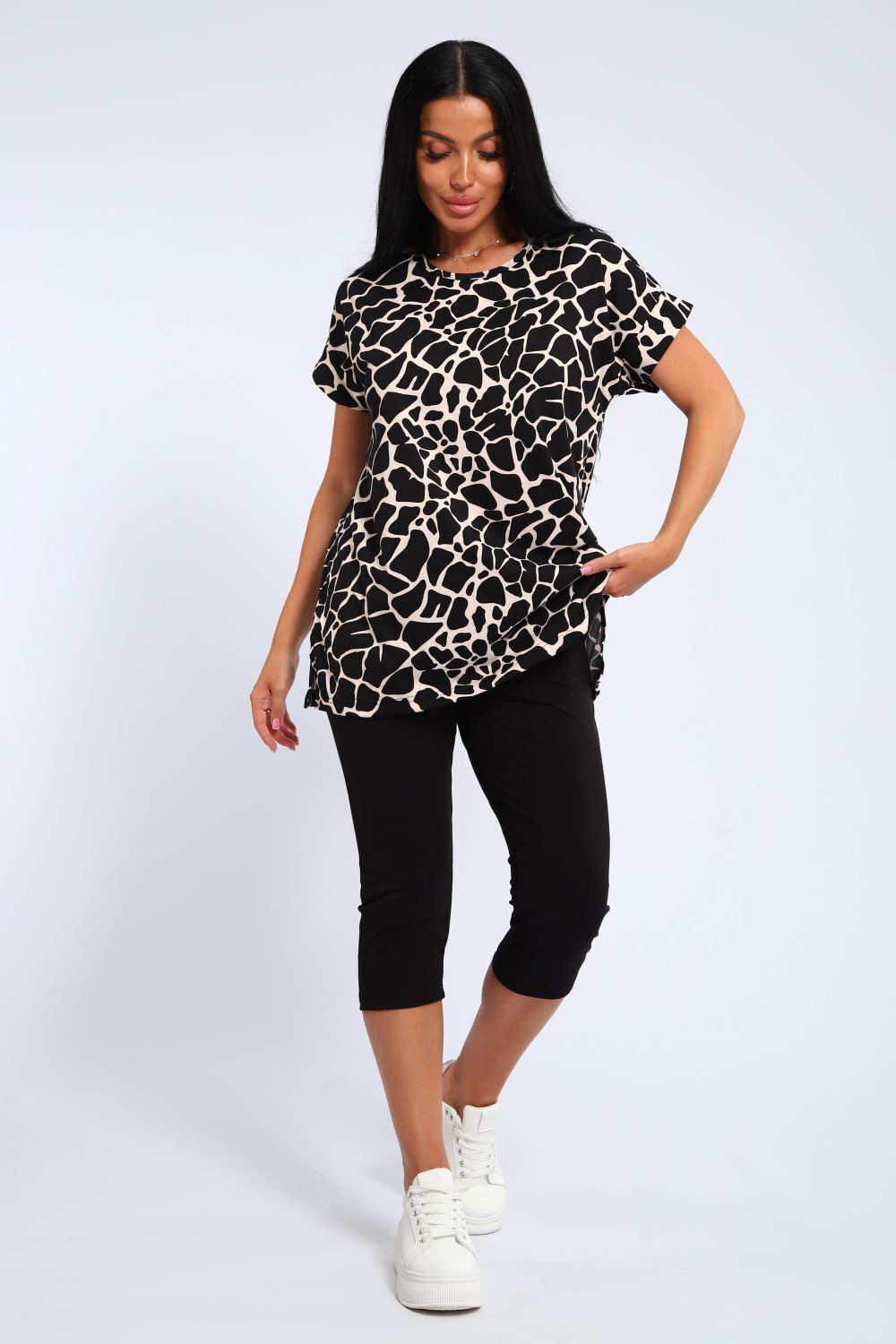 Уютный комплект с бриджами: туника из 100% хлопка. Крой прямой, разрезы по бокам, рукав короткий с манжетом. Мягкие бриджи с добавлением лайкры (95% хлопок, 5% лайкра), облегающие по ноге, на резинке. Прилегающие бриджи и свободная туника - идеальное сочетание для любого типа фигуры!