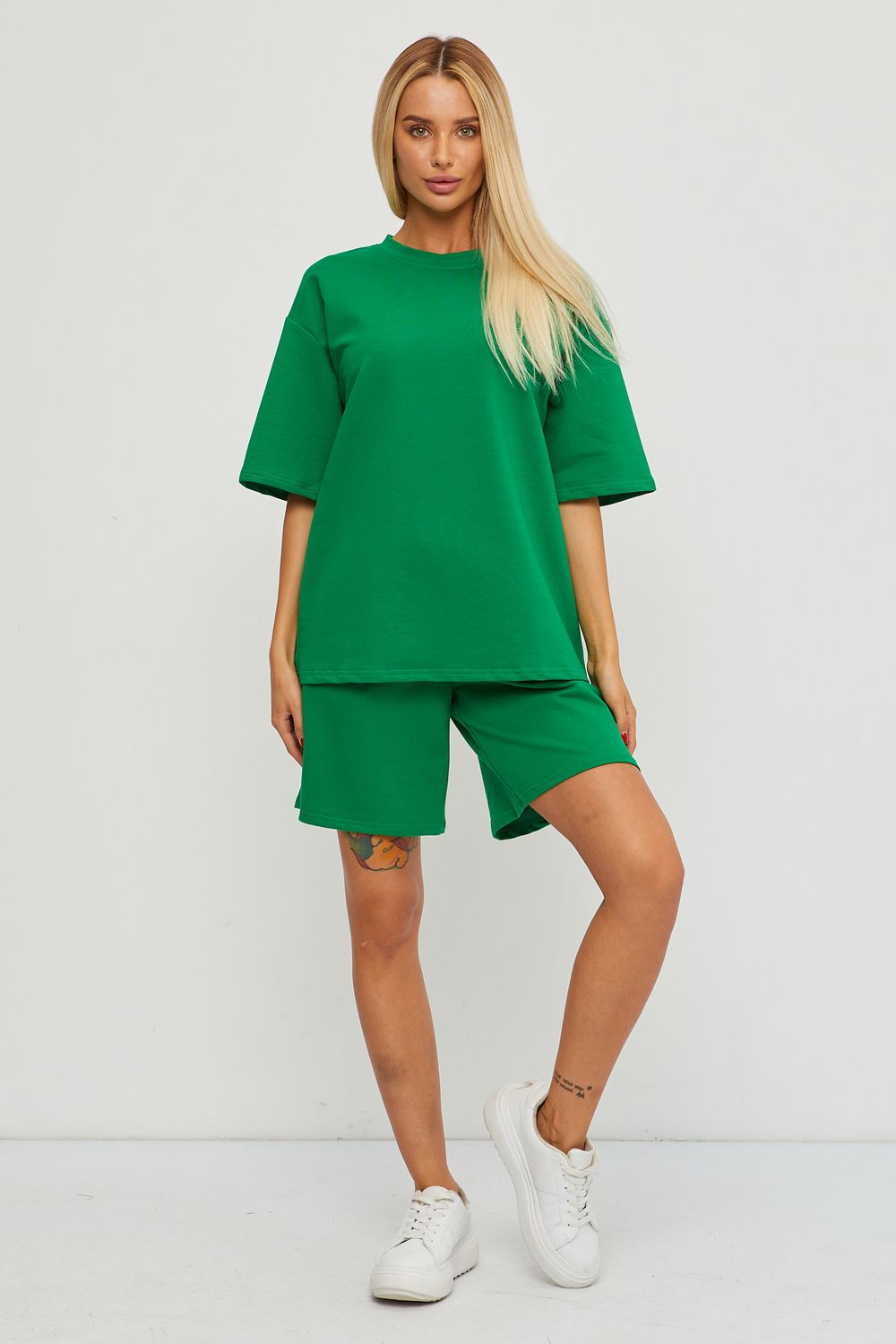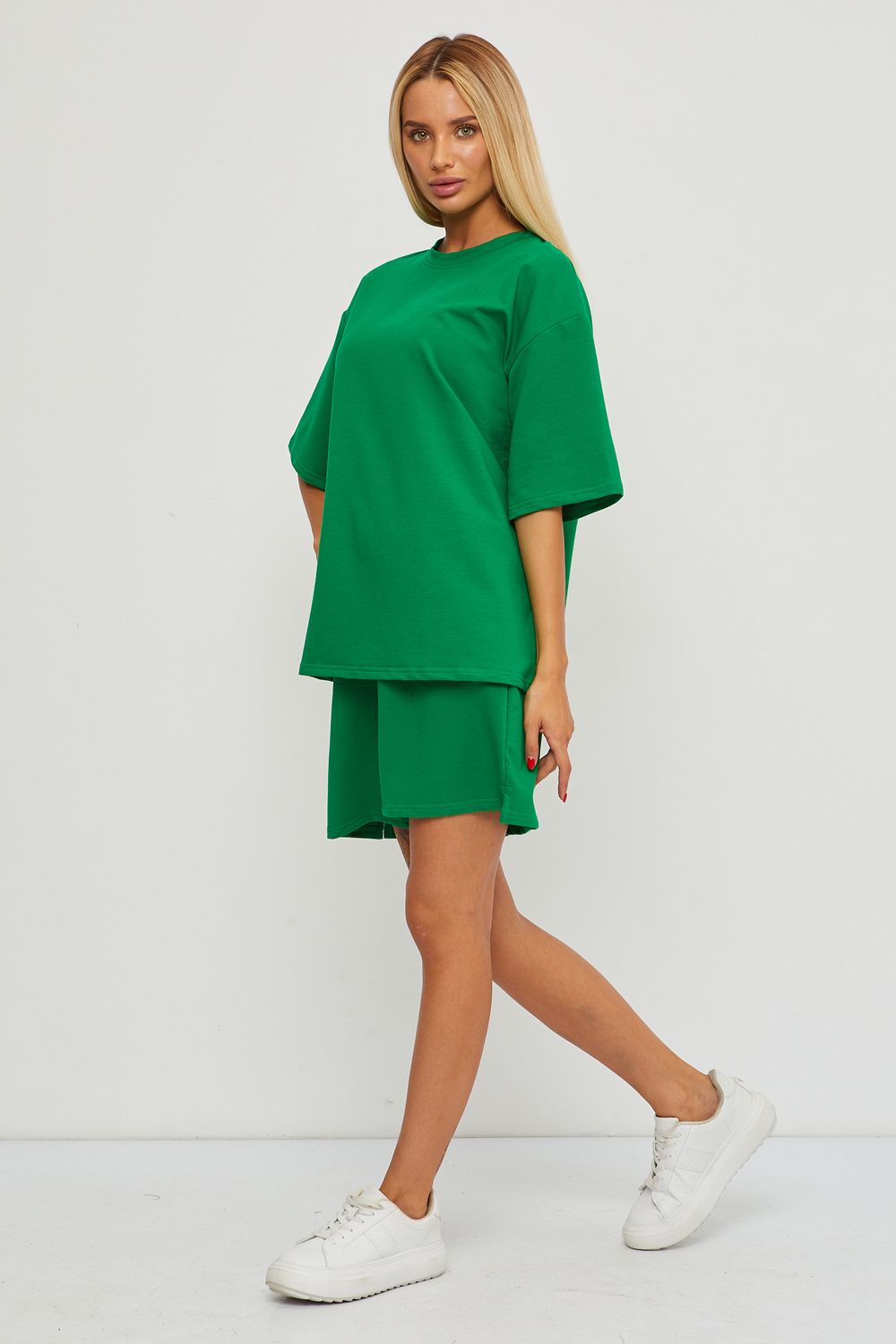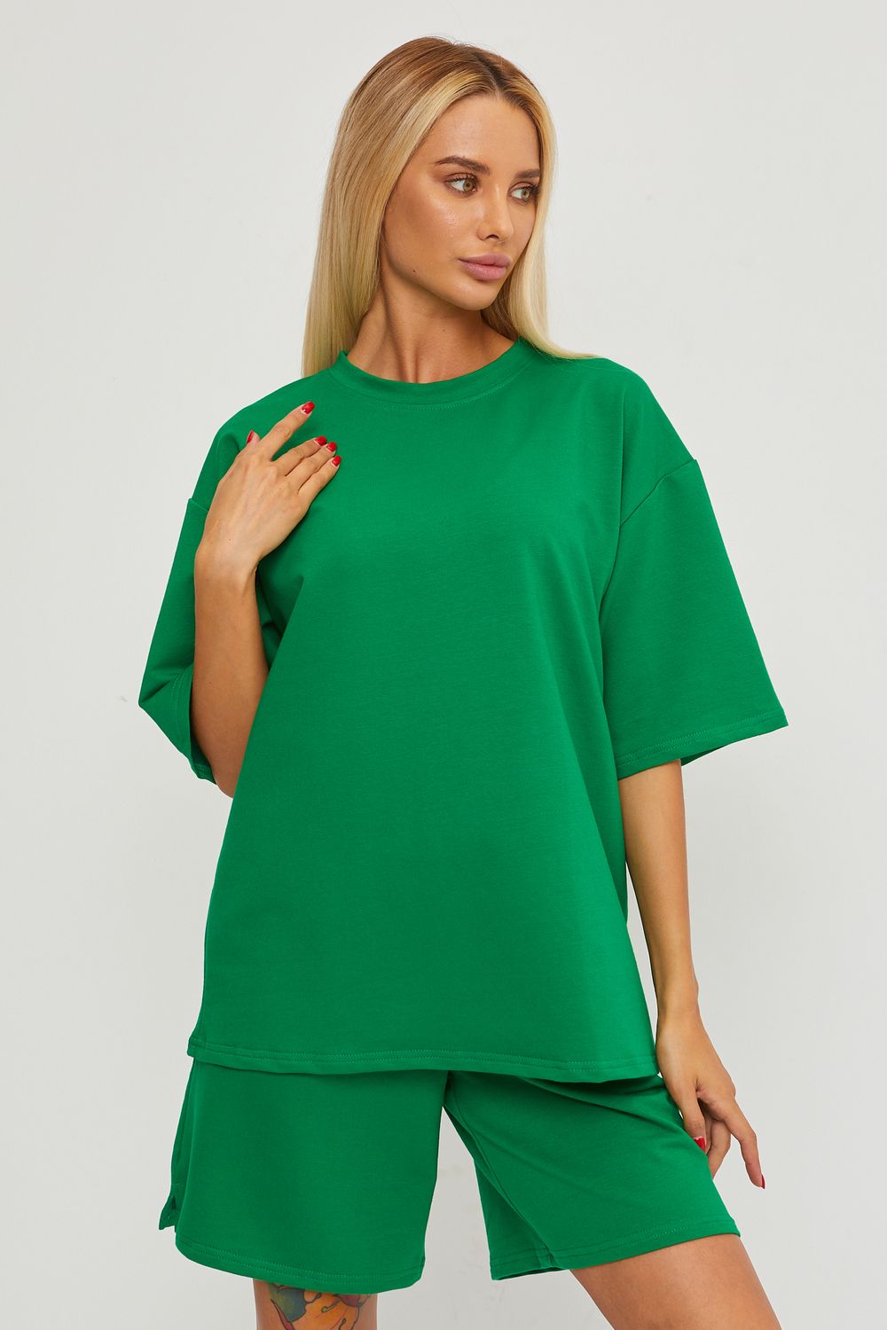 Женский спортивный летний костюм выполнен из плотной ткани - хлопок: футер 2х нитка петельчатый, качество премиум Пенье . Комплект с шортами и футболкой- это настоящий ХИТ этого сезона. Свободная футболка оверсайз с коротким рукавом и шорты свободного кроя выше колена на широкой резинке высокой посадки, внизу с разрезами на внешней стороне материала и боковыми карманами- хорошая замена теплому или утепленному брючному костюму, платью на лето. Вы сможете носить современный, модный и комфортный костюм, как спортивную одежду на тренировки, спорт, фитнес и йогу и как спортивная школьная форма для девочек и мальчиков подростков. а также это удобная одежда для дома и загородного отдыха. Вам не будет слишком жарко, из-за сочетания дышащего материала и свободного кроя в спортивном костюме. Футболка идеально сочетается с джинсами, юбкой и брюками, а шорты с лонгсливом, свитшотом, топом. Выберите для себя удобный размер – изделие отлично сядет на любой тип фигуры и ростовку. А также трикотажный материал, комфортный крой и выверенные лекала сделают данную модель незаменимым для полных девушек (плюссайз), беременных мам, женщин, девочек и подростков. Наш костюм универсален и для модниц с пышными формами, а также высоких и невысоких. Вы сможете использовать его как повседневную вещь на работу и учебу, на прогулку и отдых. Стильный летний комплект подойдет для повседневной носки, домашней одежды, прогулок с собакой, занятий спортом в тренажерном зале как в летний так и в зимний период, также - для игры в теннис, волейбол, баскетбол. Чтобы сохранить первозданный вид костюма-двойки, рекомендуем соблюдать правила ухода: первая стирка отдельно от других вещей в прохладной воде , дальнейшие стирки при 30 градусах, в бережном режиме (до 400 оборотов). Предпочтительно для стирки ГЕЛИ, а не порошки. Гладить футер можно в деликатном режиме