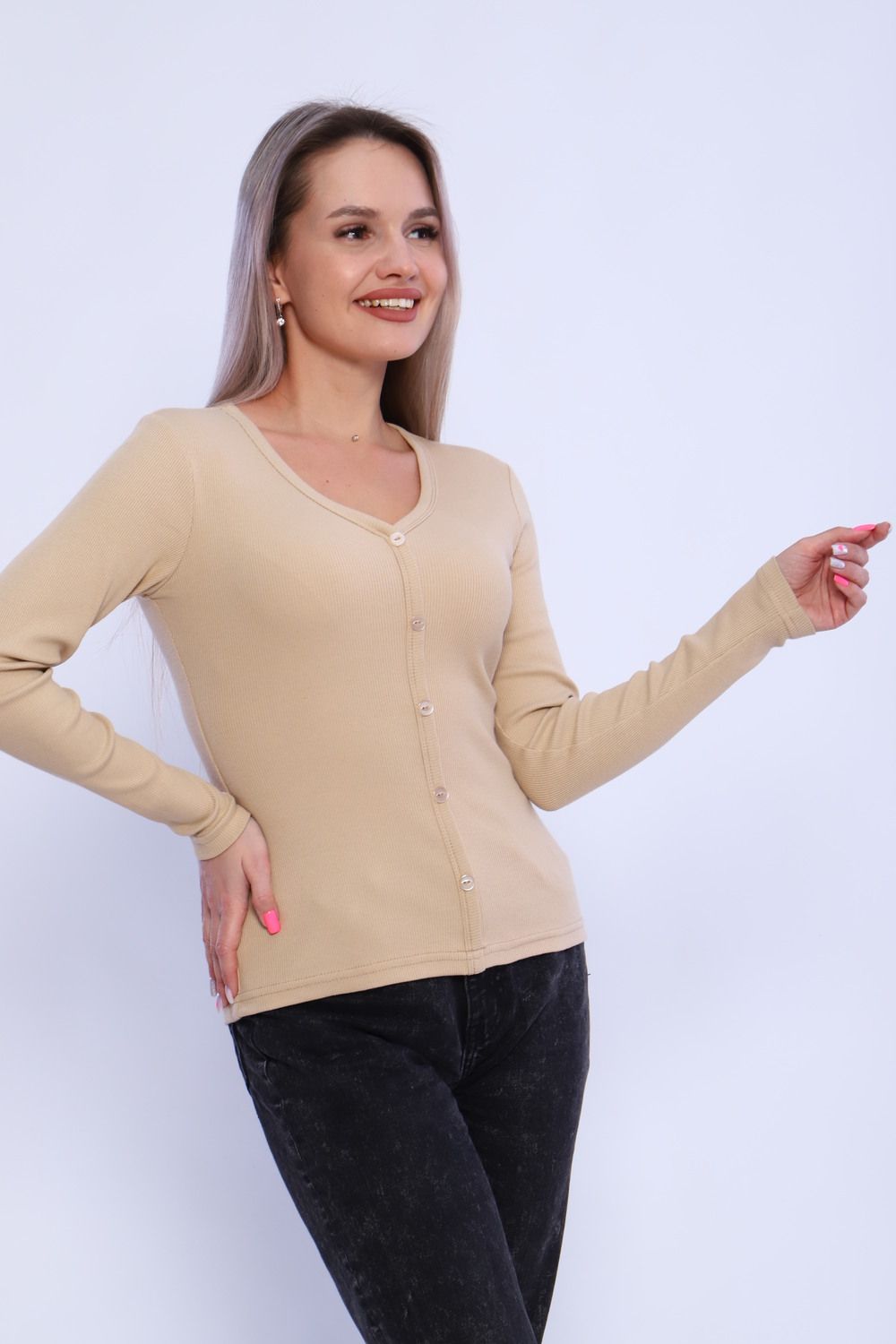 Лонгслив женский приталенный из кашкорсе с декоративными пуговицами (лонгслив не расстёгивается). Ворот V-образный, обработан окантовкой, переходящей вниз вдоль изделия, рукава и низ изделия подогнуты на плоскошовной машине. Легкий в уходе. Идеальный вариант для повседневной носки. Замеры произведены за минусом облегания. Ткань имеет эластановые нити и замеры могут немного отличаться.