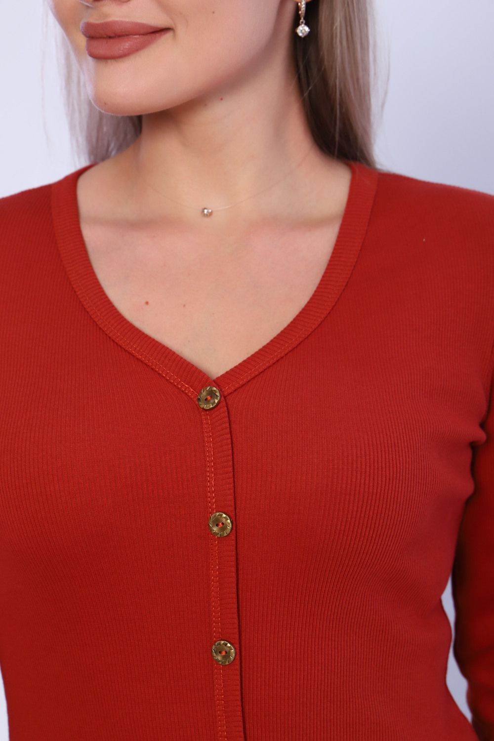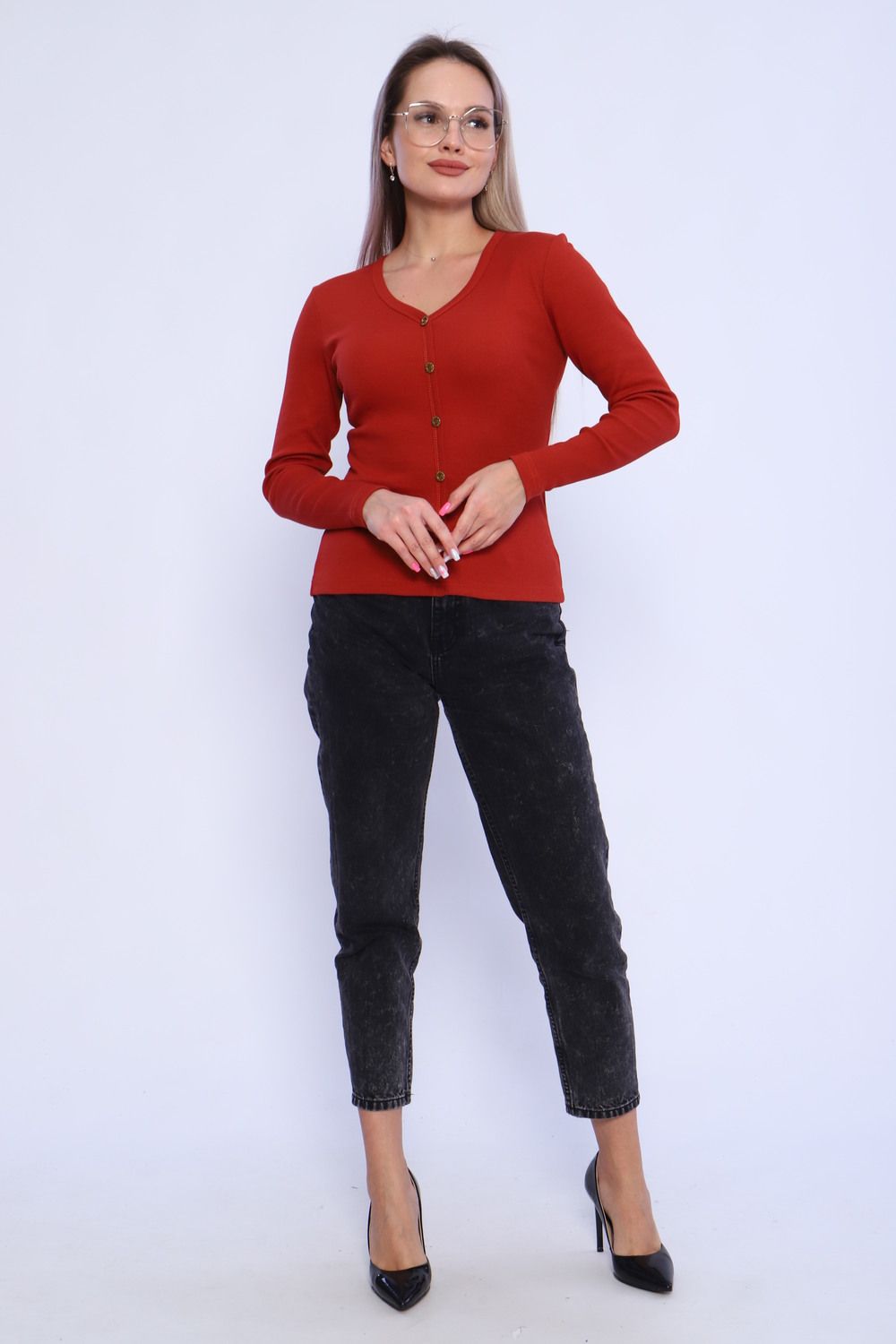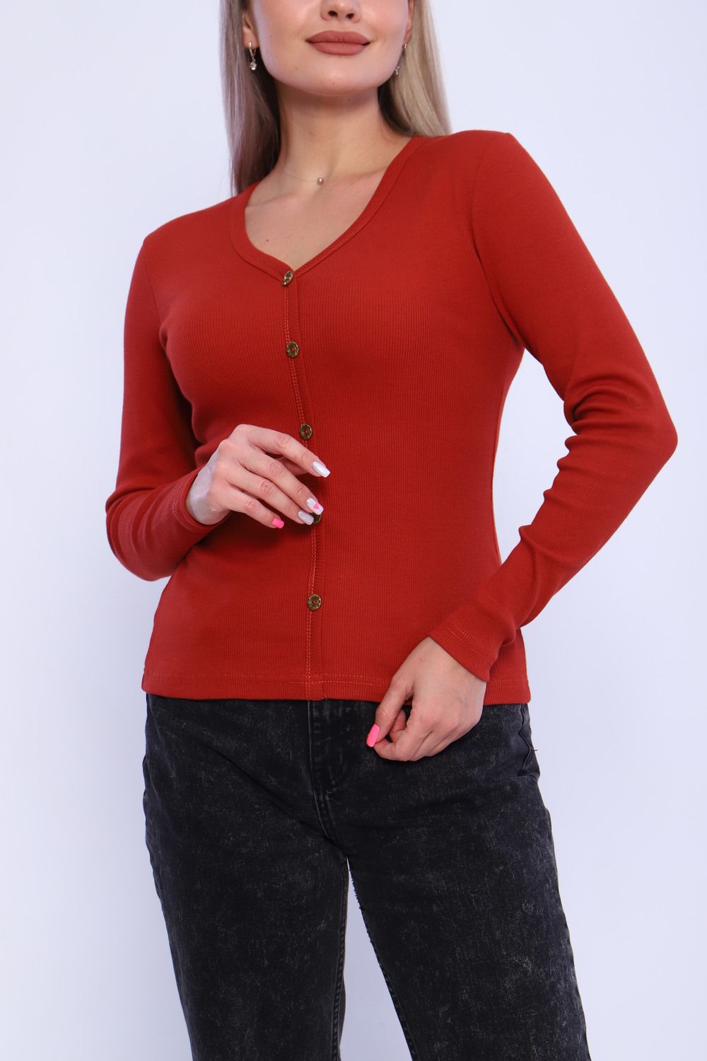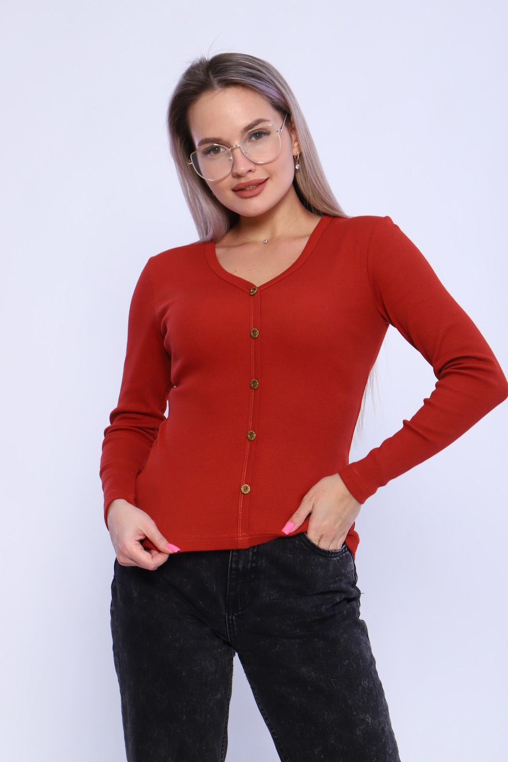 Лонгслив женский приталенный из кашкорсе с декоративными пуговицами (лонгслив не расстёгивается). Ворот V-образный, обработан окантовкой, переходящей вниз вдоль изделия, рукава и низ изделия подогнуты на плоскошовной машине. Легкий в уходе. Идеальный вариант для повседневной носки. Замеры произведены за минусом облегания. Ткань имеет эластановые нити и замеры могут немного отличаться.