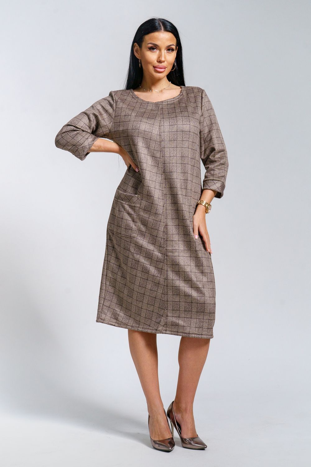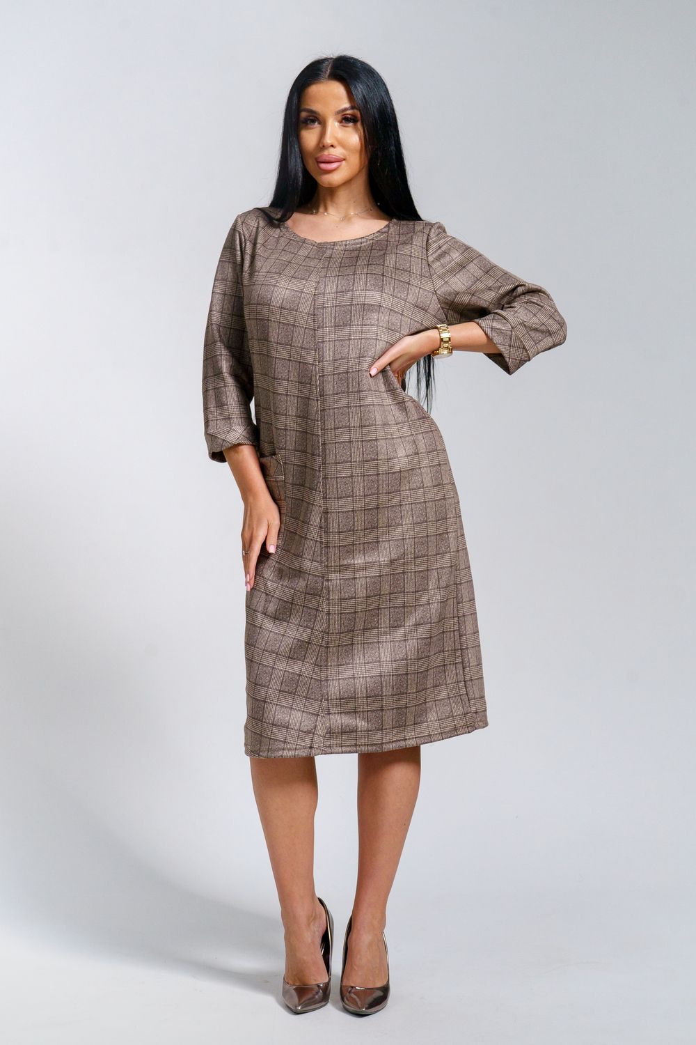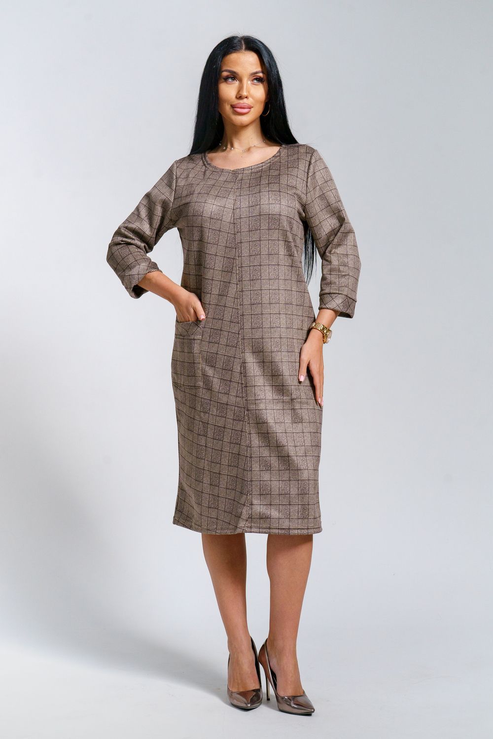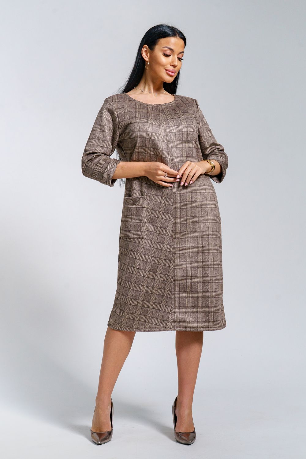 Платье женское офисное Состав: 30% микрофибра, 65% полиэстер, 5% лайкра Изысканное женское платье свободного покроя с рукавом средней длины, с оригинальным сочетанием направленности рисунка.