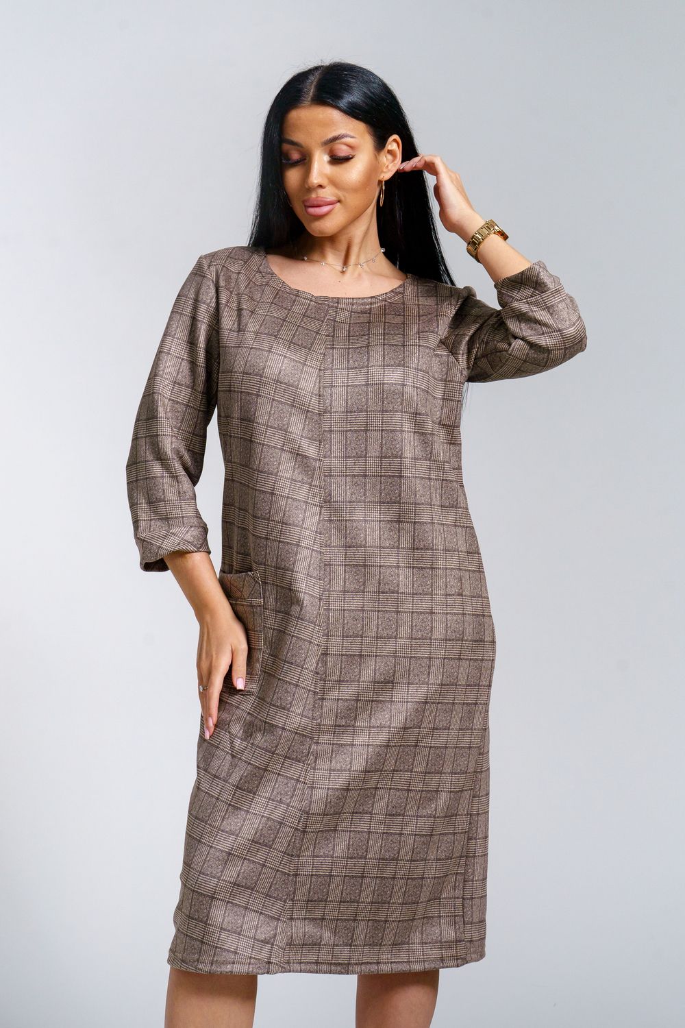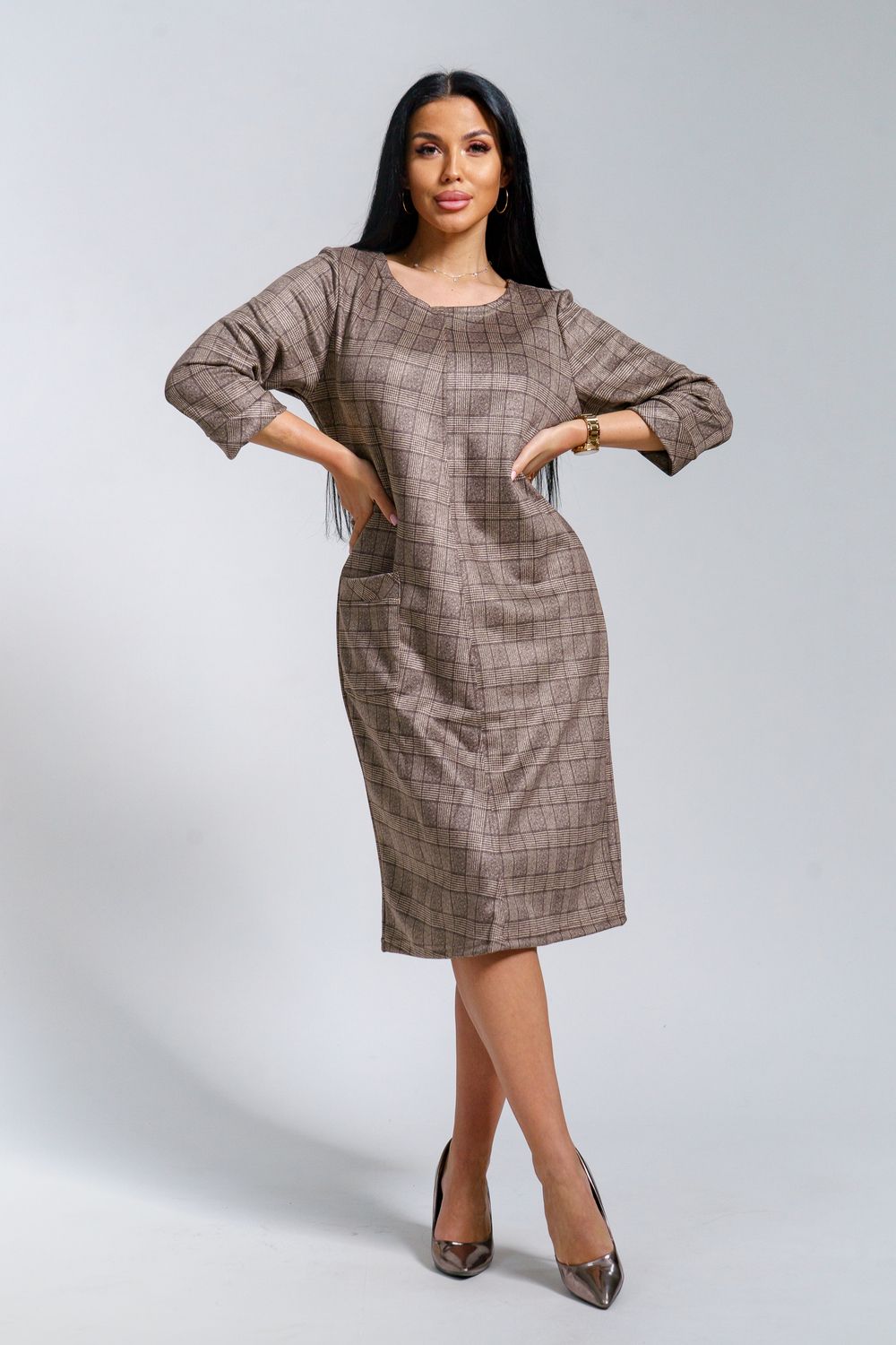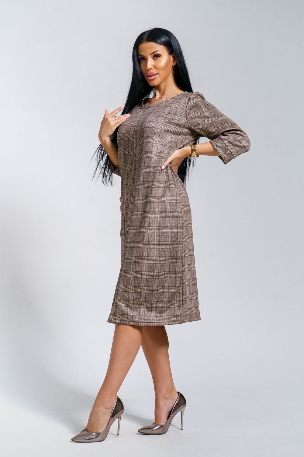 Платье женское офисное Состав: 30% микрофибра, 65% полиэстер, 5% лайкра Изысканное женское платье свободного покроя с рукавом средней длины, с оригинальным сочетанием направленности рисунка.