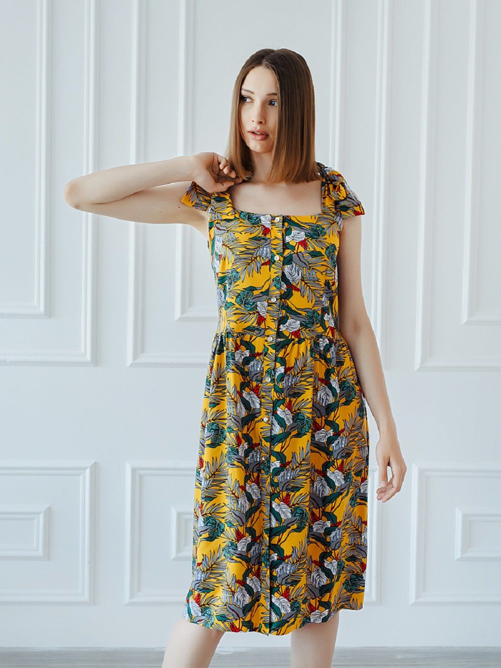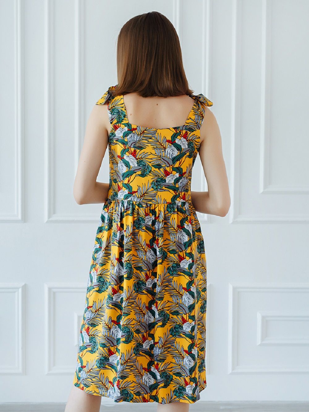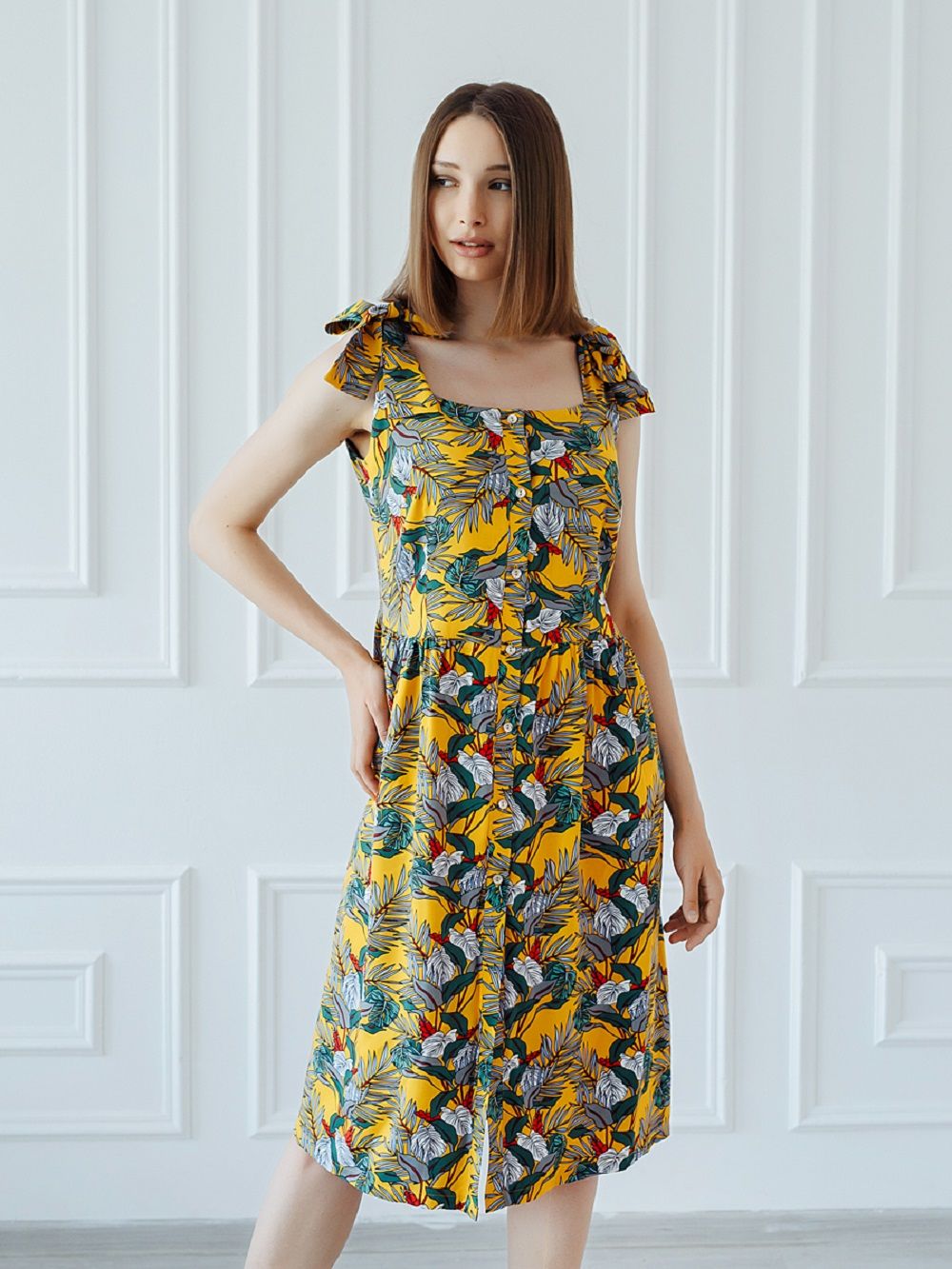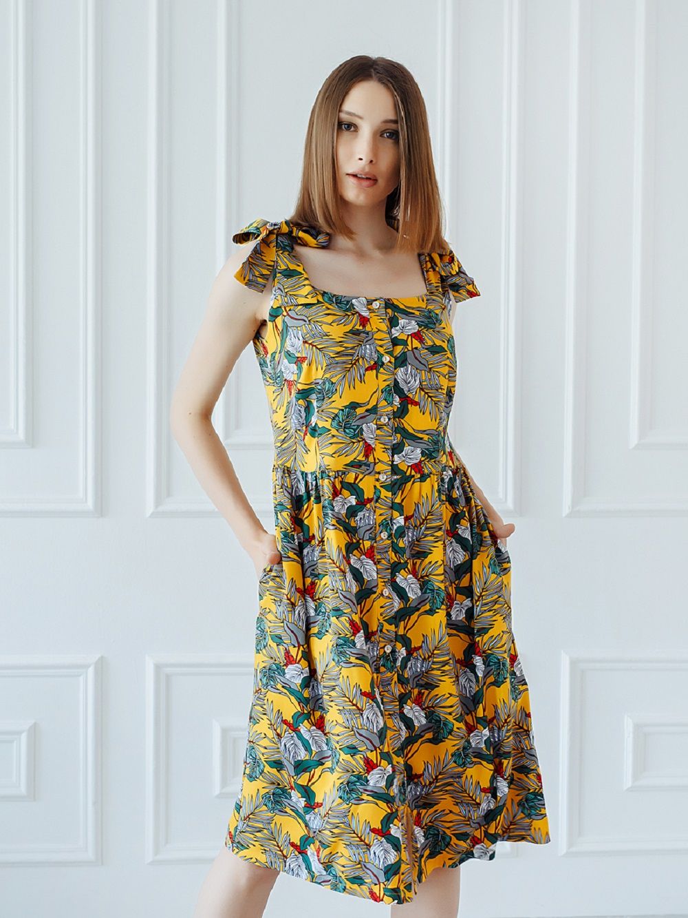 Сарафан женский летний из штапеля полуприлегающего силуэта длиною до колена с застежкой на пуговицы. По линии талии расположена легкая сборка. Бретели сарафана декорируются в банты. В боковых швах расположены карманы. Платье летнее женское из тонкой вискозы - штапель. Штапель это натуральный, легкий и дышащий материал. В таком платье Вы будите чувствовать себя комфортно даже в самый жаркий летний день. Летнее платье универсально, Вы можете создать легкий спортивный образ с кедами или романтичный, надев босоножки на каблуке. Дополните платье различными аксессуарами (серьги, сумочки, ремешки, бусы) и можете собрать вечерний образ. Стильное, модное, романтичное отлично подойдет для фотосессии. Платье из штапеля можно взять с собой на отдых или использовать как домашнее платье. Подойдет как стройным девушкам, так и дамам с пышными формами. Благодаря крою подойдет беременным и кормящим, а натуральная ткань не вызовет дискомфорта. Обращаем Ваше внимание, что платье выполнено из натуральной ткани и может дать усадку от 4 до 7 %, учитывайте это при заказе изделия. Платье из штапеля будет отличным подарком девушке, сестре, подруге, маме, племяннице и любимой женщине на день рождения, юбилей, годовщину свадьбы, новый год или просто без всякого повода.