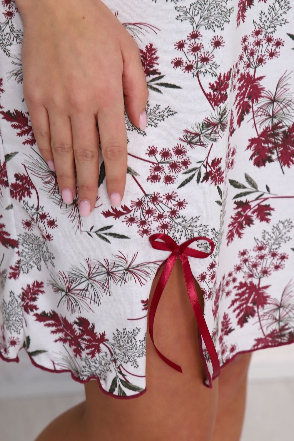 Сорочка домашняя хлопковая с коротким рукавом. Круглая горловина, небольшой разрез на бедре и декоративный бантик.