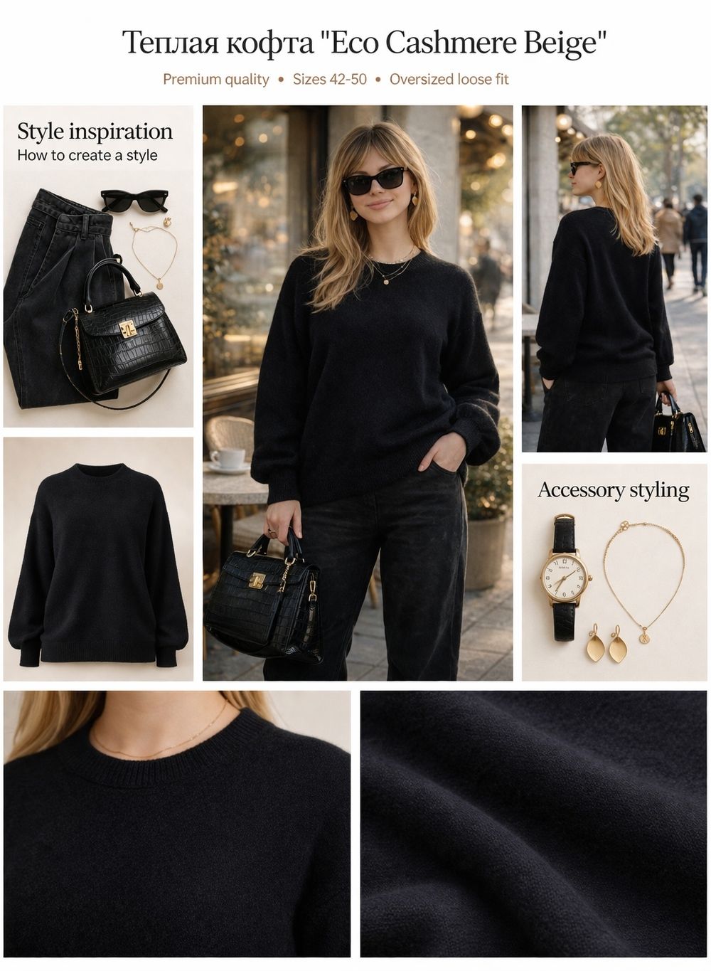 Джемпер оверсайз с рукавом-фонарик "Eco Cashmere Beige" арт. 2701 - джемпер из качественного материала «эко-кашемир» — мягкой акриловой пряжи премиум-класса, которая по своим тактильным ощущениям и внешнему виду практически неотличима от натурального кашемира. Эта модель идеально сочетает в себе комфорт, стиль и доступную роскошь. Особого внимания заслуживает бежевый цвет — универсальный, благородный оттенок, который стал настоящей классикой современного гардероба. Теплый бежевый тон прекрасно сочетается с любыми цветами: от классического черного и белого до ярких акцентных оттенков. Он освежает образ, добавляет ему мягкости и женственности, подходит абсолютно всем типам внешности. Главная изюминка модели — рукав-фонарик объемного кроя. Такая деталь придает джемперу романтичности и игривости, создавая актуальный силуэт в стиле современной классики. Объемные рукава собраны на эластичные манжеты с резинкой, что обеспечивает удобную посадку и комфорт в носке. Спущенная линия плеча и свободный крой по корпусу создают расслабленный, непринужденный образ. Круглый вырез горловины оформлен аккуратной резинкой, которая хорошо держит форму и не растягивается. По нижнему краю изделия также расположена эластичная резинка, обеспечивающая идеальную посадку. Материал «эко-кашемир» — это современная альтернатива натуральному кашемиру. Нежная, шелковистая пряжа мягкая на ощупь, абсолютно не колется и не вызывает раздражения даже у обладательниц чувствительной кожи. Джемпер можно смело носить на голое тело, наслаждаясь приятными тактильными ощущениями. Он сохраняет все преимущества: мягкость, тепло и уют, легче в уходе и долговечнее. Размер: единый 42-50. Универсальный оверсайз крой прекрасно смотрится на разных типах фигуры, создавая модный силуэт. Модель доступна в пяти актуальных оттенках: Светло-бежевый — нежный, воздушный оттенок, максимально приближенный к натуральным тонам Молочный — теплый кремовый цвет с мягким подтоном, идеальная альтернатива белому Бежевый — классический благородный оттенок, основа базового гардероба Серый — универсальный базовый тон, практичный и стильный одновременно Черный — вечная классика, которая никогда не выходит из моды Идеальный выбор для повседневной носки, работы, прогулок. Сочетается с джинсами, брюками, юбками любой длины. Создавайте стильные образы в стилях casual, romantic, feminine!